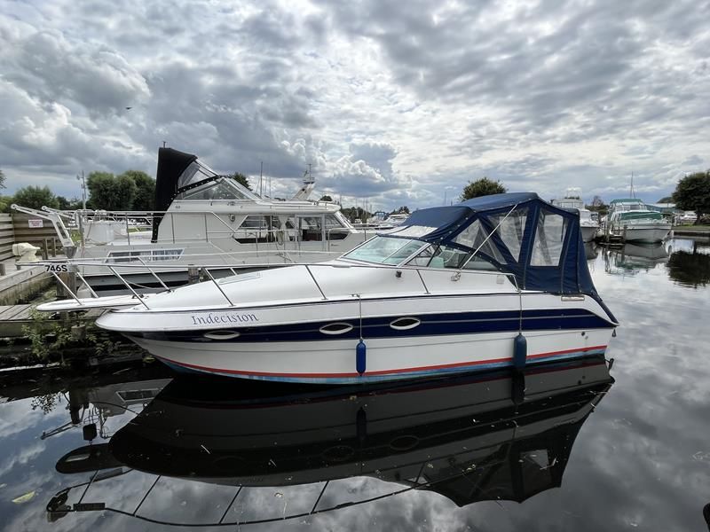 Larson San Marino – 1991 – 1 x Volvo 3.0GL 205hp petrol engine through stern drive. 4 berth accommodation with a toilet and shower compartment. Specification to include solar charger, holding tank, battery charger, shore power, immersion heater, trim tabs, BSC 09/26, large cushioned cockpit with transom door and bathing platform. A compact yet spacious sports cruiser with a large sociable cockpit, ideal for entertaining or family cruising.