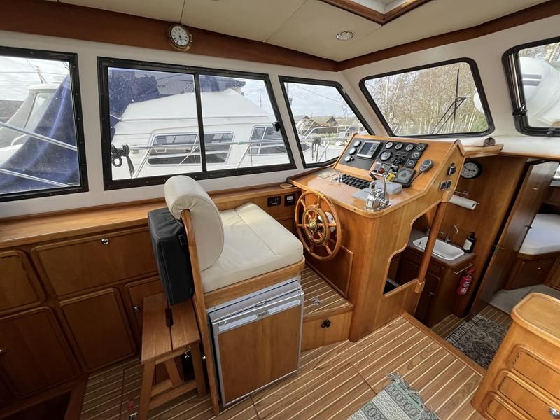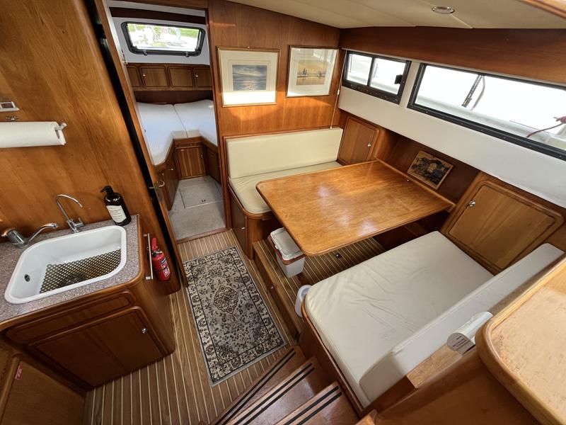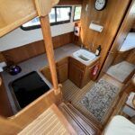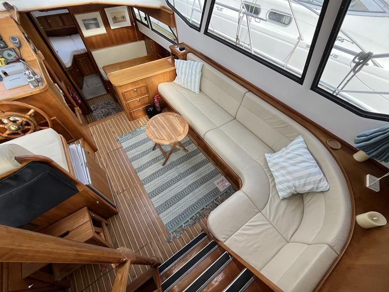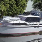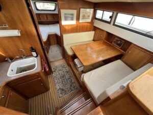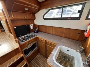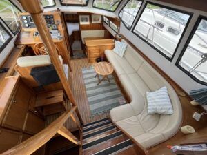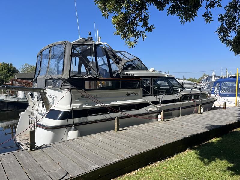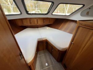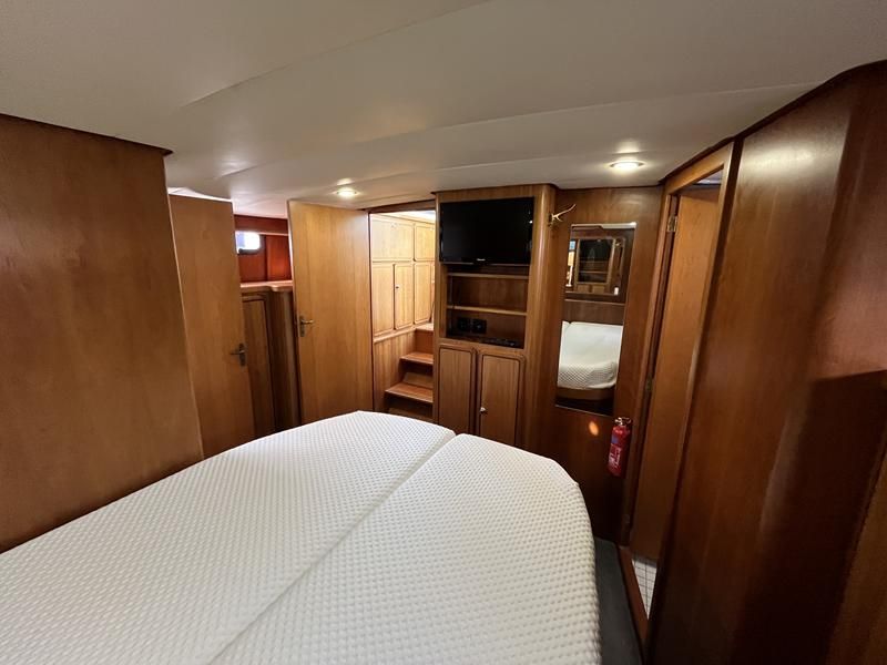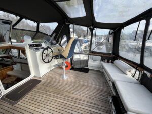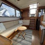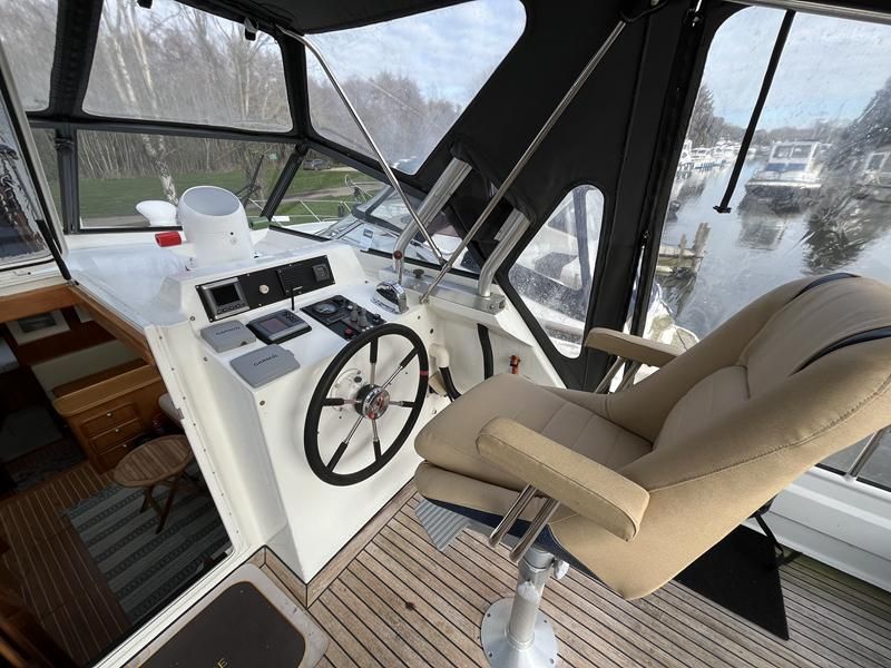 Linssen 41 SC – 1995 – Powered by a Volvo TAMD-41 H-A 145hp diesel engine. Cherry wood interior with 6 berth accommodation over 2 cabins and saloon with two en-suite toilet and shower facilities. Specification to include bow and stern thrusters with remote, Webasto warm air heating, shore power, battery charger, immersion heater, holding tank, Garmin GPS & VHF, teak decks, folding arch and screens for increased inland access. BSC07/2028. A spacious and well equipped cruiser, ideal for exploring the inland waterways or European canals.