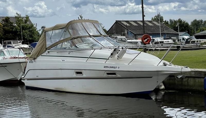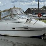 MAXUM 2400 SCR – Circa 1997 – Powered by a single Mercruiser petrol through a sterndrive – 4 berth accommodation with toilet and shower – Specification to include; Shore power supply with battery charger and 240v sockets, electric windlass, trim tabs, VHF, refrigerator, microwave and hob. A stylish sports cruiser with low air draft for increased inland access.