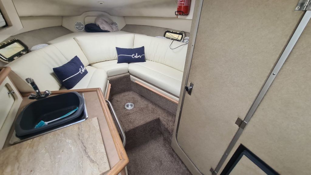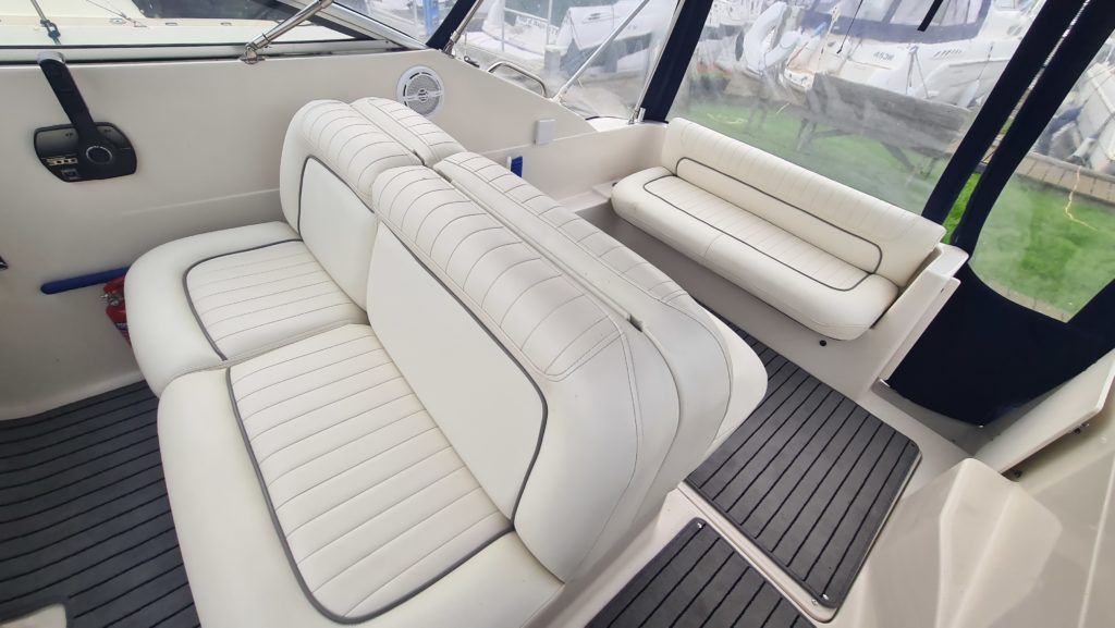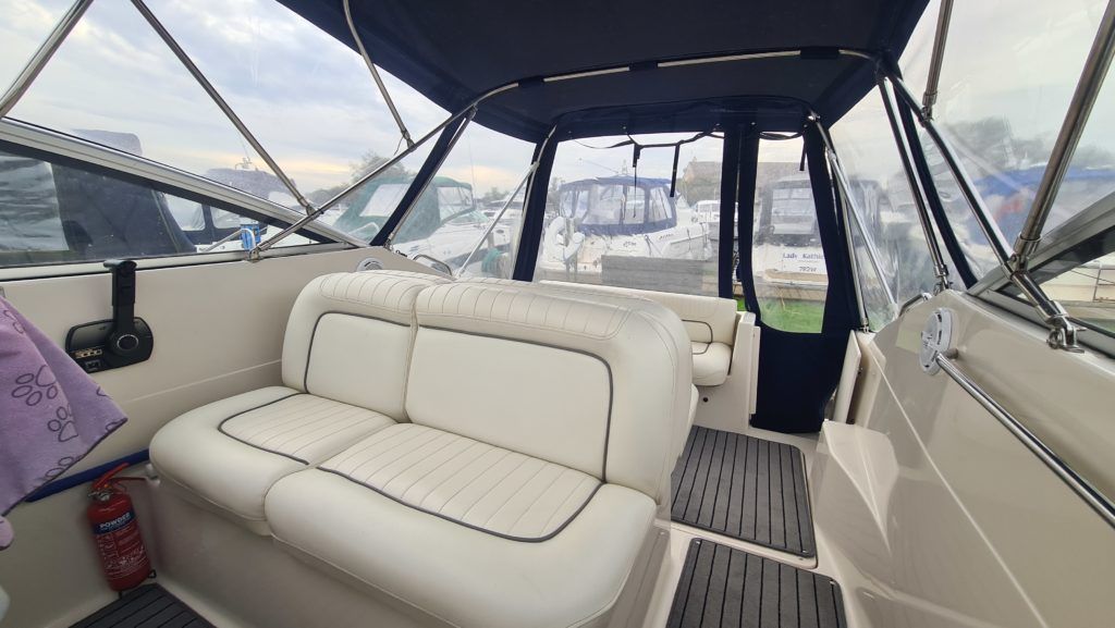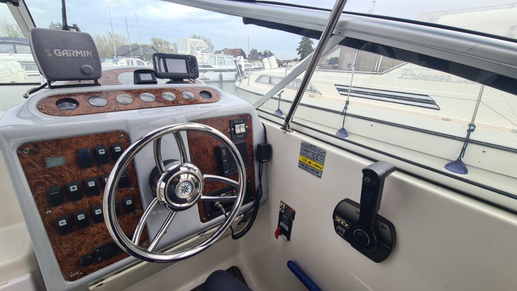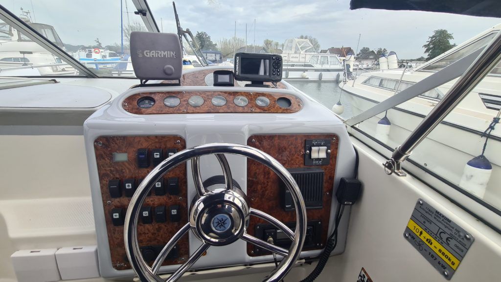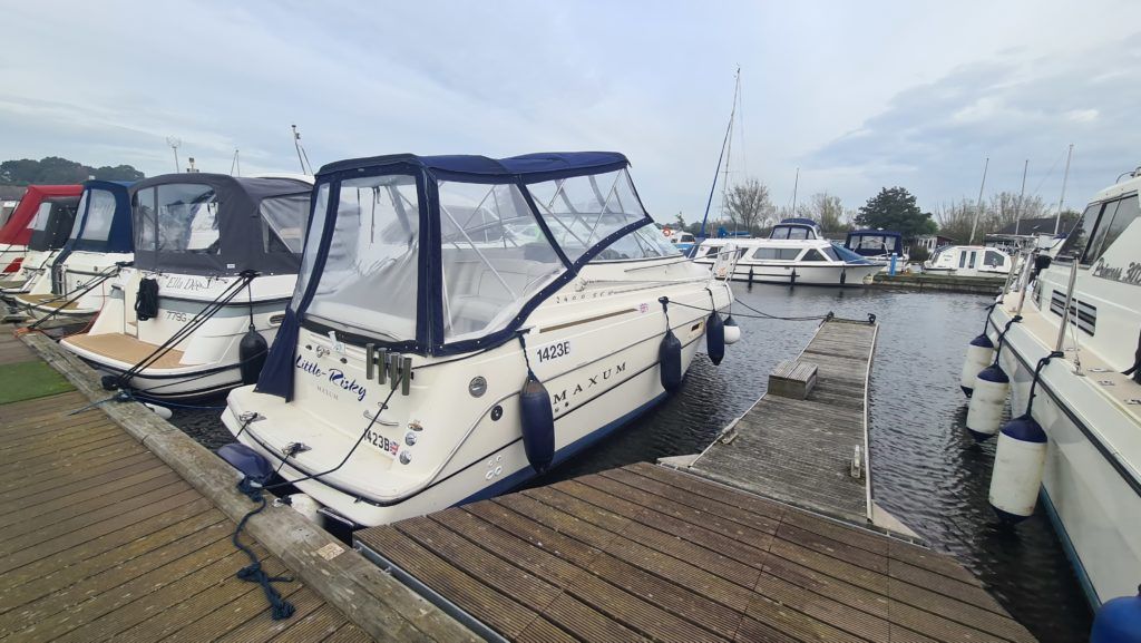 MAXUM 2400 SCR – Circa 1998 – Single Mercruiser 250hp petrol through a sterndrive – 4 berth accommodation with toilet and shower – Specification to include; Shore power,  supply with battery charger and 240v sockets, microwave, fridge , VHF, Garmin GPS Plotter, Lawrence fish finder .  A stylish sports cruiser with low air draft for increased inland access.