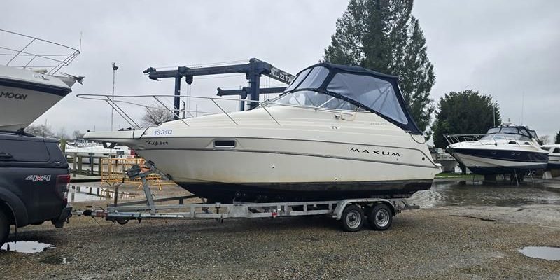 Maxum 2400 SCR – 1999 – Powered by a Mercruiser 5.0L 220hp petrol engine. 4 berth accommodation with a toilet and shower compartment. Specification to include; immersion heater, holding tank, inverter, shore power, battery charger, warm air heating, air conditioning, full cockpit canopy, electric windlass, sportpilot, trim tabs and more! Road trailer included, BSC 2025, Engines serviced Nov 23, New carburetor 02/24. A well-specified sports cruiser featuring a low air draft and the added convenience of a road trailer.