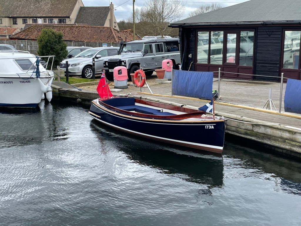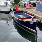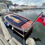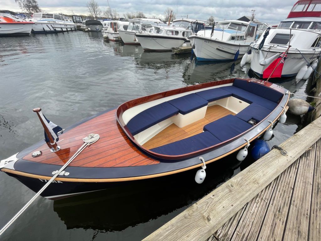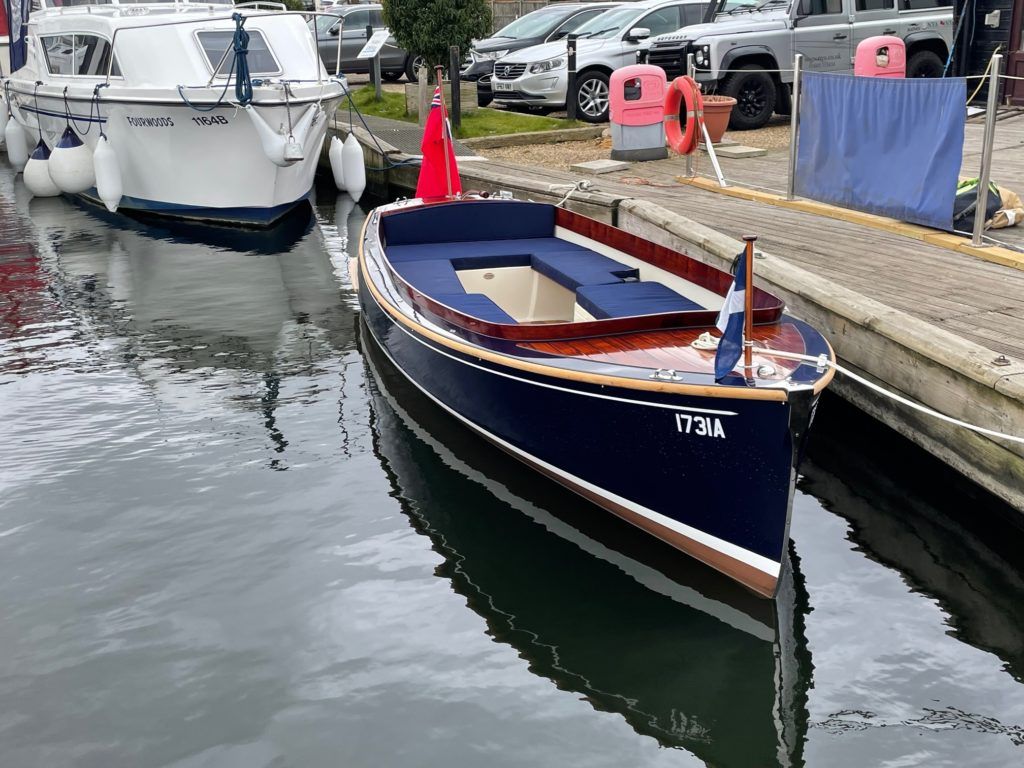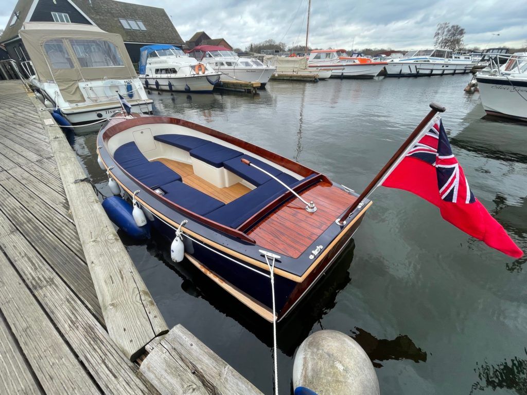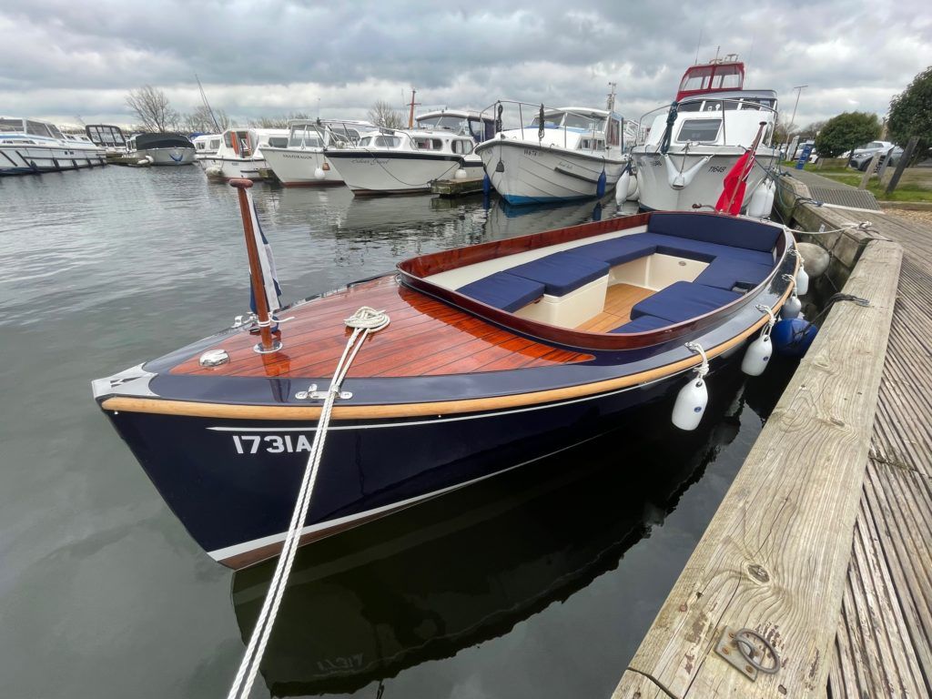 MAYFLY 16 ELECTRIC LAUNCH – Built 2021 by EC Landamore, with a 2kw electric motor only run 3 hours from new, tiller steering, batteries, onboard charger, cushioned seating, chrome deck fittings, 12v horn and bilge pump. Beautiful traditional looking launch handcrafted mahogany decks perfect for day cruising on inland waterways.
