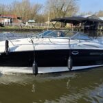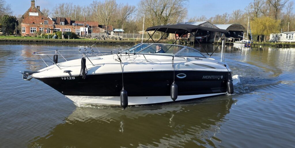 Monterey 245 CR – 2004- Powered by a Yanmar 4LHA-DTZP 240hp diesel engine through Bravo 1 stern drive. 4 berth accommodation with a separate toilet and shower. Well specified including: Bow thruster with remote, warm air heating, holding tank, plotter, trim tabs, VHF, shore power, battery charger, water heater, black gel stripe. An eye-catching sports cruiser featuring a generous specification, spacious cockpit, and the freedom to explore inland and coastal waters.
