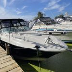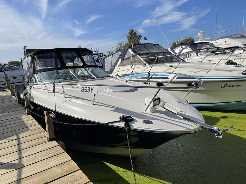 Monterey 250 – 2005 – powered by a single Yanmar 240hp diesel engine through a sterndrive. 4 berths with 1 toilet/shower. Specification to include shore power, battery charger, 240 sockets, trim tabs, electric anchor winch, Standard Horizon GPS, VHF radio. An impressive amount of interior and social cockpit space, set off by an eye catching black gel striped hull.