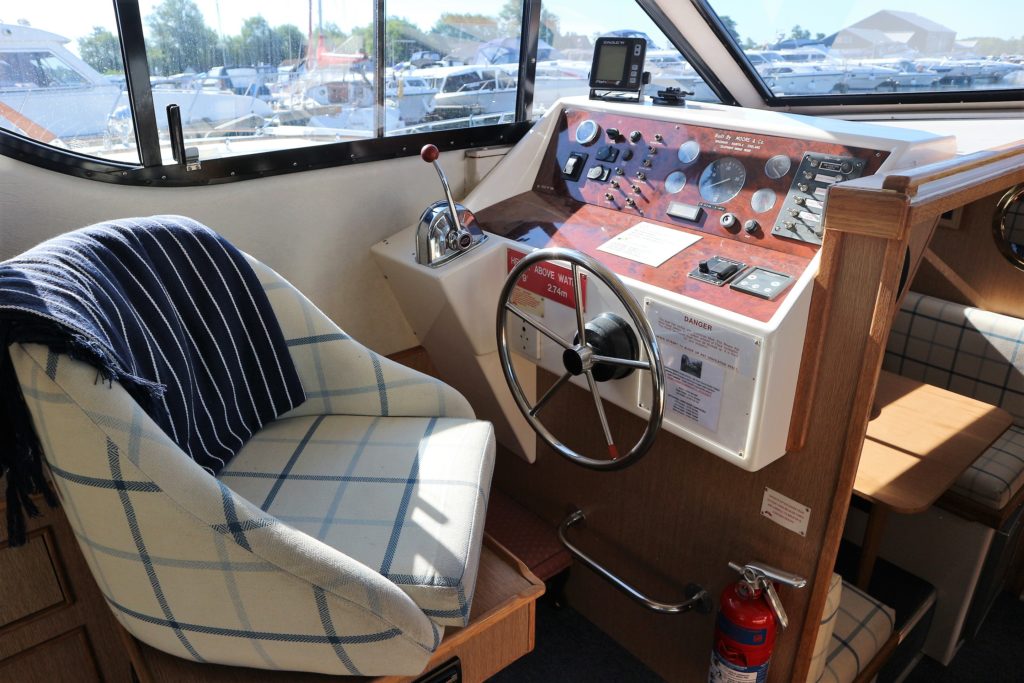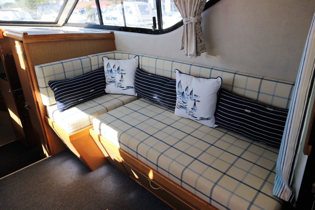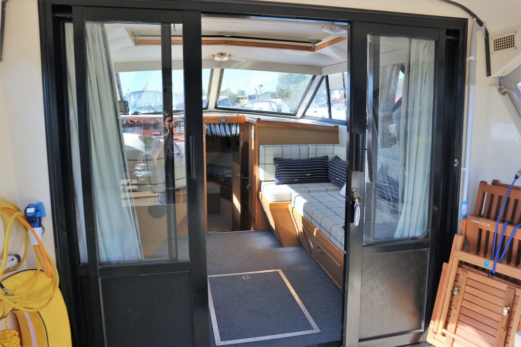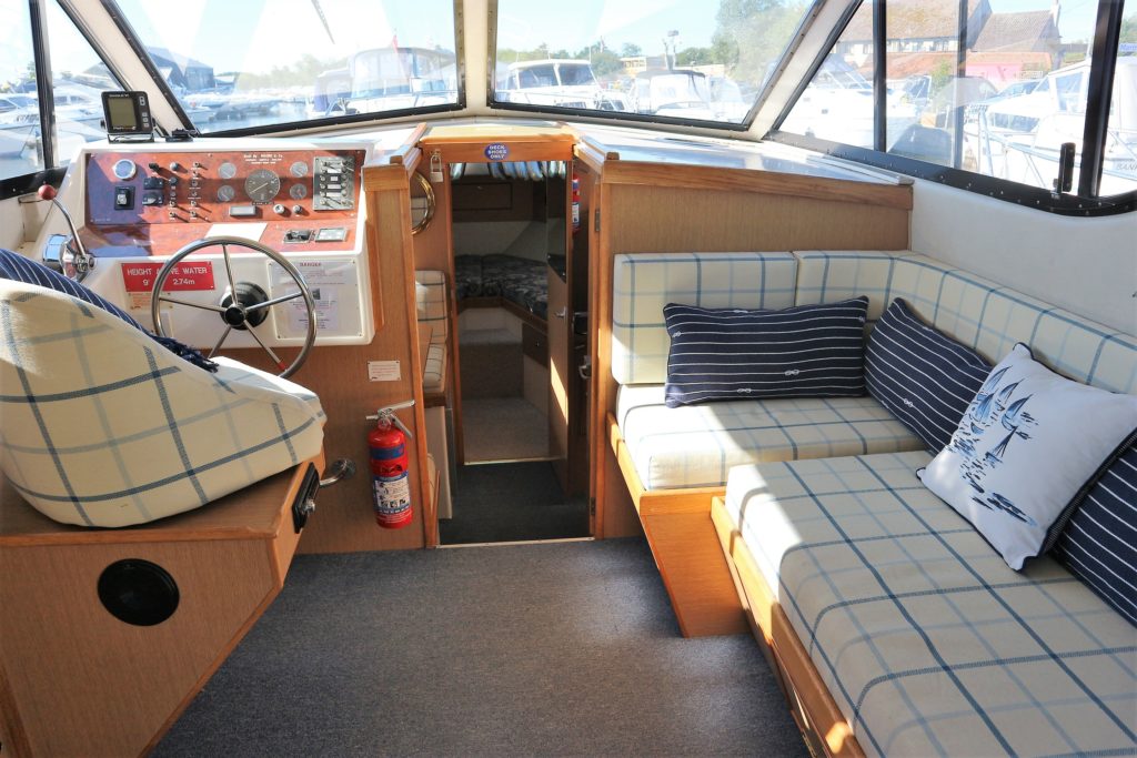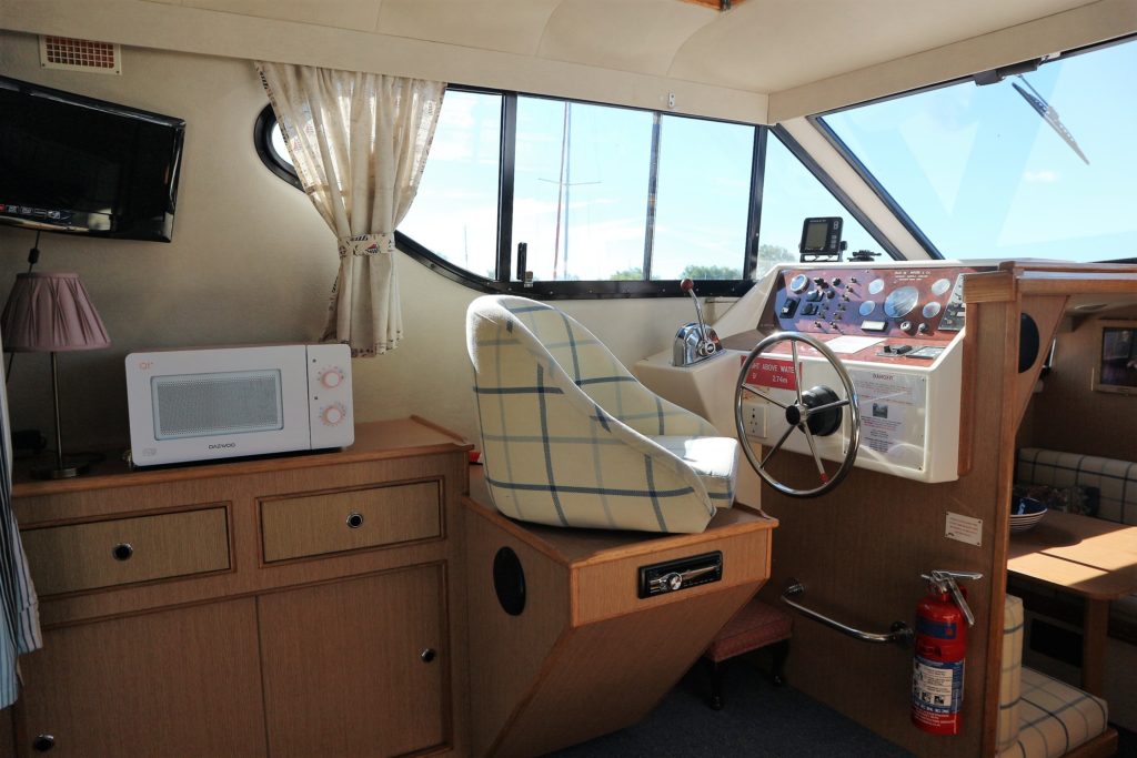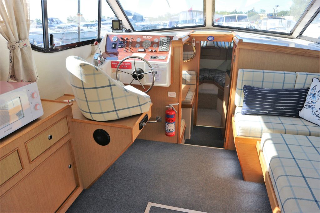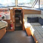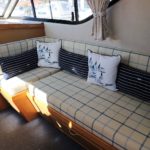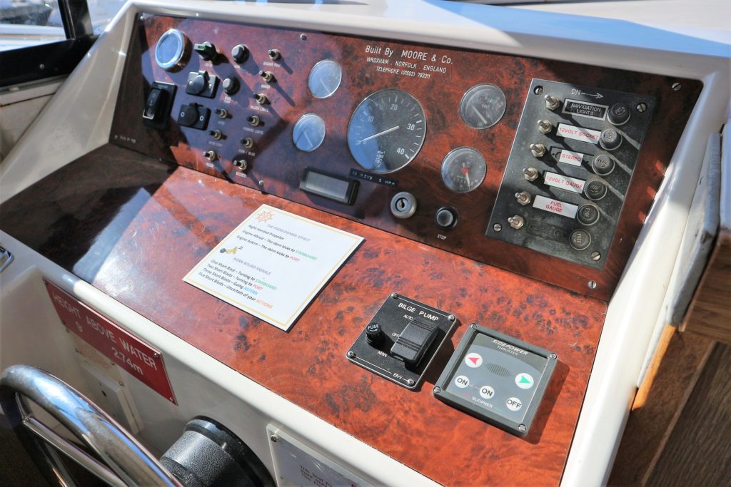 MOORE & Co. PRINCESS 30 DS – 1994 – Powered by a single Nanni 43hp diesel engine. 4 berth accommodation plus additional small double in the saloon. 1 electric toilet/shower compartment. Specification to include bow thruster, electric windlass, warm air heating, shore power, battery charger and more. BSC 03/19. Having undergone much recent improvement this is a tidy well equipped sedan style river cruiser.