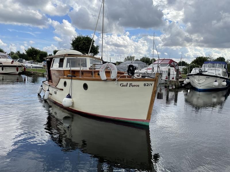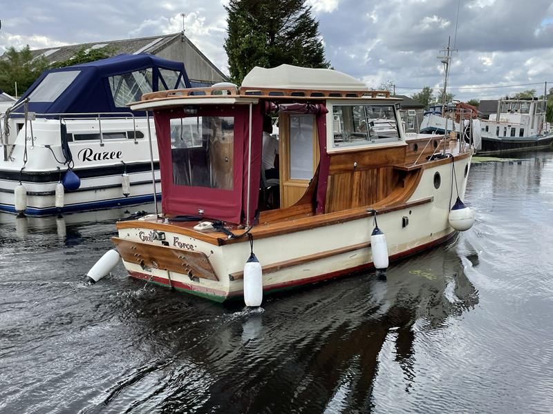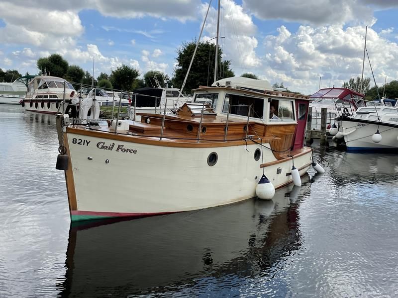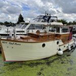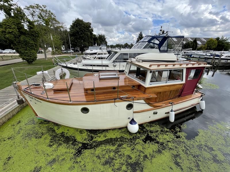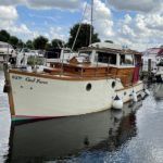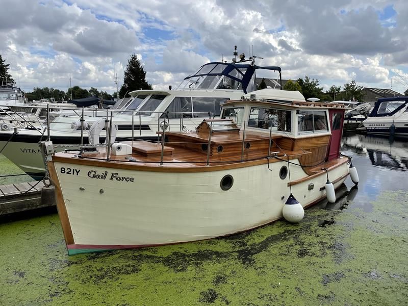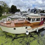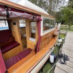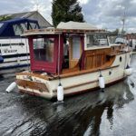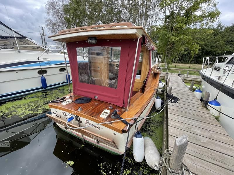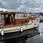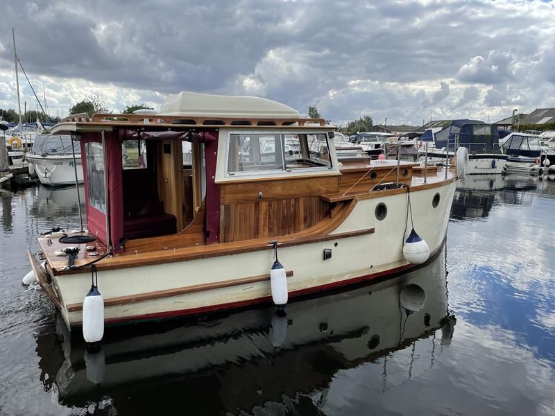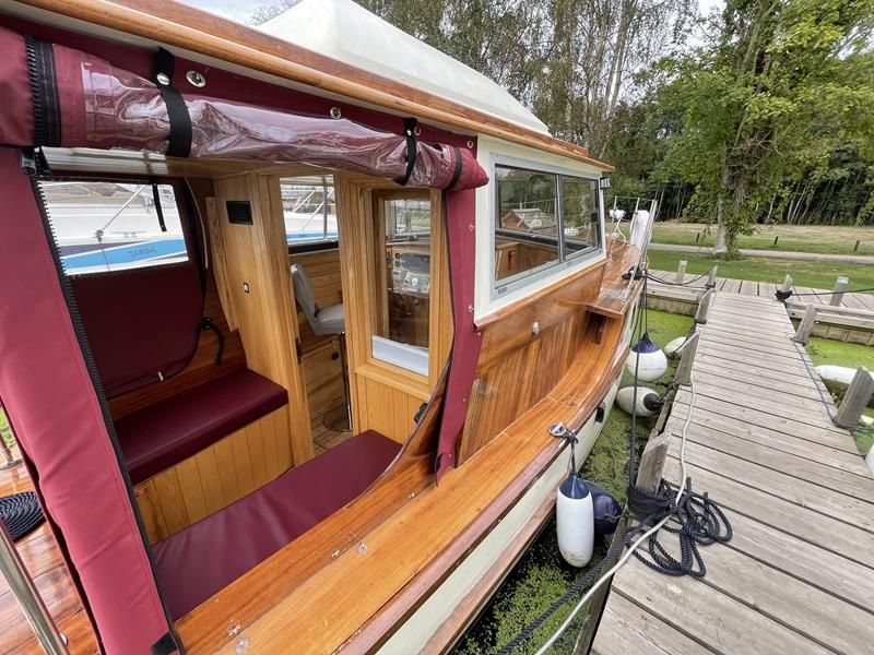 Thornycroft Boat Class – Circa 1930s – Powered by a Nanni N4.38 38hp diesel engine through shaft commissioned 2021 with 65 hours use. 2 + 2 berth accommodation with 1 x toilet/shower compartment. Galley with 4 burner gas hob, oven and grill, fridge, sink, and oak surfaces. Specification including shore power, battery charger, immersion, inverter, electric toilet, BSC 07/25, bespoke full cover, new upholsteries and canopy. A unique motor cruiser which has undergone a full restoration under her current ownership. Must be viewed to appreciate the quality of the fit out and finish.