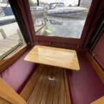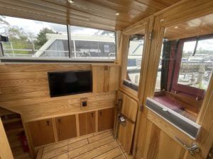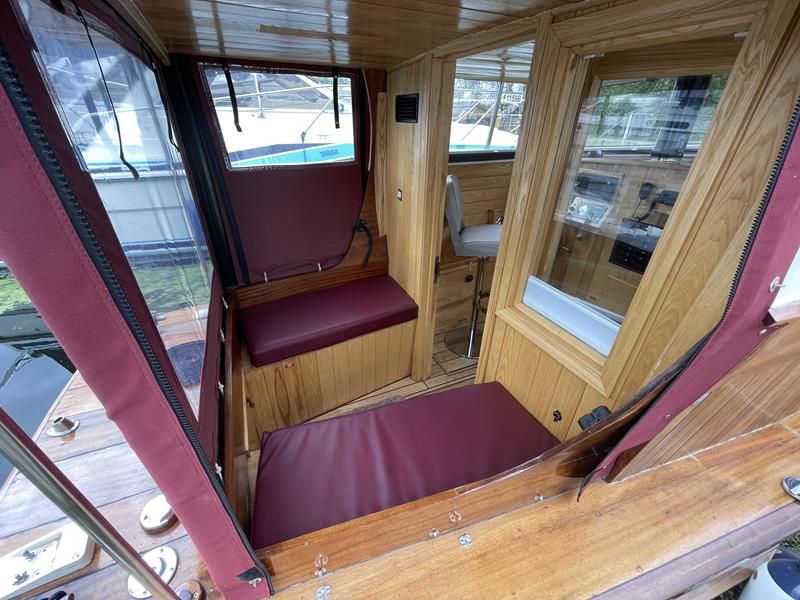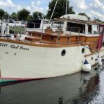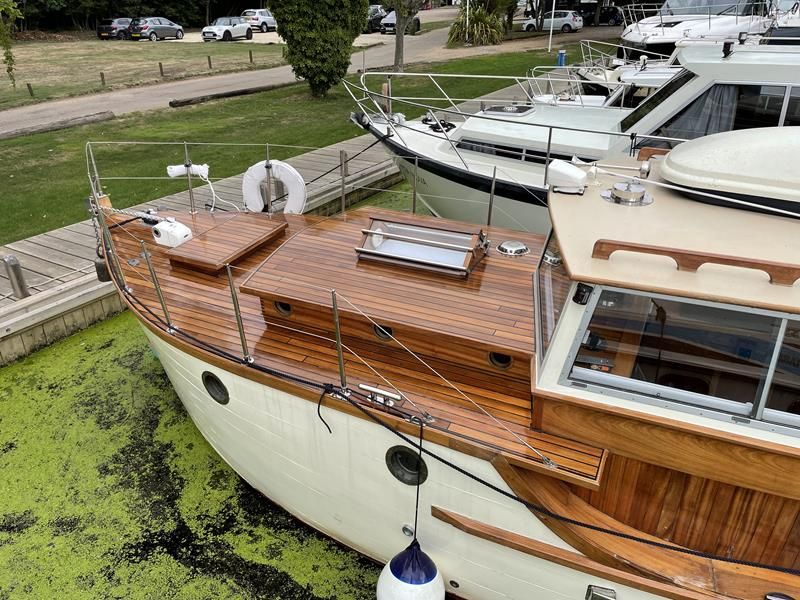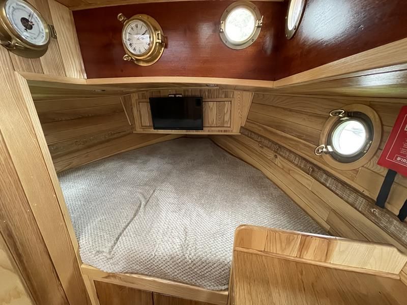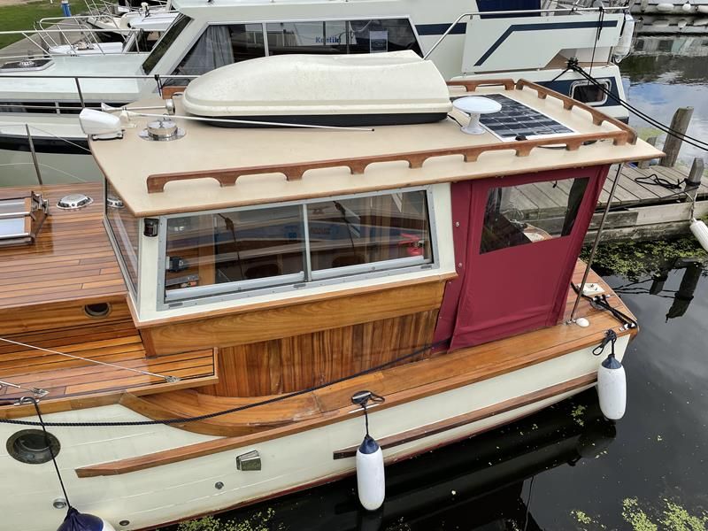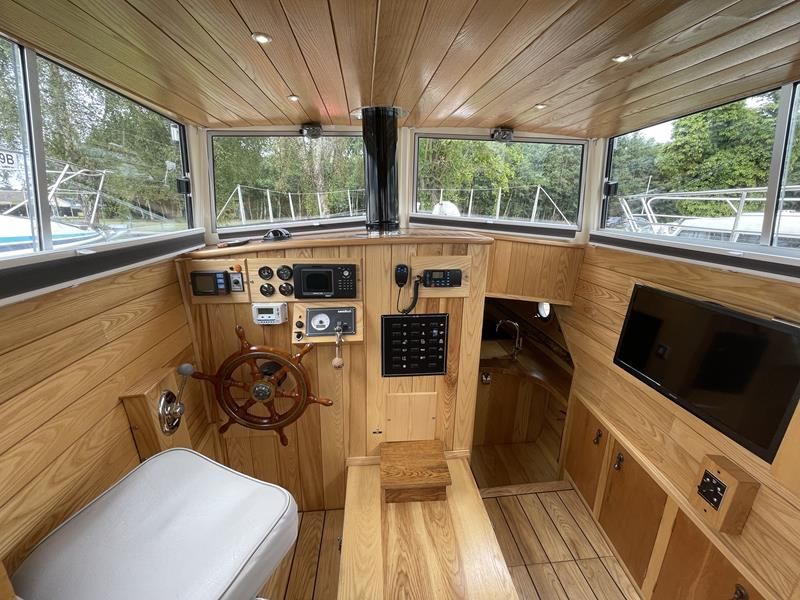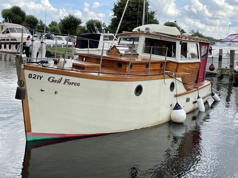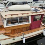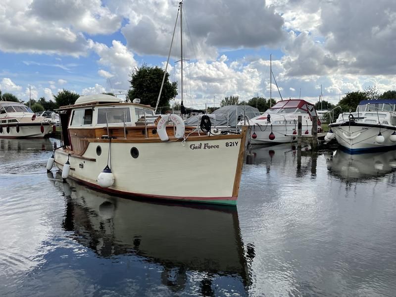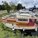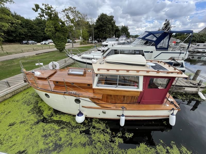 Thornycroft Boat Class – Circa 1930s – Powered by a Nanni N4.38 38hp diesel engine through shaft commissioned 2021 with 65 hours use. 2 + 2 berth accommodation with 1 x toilet/shower compartment. Galley with 4 burner gas hob, oven and grill, fridge, sink, and oak surfaces. Specification including shore power, battery charger, immersion, inverter, electric toilet, BSC 07/25, bespoke full cover, new upholsteries and canopy. A unique motor cruiser which has undergone a full restoration under her current ownership. Must be viewed to appreciate the quality of the fit out and finish.