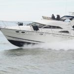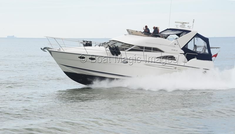 Pearl 45 – 2000 – Powered by 2 x Caterpillar 3126 Diesel engines through shafts. 6 berth accommodation over 3 cabins ( 2 island double berths and 1 x bunks) with 2 x electric toilet/shower compartments. Specification including Bow and Stern thrusters, electric windlass, generator, shore power, battery charger, immersion heater, Eberspacher warm air heating, Raymarine E120 Chart plotter, Ratheon Autopilot, VHF, Synthetic teak bathing platform and cockpit. An Impressive and cavernous Flybridge/aft cabin motor cruiser. Very well presented, offering comfortable accommodation and great entertaining space.