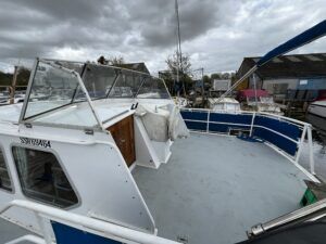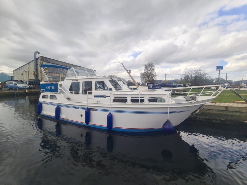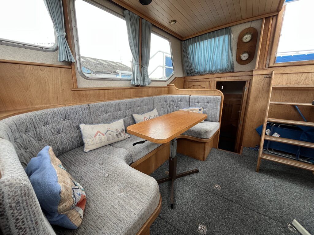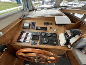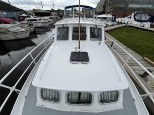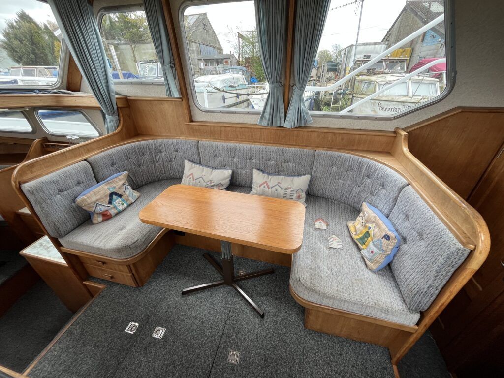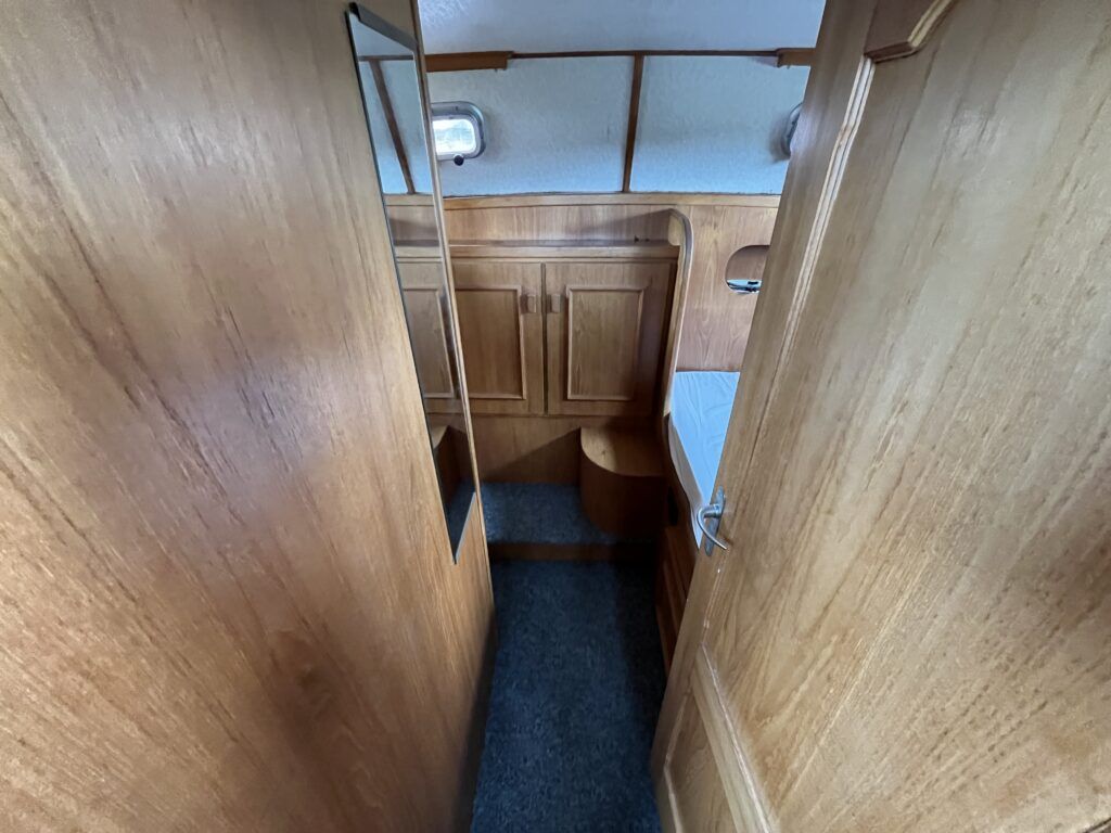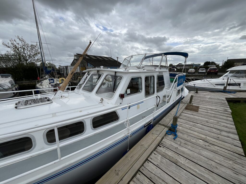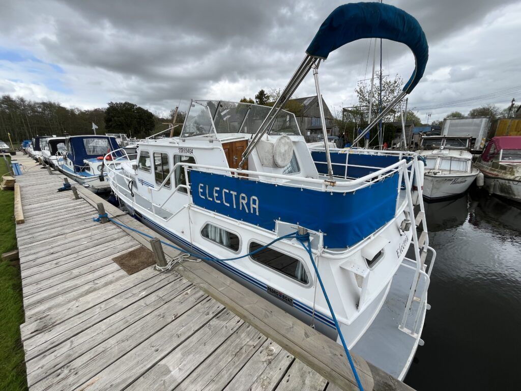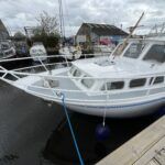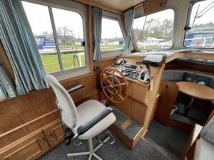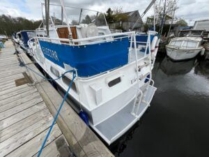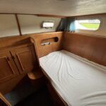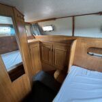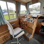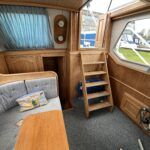 Pedro 30 – 1990 – Powered by a Volvo TMD31 100hp diesel engine through shaft. 4 berth accommodation over cabin and saloon with 1 x toilet/shower compartment. Specification including bow thruster, electric windlass, warm air heating, shore power, battery charger, immersion, VHF, Navman tracker 900, BSC 04/30. A spacious aft cabin dual steer cruiser, ideal for exploring the inland waterways with its low airdraft and comfortable layout.