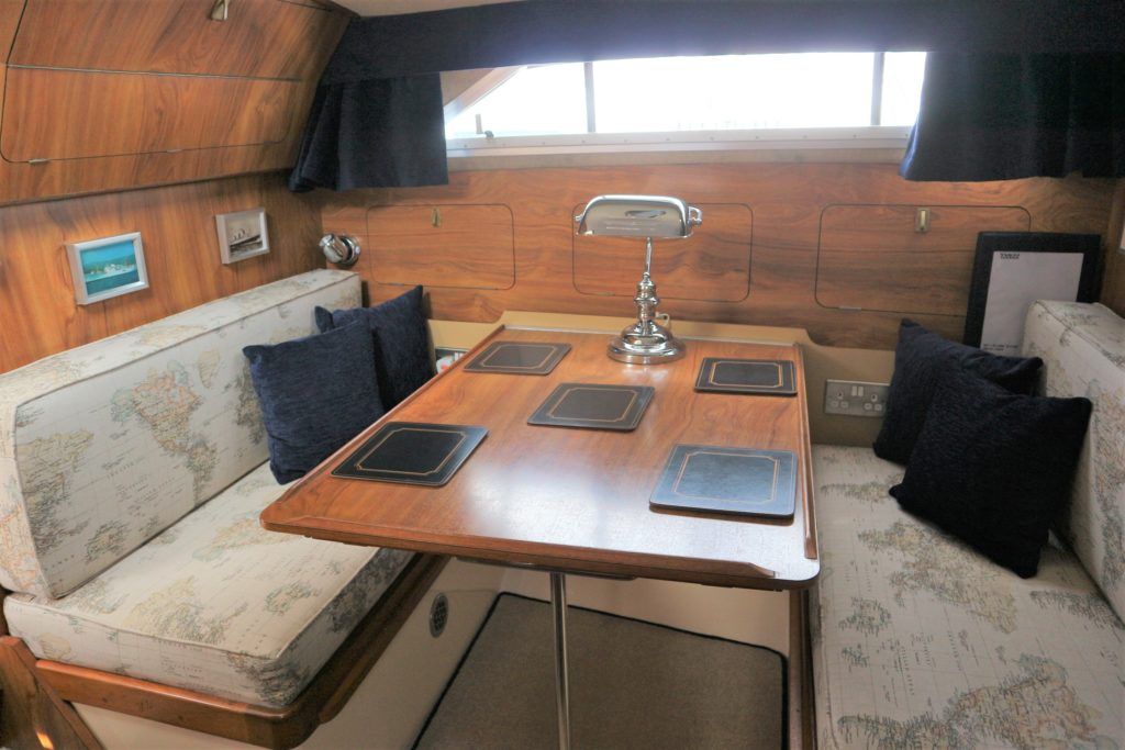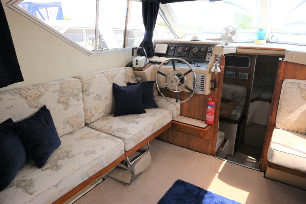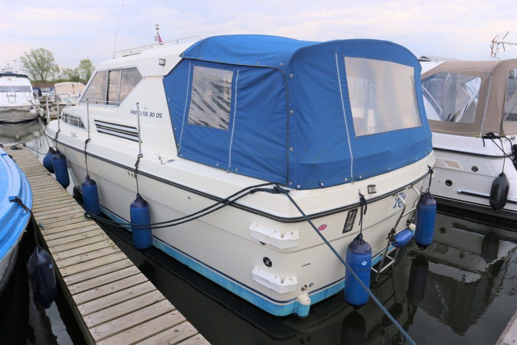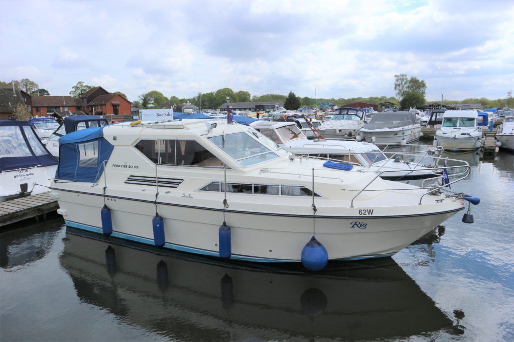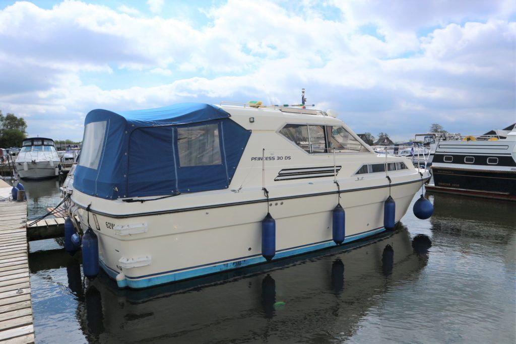 PRINCESS 30 DS – 1982 – Twin Volvo 75hp Diesel engines on shafts. Up to 6 berth accommodation with 1 x electric toilet/shower compartment. Specification including shore power, battery charger, warm air heating, immersion, speed & depth log, anchor winch. BSC 06/23. A very well presented motor cruiser with adaptable sleeping accommodation and the benefit of diesel engines & shaft drive.
