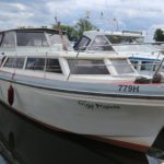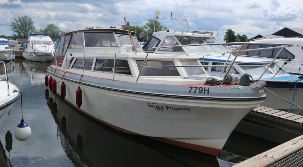 PRINCESS 32 – 1980 – Twin Volvo MD21 75HP Diesel Engines. Five berths with 1 toilet and 1 shower. Shore power, Warm air Heating, Battery charger, Anchor winch, Davits, New Fridge. A spacious boat with a social cockpit, the Princess 32’s are a classic motor cruiser for a family or couple!