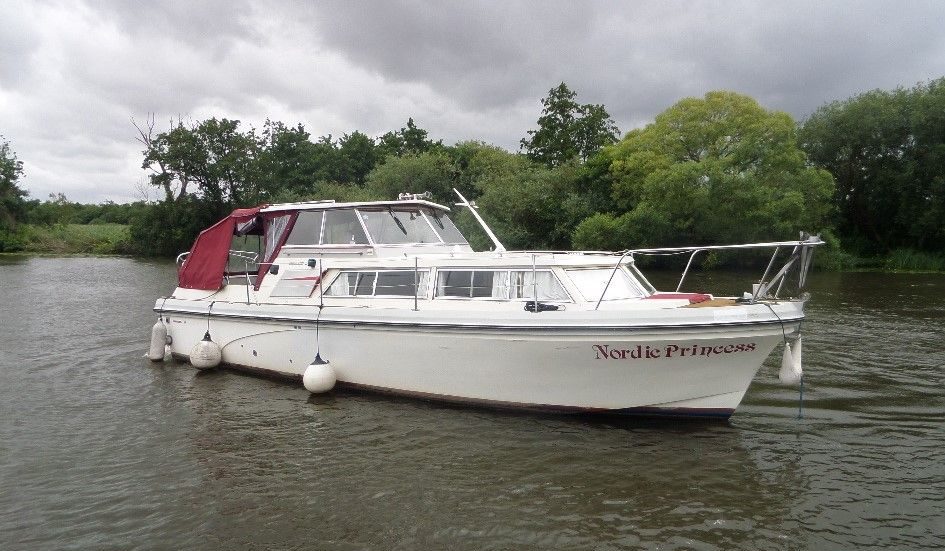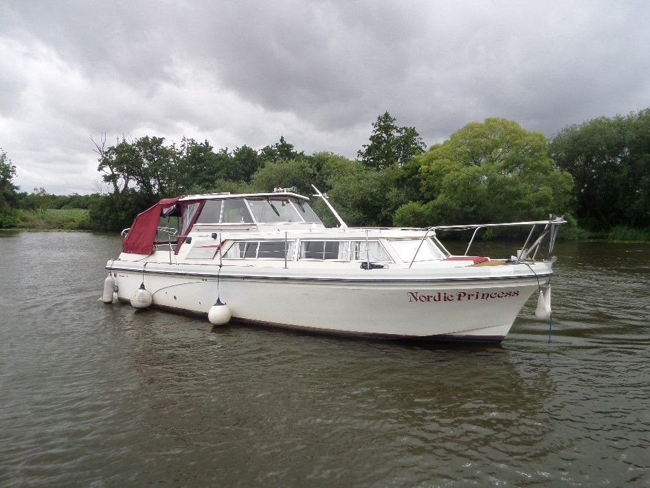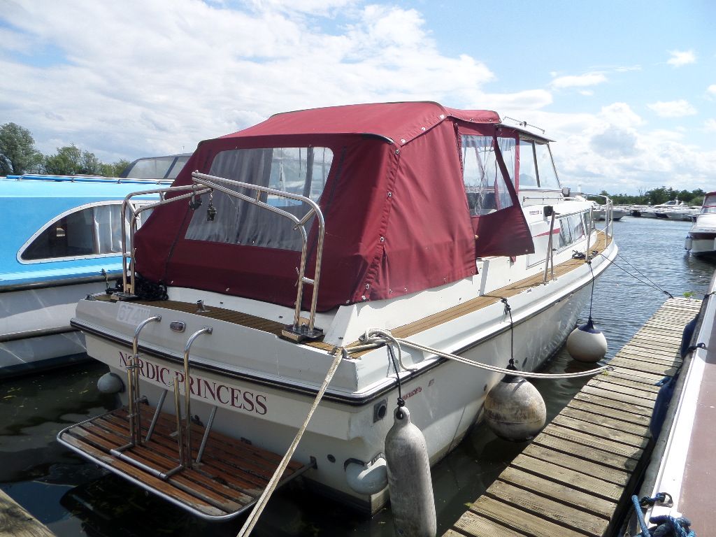 Princess 32 – 1977 – with twin Volvo Penta diesel engines. 5 berths including the saloon, toilet/ shower compartment, two burner with oven and grill, fridge, Eberspacher heating, shore power, davits, bathing platform. A spacious boat with a social cockpit, the Princess 32’s are a classic motor cruiser for a family or couple!