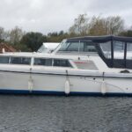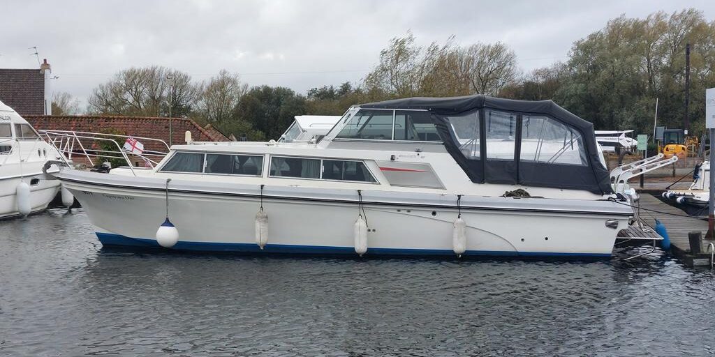 Princess 32 – 1977 – Twin Volvo AQD21 75hp diesel engines through sterndrives. 5 berth accommodation with a single toilet & shower compartment. Specification to include; folding screens, depth sounder, speed and trip log, warm air heating, holding tank, shore power. “Capricorn One” offers a large amount of space and benefits from having folding screens, allowing through most Broads bridges. The Engines and sterndrives have been recently serviced and the boat has also been anti-fouled. BSC 25/01/2027