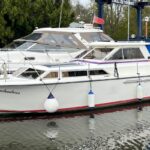 Princess 33 MK 1– Circa 1978 – 2 x Ford Mermaid 80hp diesel engines. 6 berth accommodation in 3 cabins with a toilet and shower compartment. Specification to include: Battery charger, shore power, immersion heater, Mikuni warm air heating, solar panels, Furuno GPS, Nav man tracker, anchor winch, electric toilet and recent canopy. A versatile cruiser with inland and coastal capabilities. Antifouled and polished 2024.