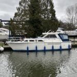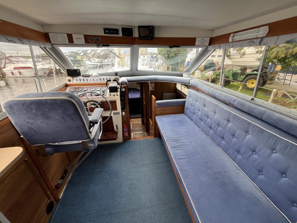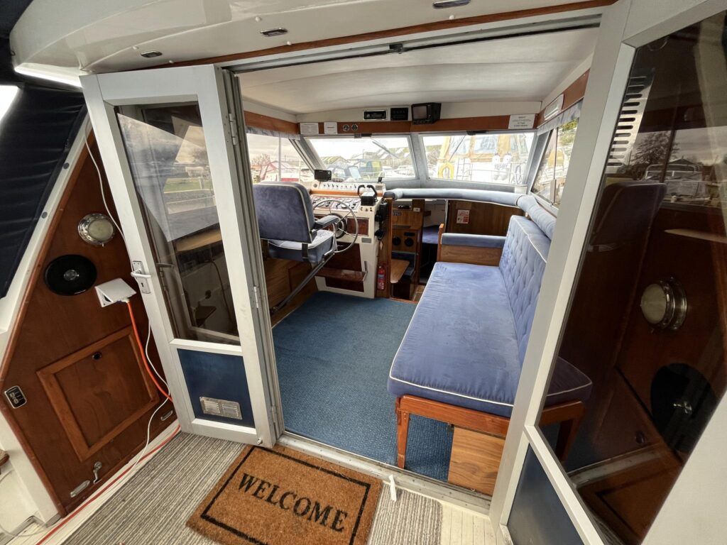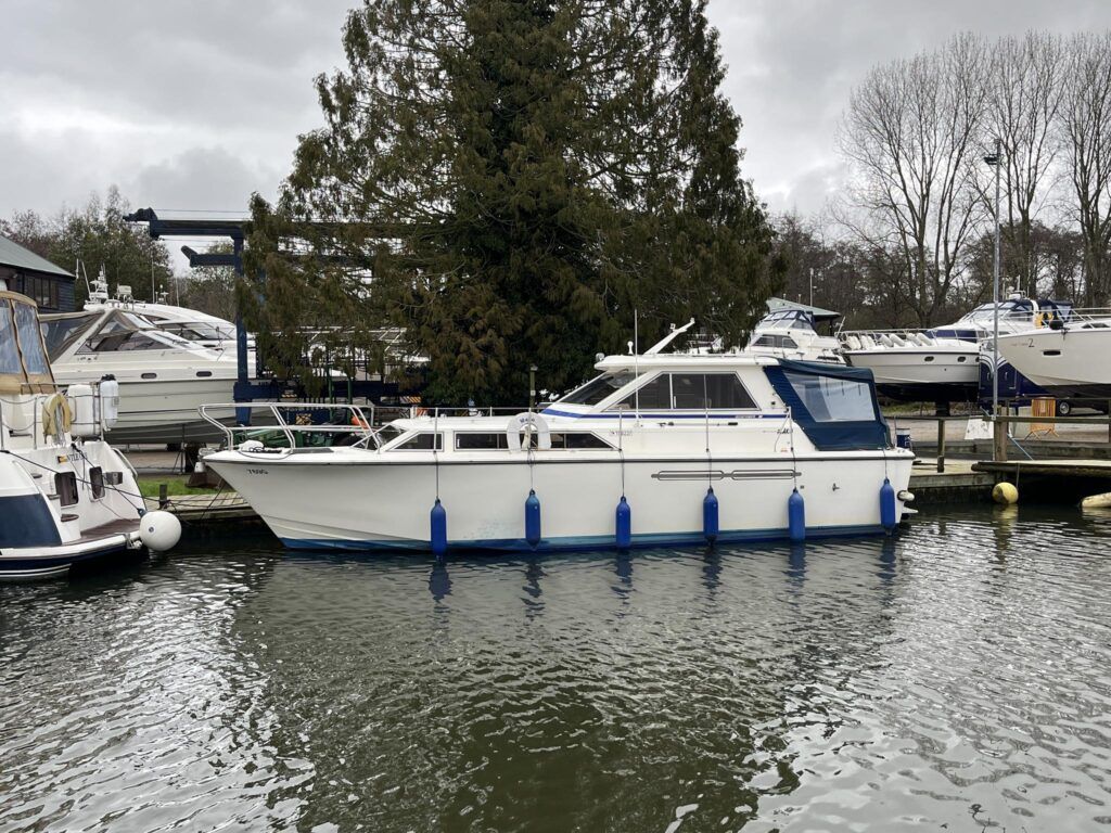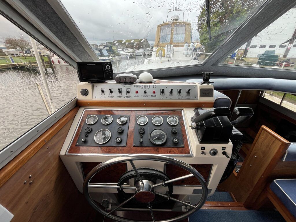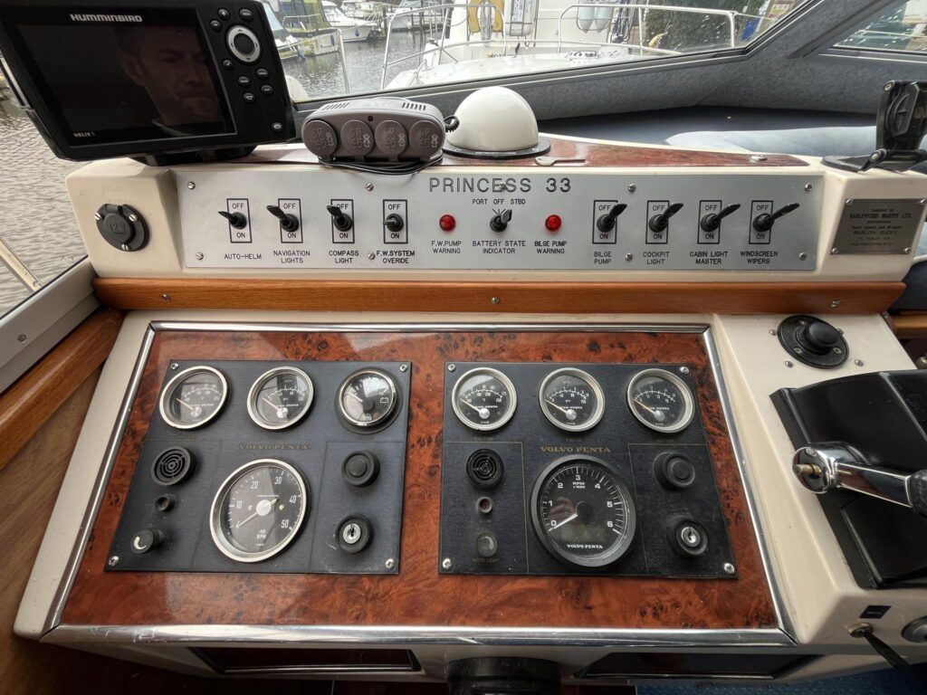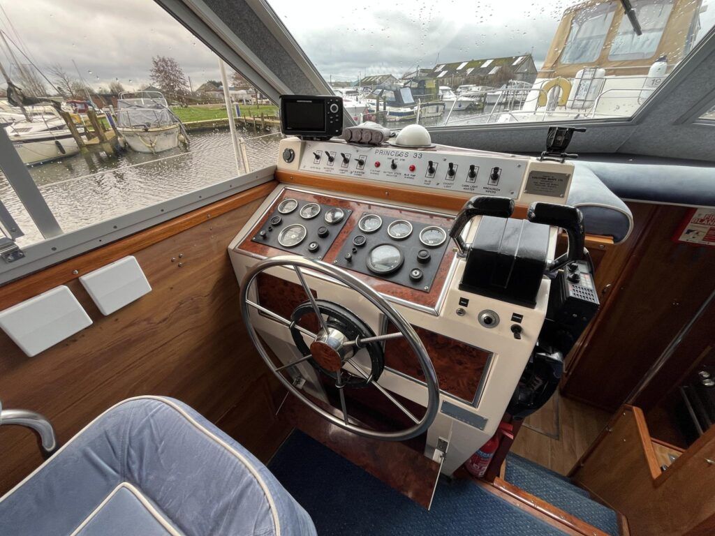 Princess 33 – Circa. 1980 – Powered by twin Volvo MD40 84hp diesel engines on shafts . Up to 6 berth accommodation with one toilet and shower. Good specification including shore power, battery charger, immersion, warm air heating, inverter, Hummingbird Helix5, BSC 09/2026 . A nice example of these popular cruisers and presented in good order for her age. Ideal for inland or light coastal pursuits. NYA Stock – Sold with 3 month engine & gearbox warranty.