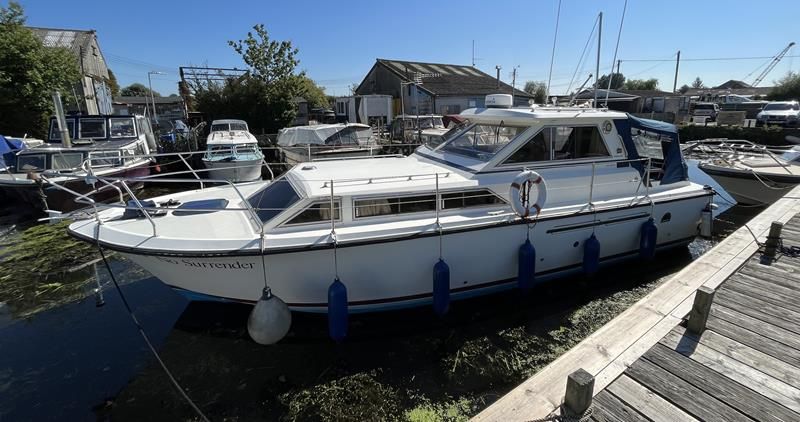 Princess 33 – 1980 – Powered by Ford Mermaid Melody 85hp diesel engines through shafts. Up to 6 berth accommodation with 1 x toilet/shower compartment. Specification including Shore power, battery charger, immersion, warm air heating, Solar panel charger, anchor winch, Garmin chart plotter, VHF, GPS and more. A smart example of this well built motor boat with a host of equipment making her ideal or inland or coastal cruising.