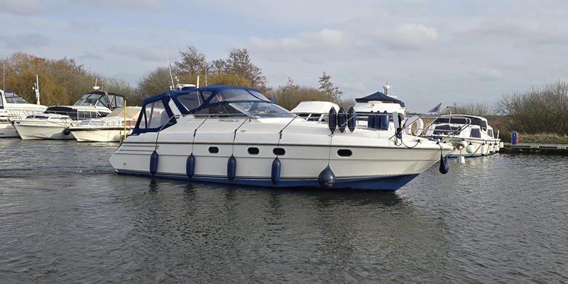 Princess 366 Riviera – 1993 – 2x Yamaha 285hp diesel engines. 6 berth accommodation with a toilet and shower compartment. Well specified including; Shore power, warm air heating, immersion heater, batter charger, Raymarine plotter/radar, bow thruster, trim tabs and inverter. No expense spared in her upkeep – new batteries, heating, canopy, dashboard, upholstery and more. Recent antifoul and service.