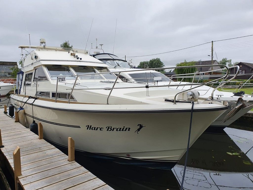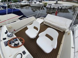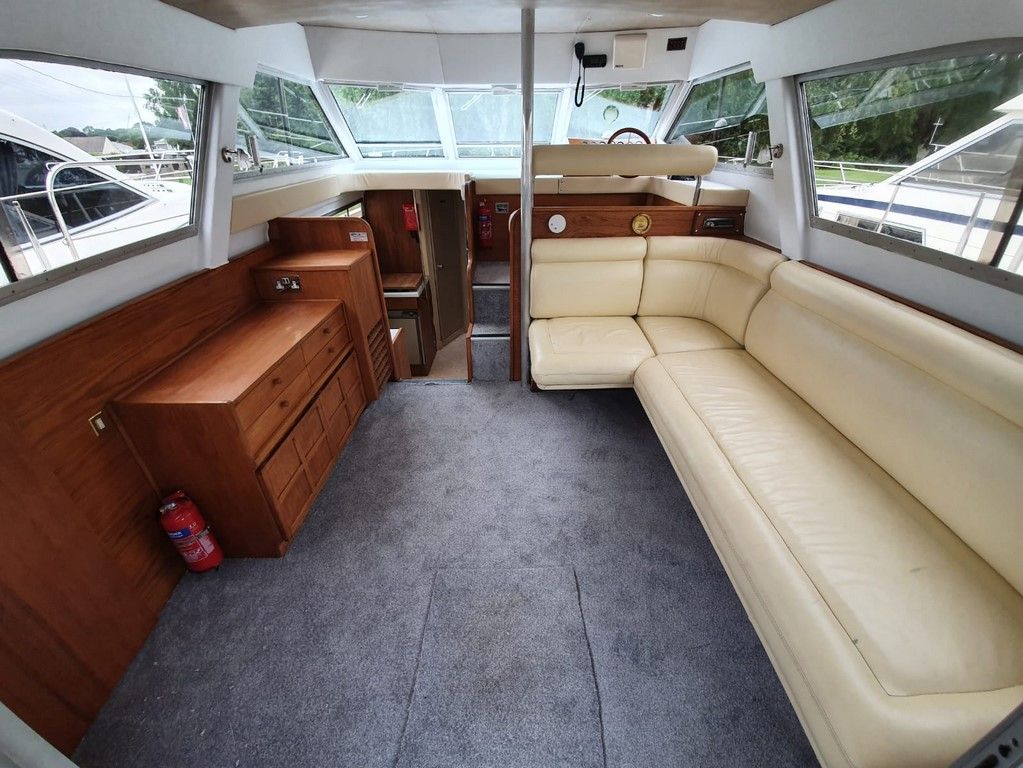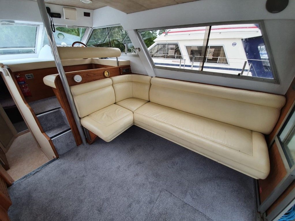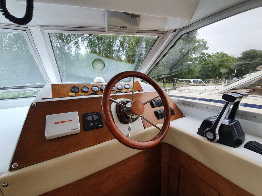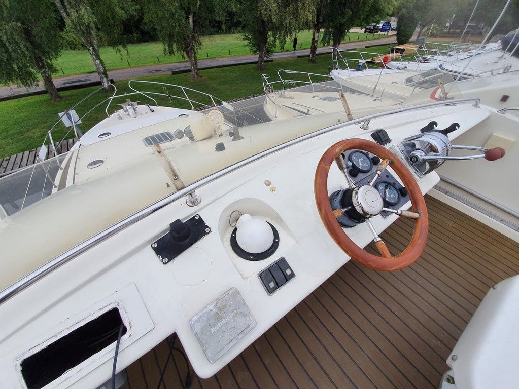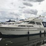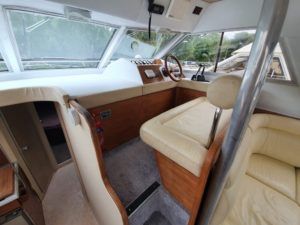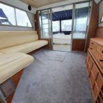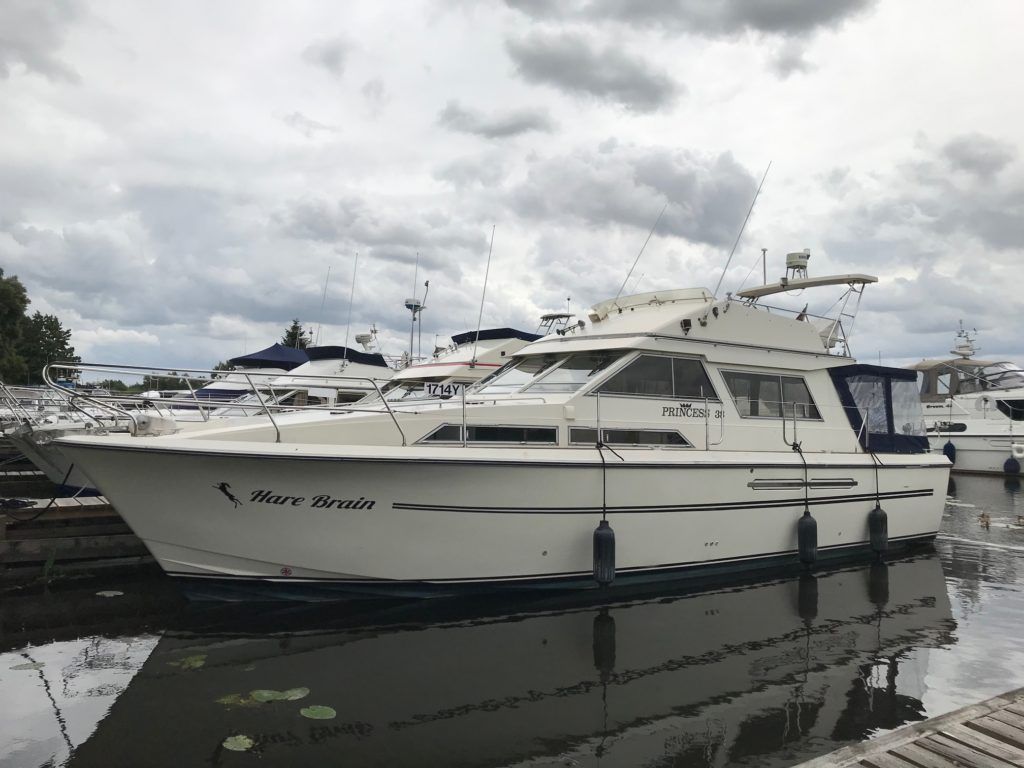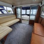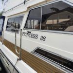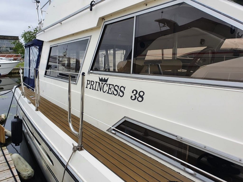 PRINCESS 38 – Circa. 1982 – Powered by twin Volvo 235hp diesels through shafts. 6 berth accommodation with toilet and shower. Specification to include; Vetus bowthruster, warm air heating, 240v shore power supply, trim tabs, calorifier and a range of navigation equipment to include; Koden MDL 7 plotter and Icom VHF. Well appointed galley with twin sink, refrigerator, 4 burner and microwave. Synthetic teak laid decks and cockpit. An ideal introduction into offshore boating, a cavernous flybridge cruiser!