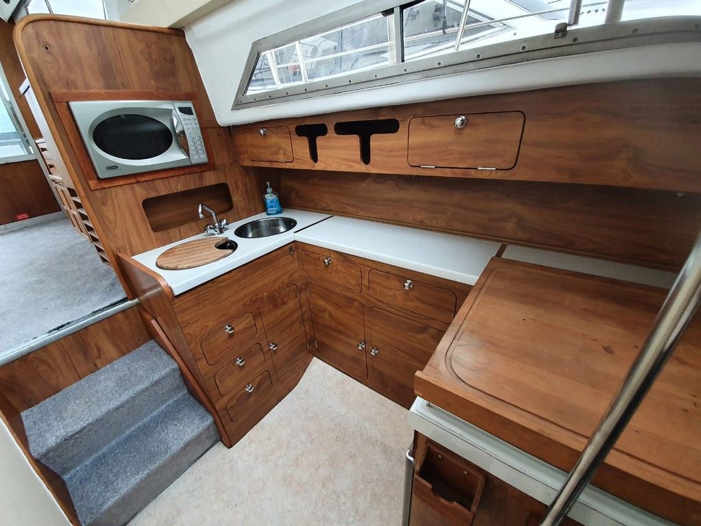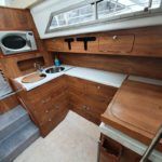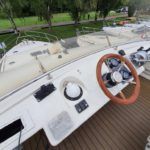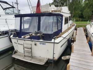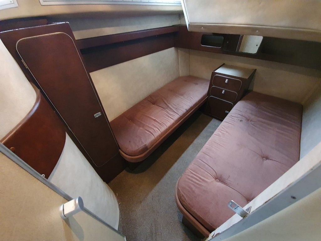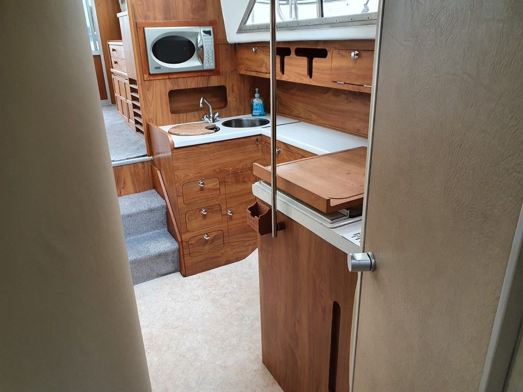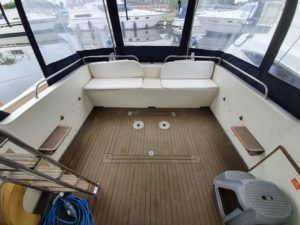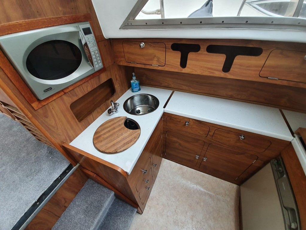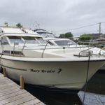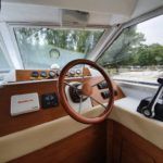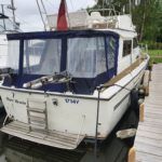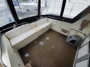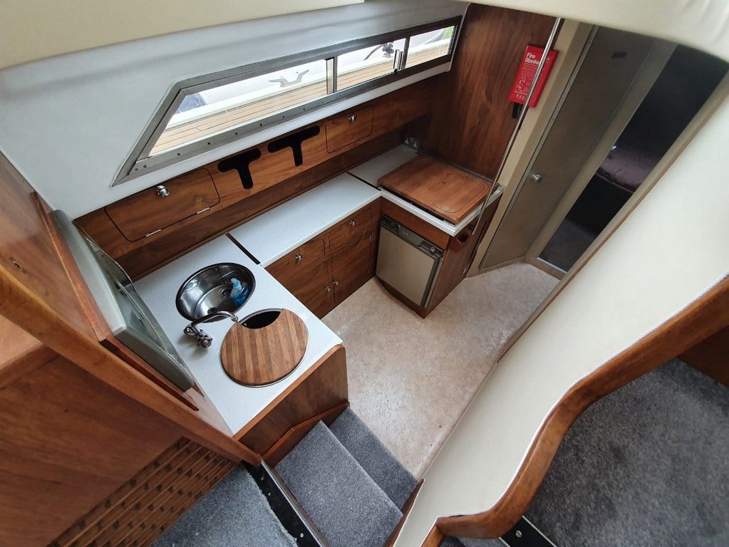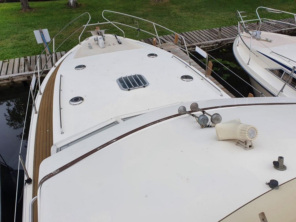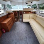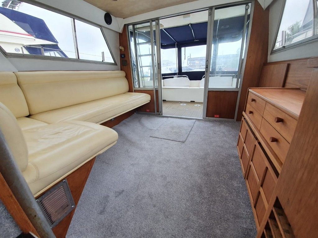PRINCESS 38 – Circa. 1982 – Powered by twin Volvo 235hp diesels through shafts. 6 berth accommodation with toilet and shower. Specification to include; Vetus bowthruster, warm air heating, 240v shore power supply, trim tabs, calorifier and a range of navigation equipment to include; Koden MDL 7 plotter and Icom VHF. Well appointed galley with twin sink, refrigerator, 4 burner and microwave. Synthetic teak laid decks and cockpit. An ideal introduction into offshore boating, a cavernous flybridge cruiser!