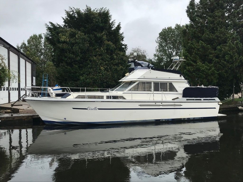 PRINCESS 41 – Circa. 1978 – Powered by twin Volvo TAMD60B 235hp diesels through shafts – 6 berth accommodation across 3 cabins with 2 toilets and shower – Specification to include; Bow and stern thrusters, holding tank, electric windlass, shore power supply with battery charger and 240v sockets, VHF, Radar, chartplotter, autopilot. Antifoul 2019. A cavernous flybridge cruiser!