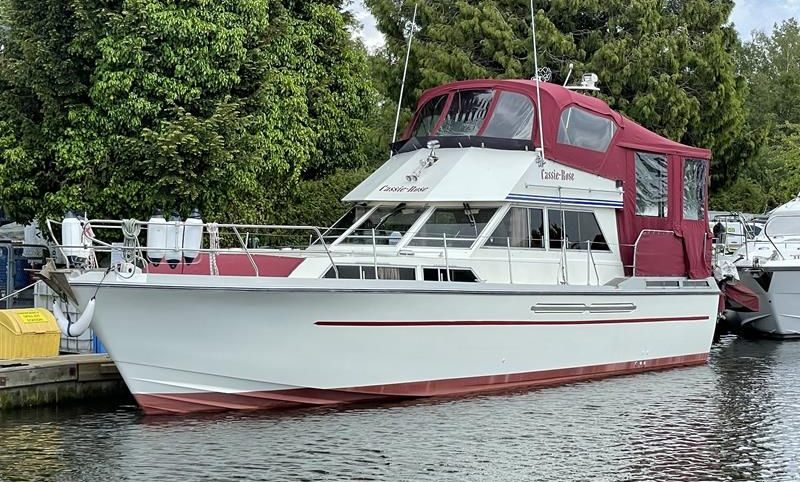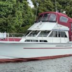 PRINCESS 41 – 1980 – Powered by twin Volvo TAMD63P 370hp (fitted 2005) diesels through shafts – 6 berth accommodation with two toilets and two showers – Specification to include; Bow and stern thrusters, trim tabs, warm air hearting, shore power supply, VHF, autopilot. Full canopy to aft deck and flybridge. Recent hull polish and antifoul! A cavernous Princess flybridge with a very desirable engine set up! Perfect for those looking to do extended cruising!