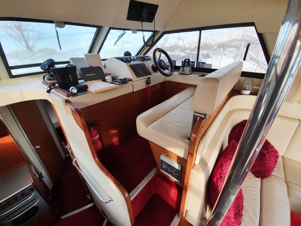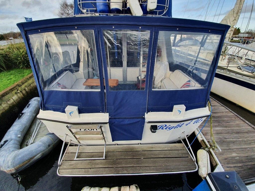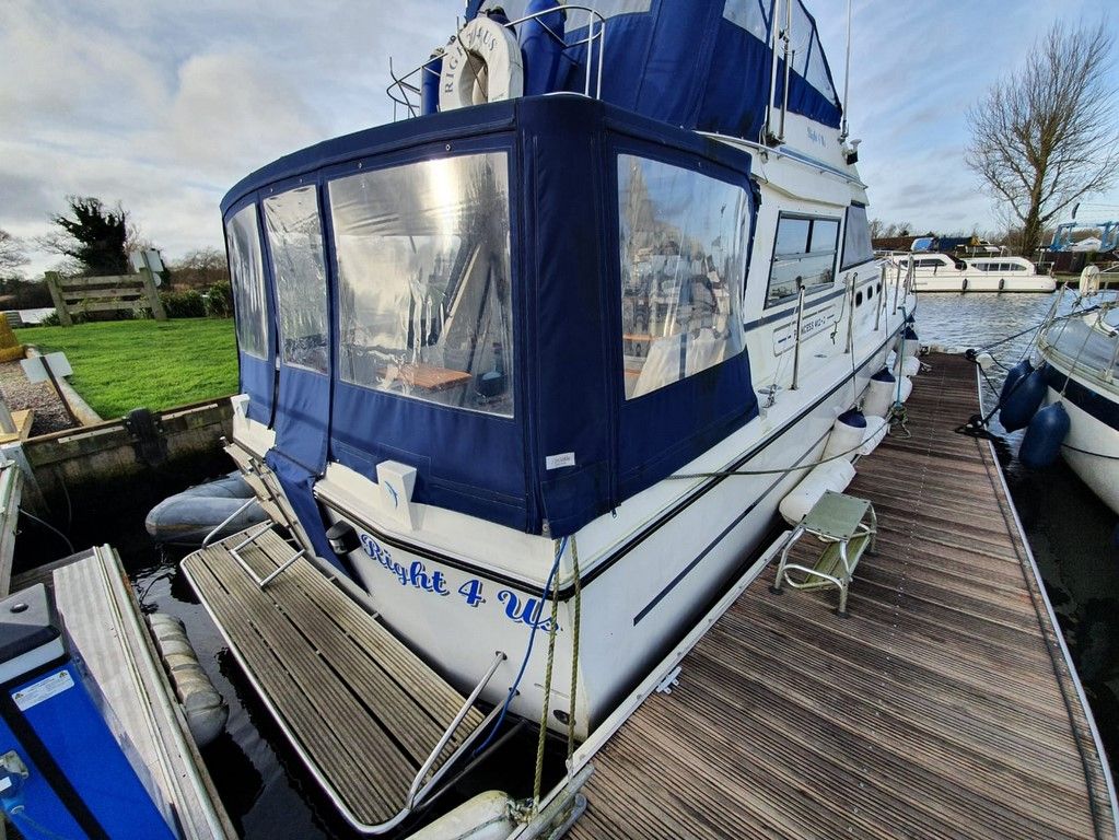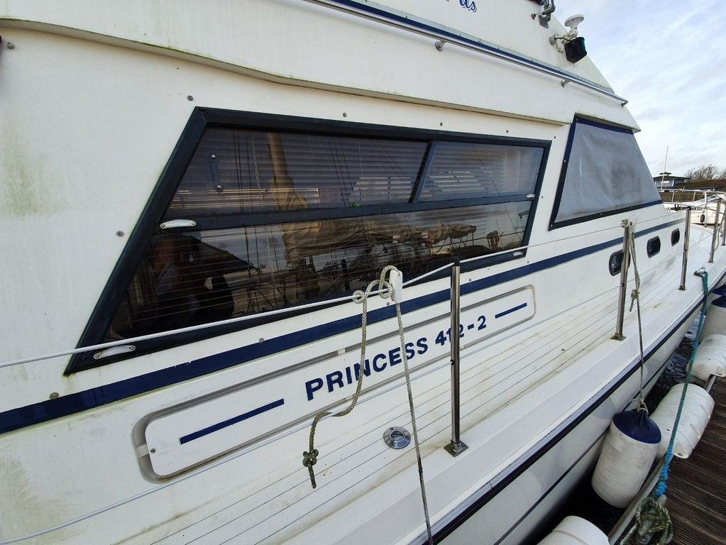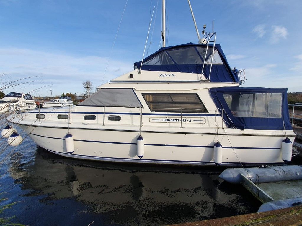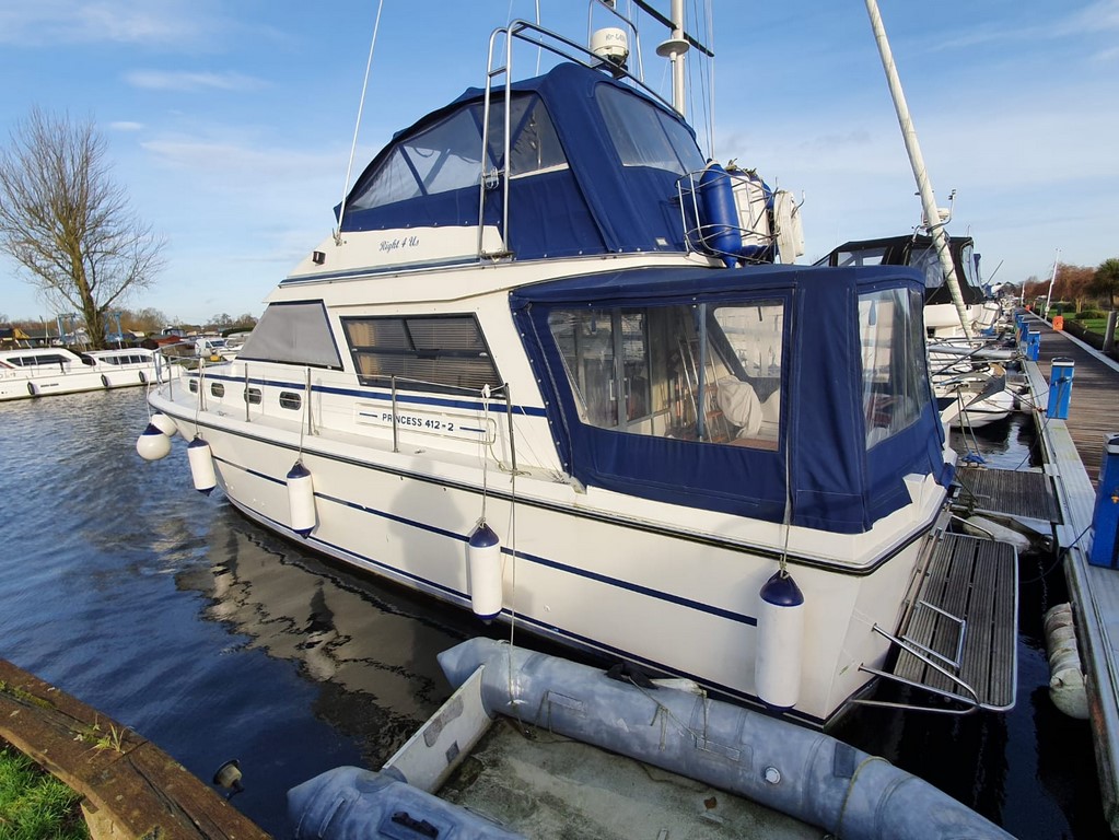 PRINCESS 412-2 – 1983 – Powered by twin Volvo TAMD60B 235hp diesels. 5 berth accommodation with 2 toilets and 2 showers. Specification to include; Eberspacher warm air heating, Vetus bowthruster with remote, anchor winch, a range of navigation equipment and shore power with battery charger and 240v supply. Folding radar arch and electric flush toilets. Engine service 2019. In current ownership for 13 years, used to cruise the Broads and East Coast.