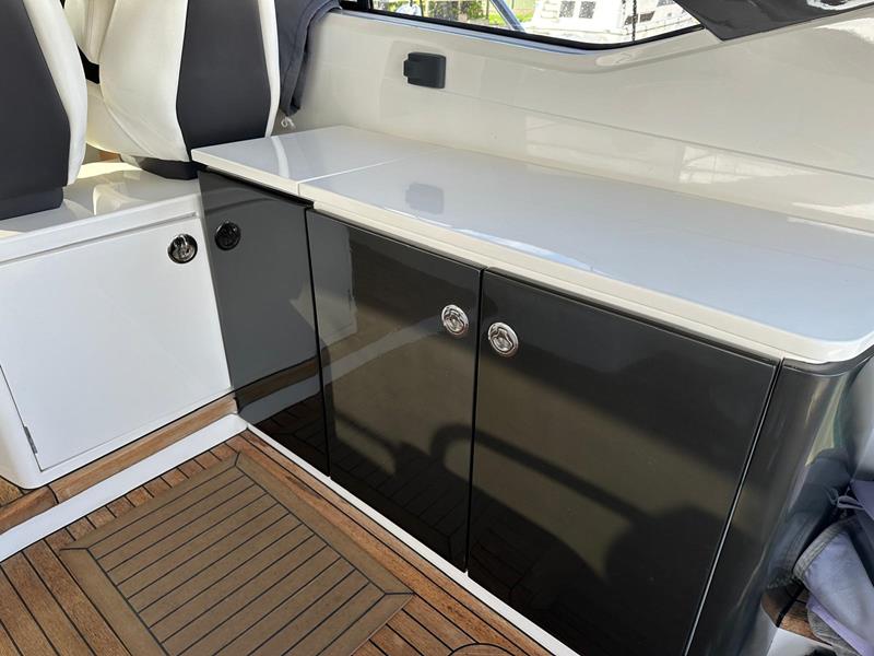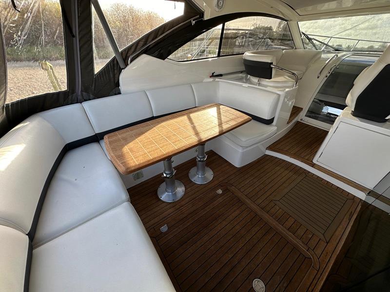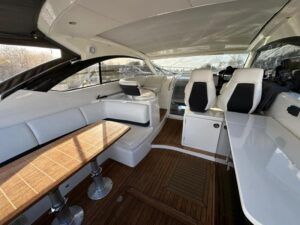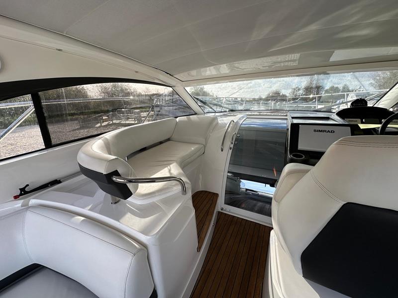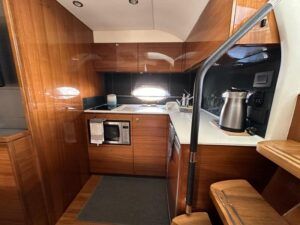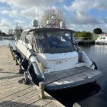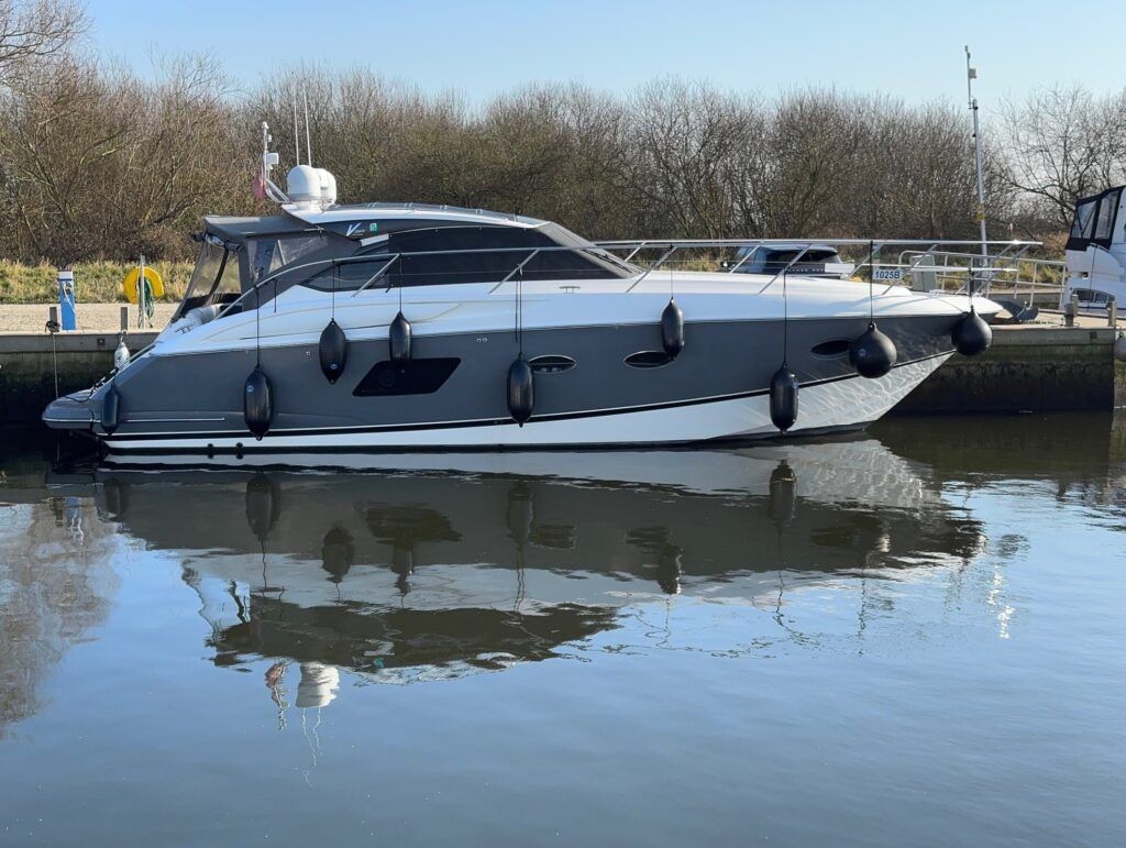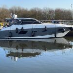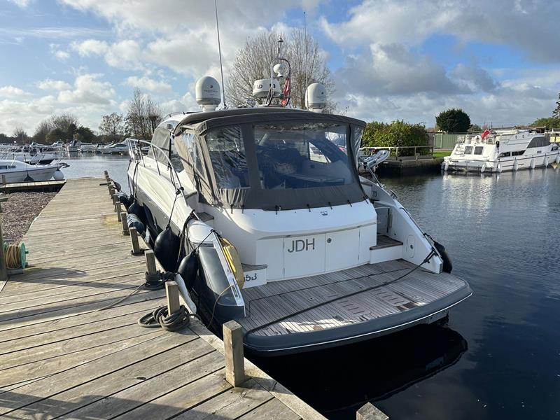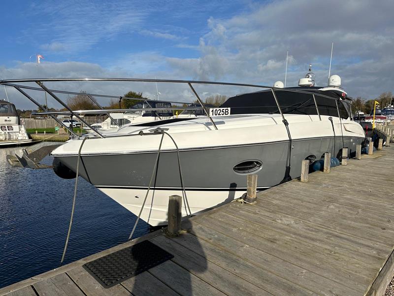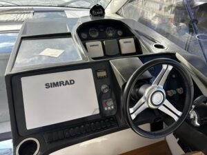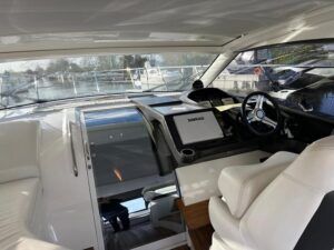Princess V39 – 2012 – 2x Volvo D6-330DP 330hp diesel engines. Sumptuous four-berth accommodation with an island double berth, toilet with holding tank, and separate shower cubicle. Well specified including: Volvo joystick system, 4Kw generator, hi-low hydraulic bathing platform, bow thruster, autopilot, GPS/chartplotter, radar, AIS, warm air heating, cockpit BBQ/fridge and much more. Serviced and antifouled 2024. BSC 2028. A beautifully kept V39 featuring a contemporary walnut gloss interior and a striking steel grey hull. Viewing by appointment.
