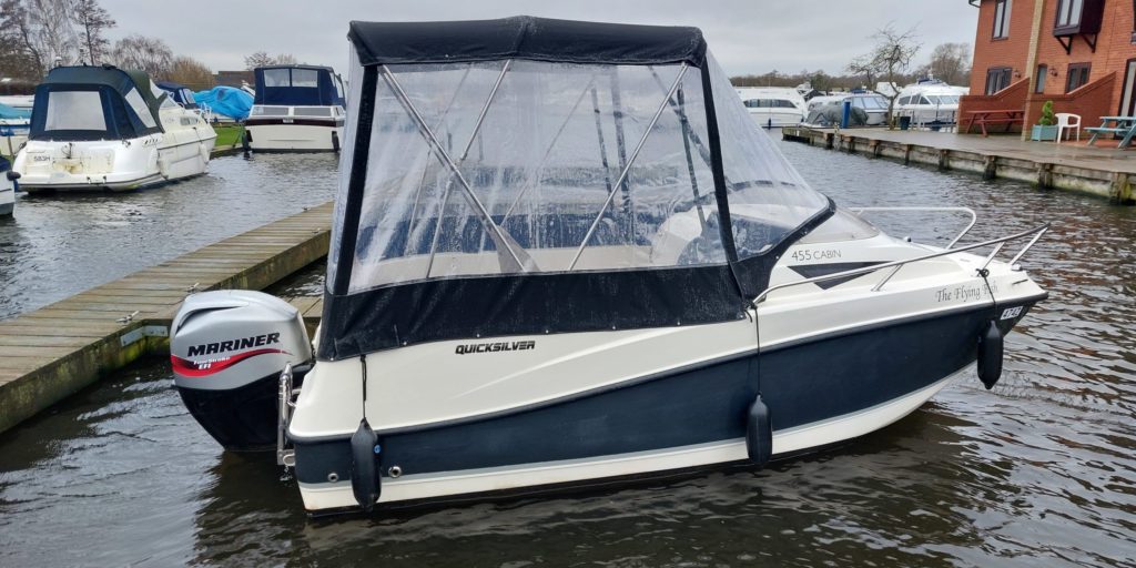 Quicksilver 455 Activ Cabin – 2016 – Single Mariner F60, 60hp fuel injected, petrol, long shaft outboard engine with electric start (new in 2022). 2 berth accommodation in 1 cuddy cabin. Specification to include; Power trim, navigation lights, speedometer, full canopy and tonneau cover. “The Flying Fish” would make an excellent introduction to boating and benefits from having a sociable cockpit and a new engine in 2022. BSC 14/09/2024