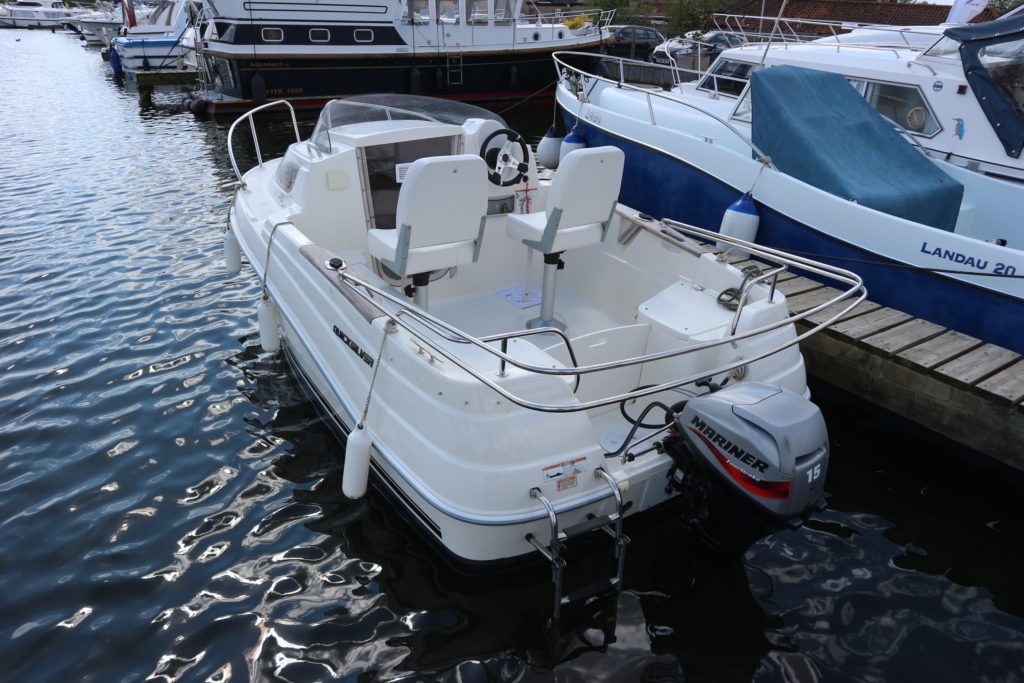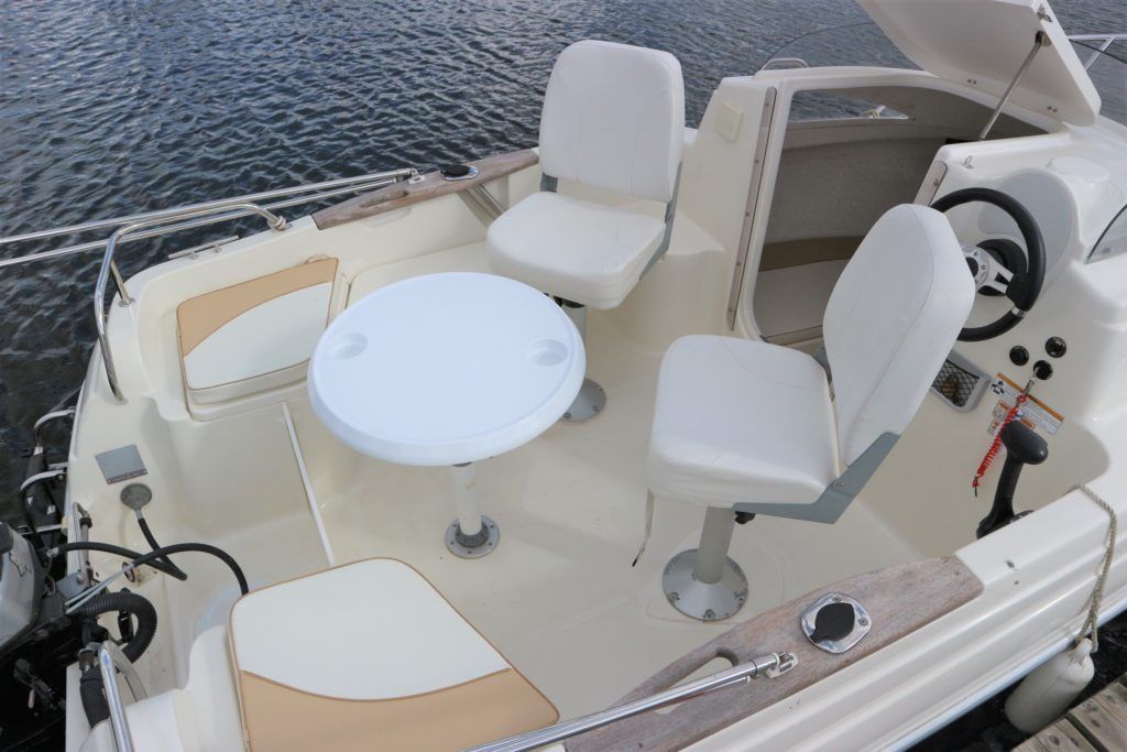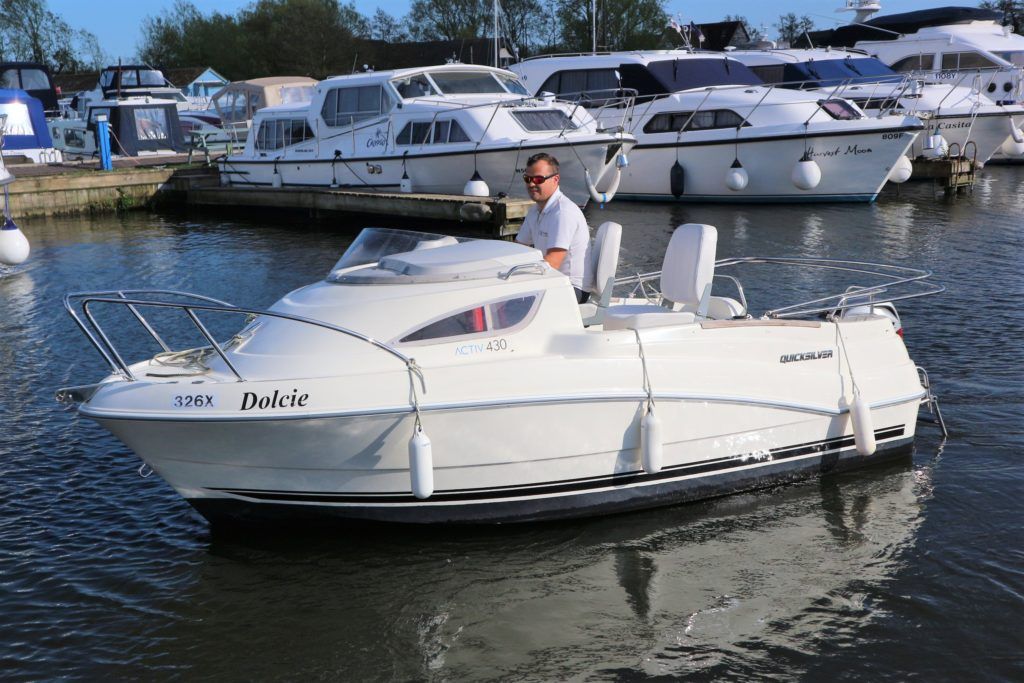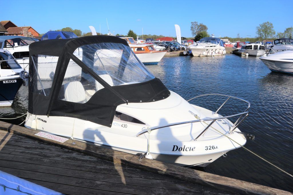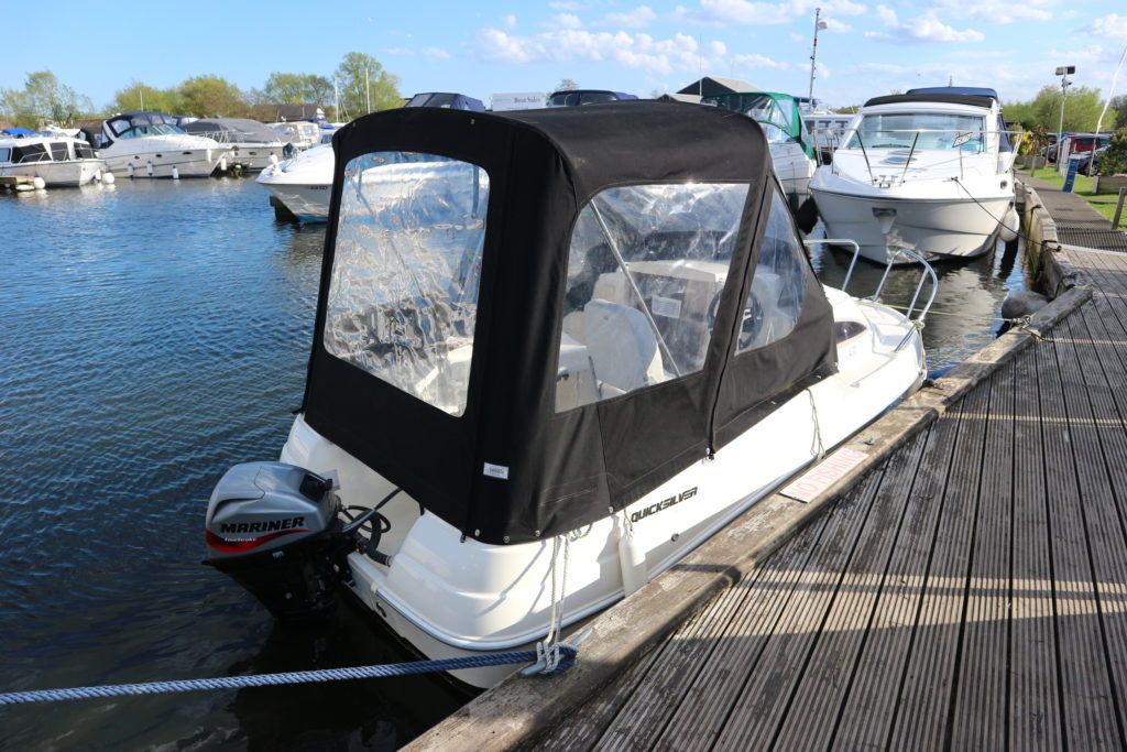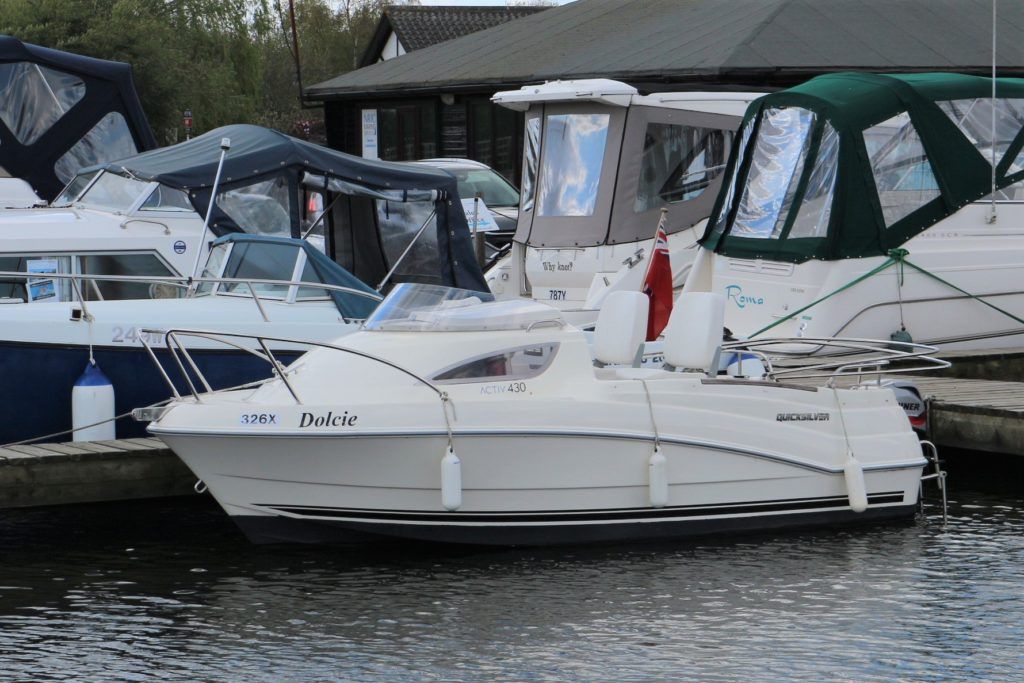 QUICKSILVER ACTIV 430 – 2013 – Mariner F15 EL 15hp outboard engine. 2 berth overnight accommodation in cabin. Cockpit with cushioned seating to transom, two folding helmsman seats, removable table and pedestal, removable side bench seat, tonneau cover, full canopy, BSC 04/22. A modern and social day cruiser with overnight facility, perfect for exploring the Inland Waters.