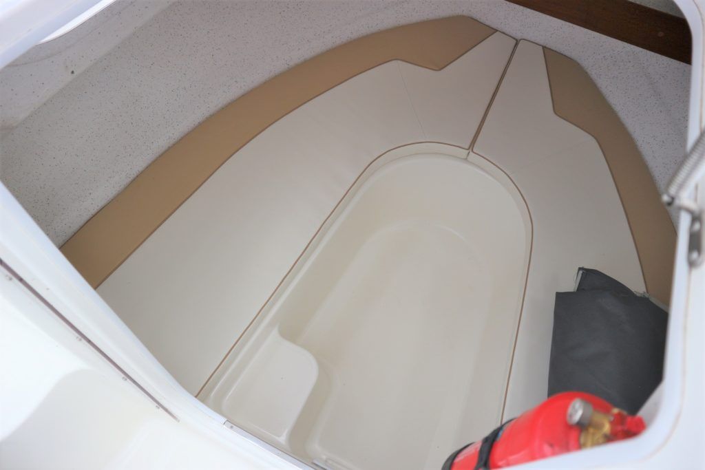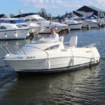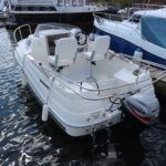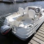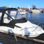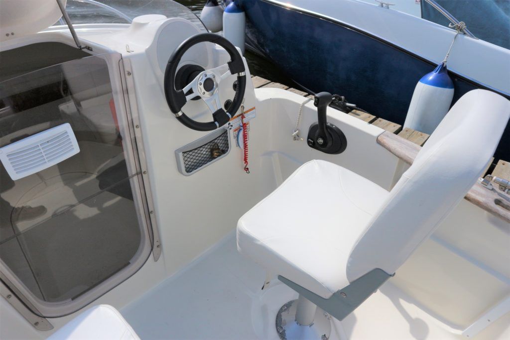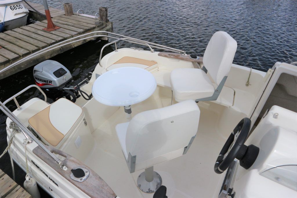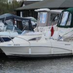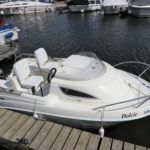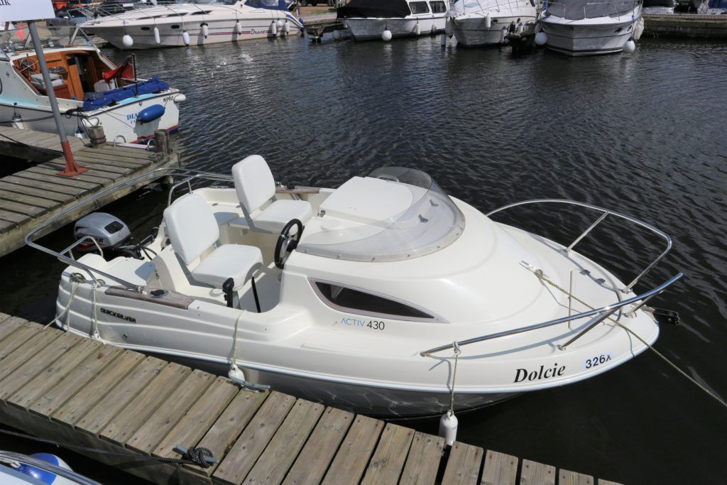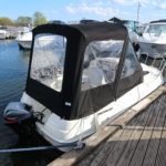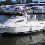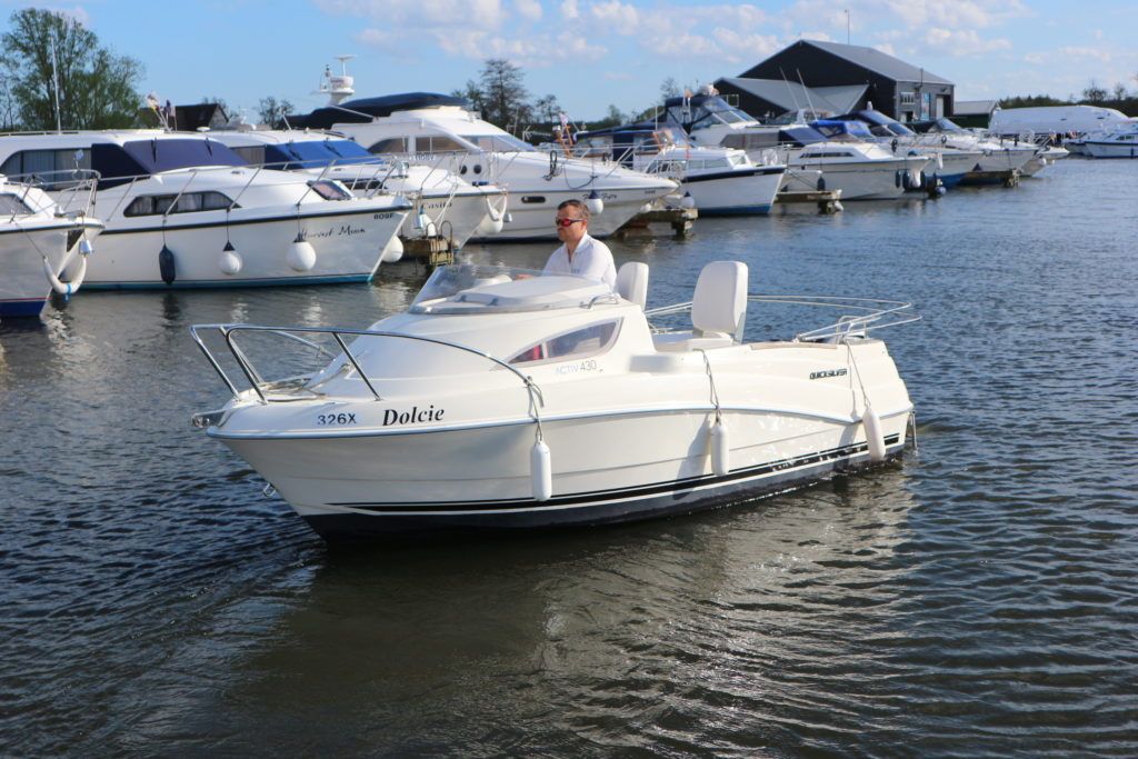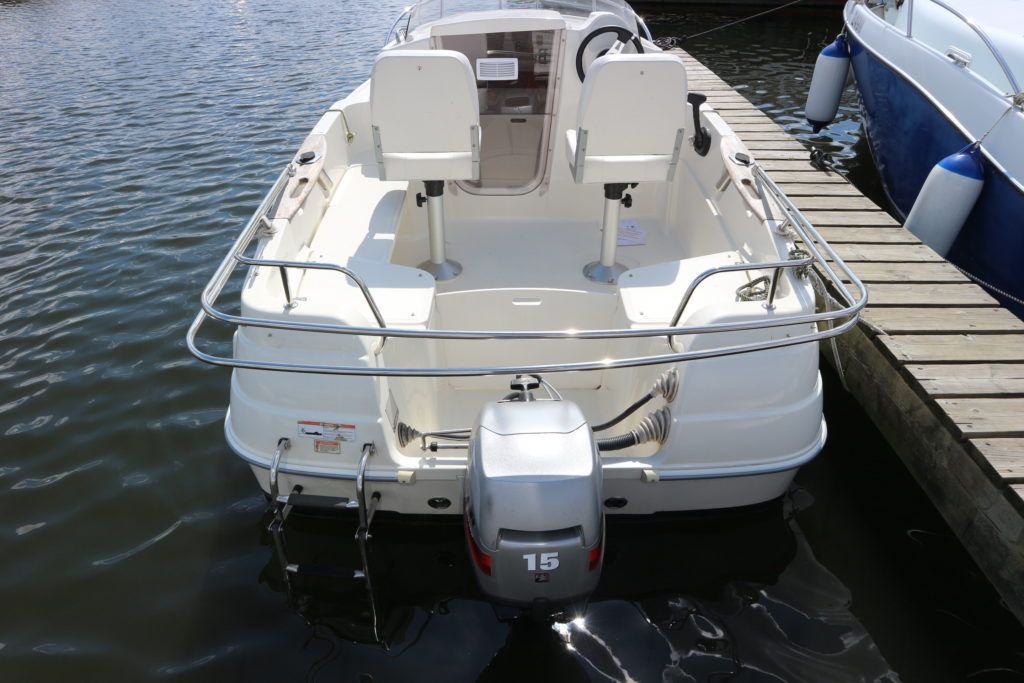 QUICKSILVER ACTIV 430 – 2013 – Mariner F15 EL 15hp outboard engine. 2 berth overnight accommodation in cabin. Cockpit with cushioned seating to transom, two folding helmsman seats, removable table and pedestal, removable side bench seat, tonneau cover, full canopy, BSC 04/22. A modern and social day cruiser with overnight facility, perfect for exploring the Inland Waters.