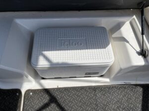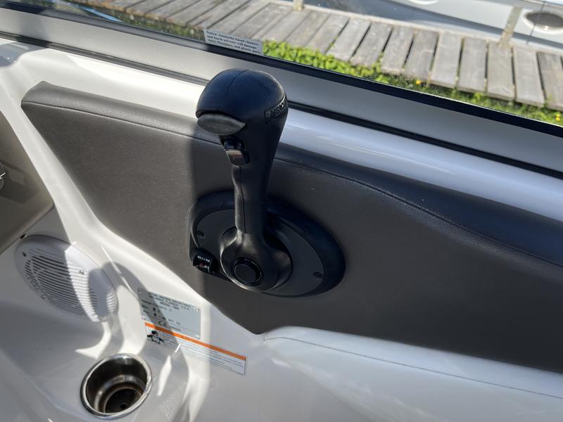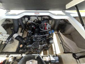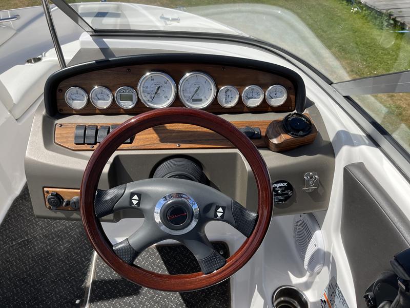 Dash-mounted engine instruments: tachometer, fuel gauge, volt meter, speedometer, depth alarm