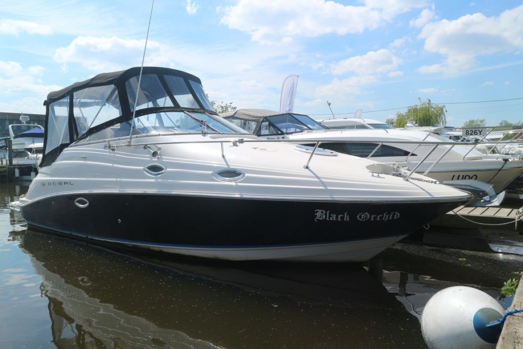 REGAL 2665 COMMODORE – 2004 – Powered by a single Yanmar 240hp diesel through a sterndrive – 4 berth accommodation with toilet and shower. BSSC 2024 – Well specified to include; Holding tank, electric windlass, trim tabs, a range of navigation equipment and shore power supply with battery charger. Striking black hull and canopy with an extended bathing platform. A sought after diesel-engined sports cruiser with a desirable low air-draft.