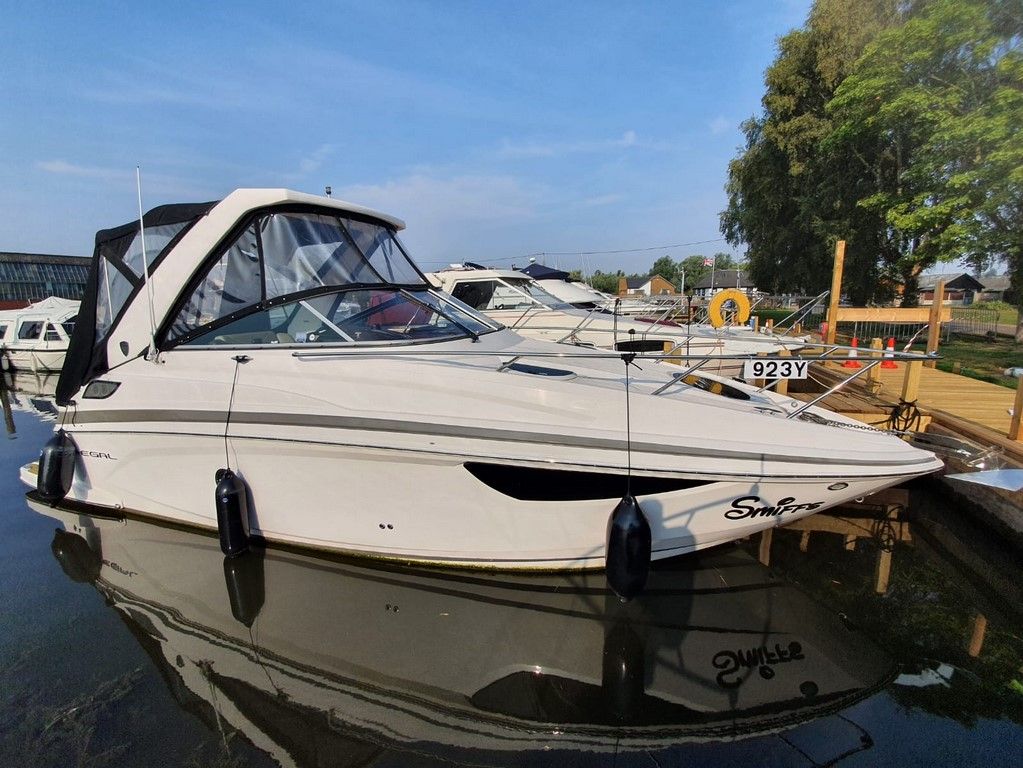 Regal 28 – 2014 – Powered by a single Mercury 350Mag petrol through a sterndrive. 4 berth accommodation with toilet and shower. Specification to include; Lewmar electric windlass, Lewmar bowthruster, trim tabs, holding tank, shore power, Simrad touchscreen plotter and Lowrance VHF. Folding radar arch for increased inland access. Synthetic teak laid cockpit and bathing platform with underwater light package. A real head turner! Lightly used with only 160 hours. A modern performance sports cruiser with a number of extras, presented in very good order! Viewing highly recommended!
