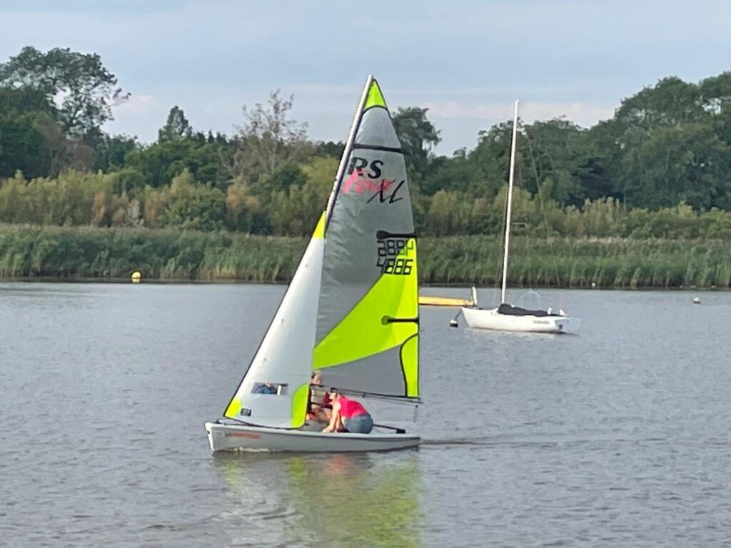RS Feva Sailing Dinghy (2012) – Sail No. 4886 Includes XL mainsail, clubsail, jib, and spinnaker, along with a top cover, launching trolley and road trailer. Hull weight is 68kg. The sails are as follows: reefing mainsail (5.5m²), XL three-batten mainsail 2022 (6.5m²), and jib (2.1m²). An exciting sailing dinghy in excellent condition and ready to sail.
