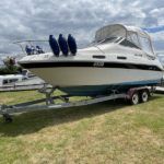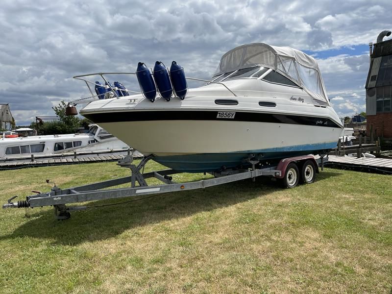 Sea Ray 230 – 1995 – Single Mercruiser 4.3LX V6 220hp with Alpha One drive, 4 berths, toilet compartment, battery charger with two batteried, 240v shore power, electric windlass, fridge, extended bathing platform improving stern access, a nice package with a 4 wheel galvanised trailer. Nice sized starter boat – fast and fun for the Summer