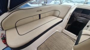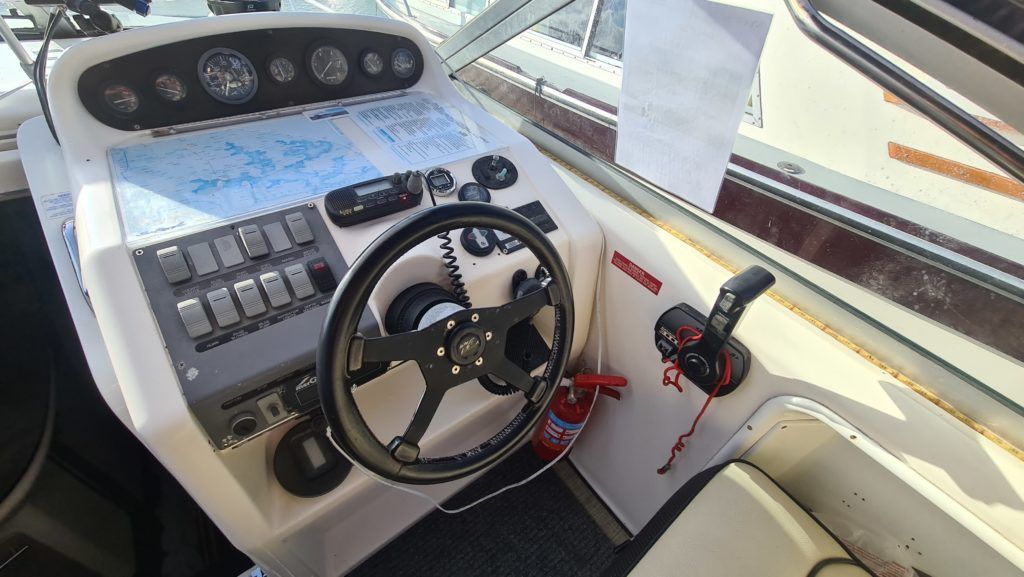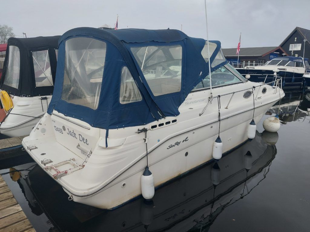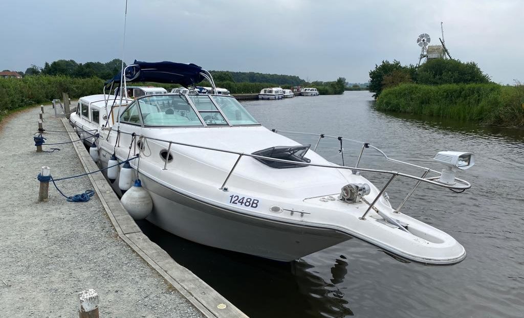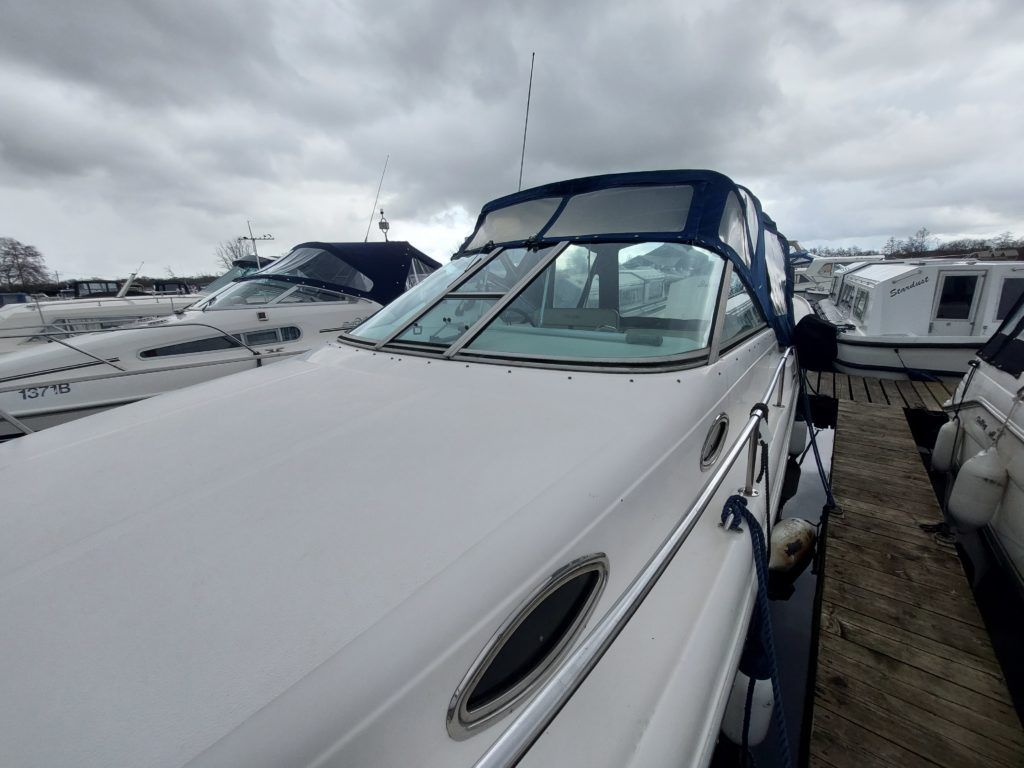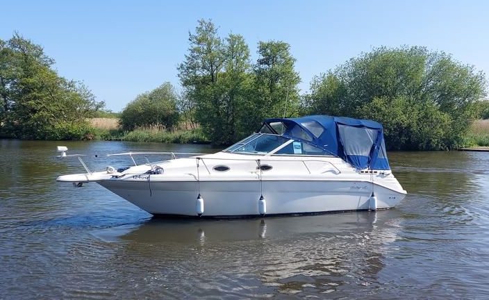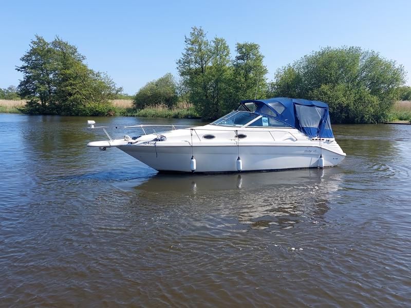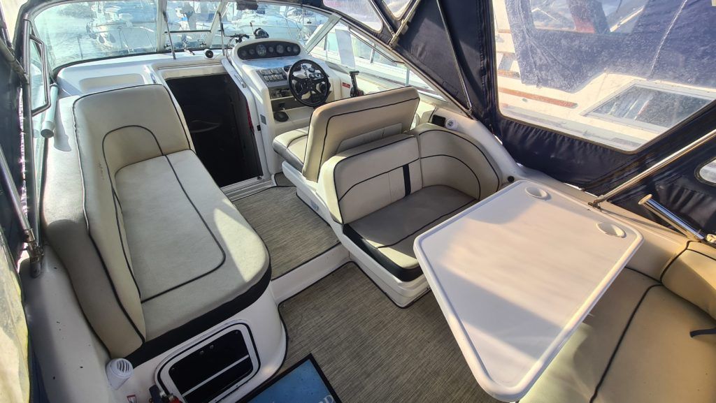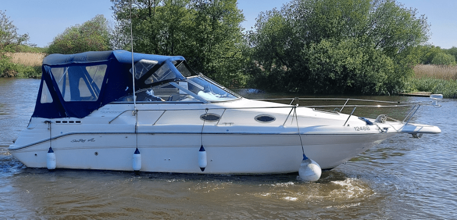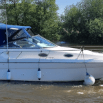 SEA RAY 270 – 1995 – Mercruiser 7.3l 300hp diesel engine on sterndrive. 5 berth accommodation with one toilet and one shower. BSC 06/25. Specification to include; bowthruster, electric windlass, trim tabs, shore power supply with battery charger, Lowrance 9″ Navigation System. Low air draft for increased inland access. An eye catching performance boat with plenty packed in for 27ft.