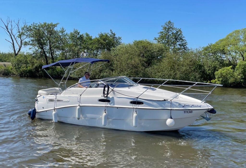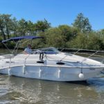 SEALINE S25 – 2006 single Volvo KAD32P diesel. 4 berths including saloon, toilet to holding tank/ shower, two burner, grill, fridge, heating, bathing platform, battery charger, anchor winch, BSC 2023. A lightly used sports cruiser, presented in good overall condition. Folding arch to allow for a low air draft and great access on the inland waterways.