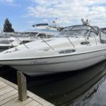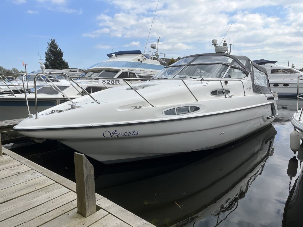 Sealine 310 Ambassador – 1993 – 2 x Volvo AD31 150hp diesel engines through sterndrives. Intelligent 4-berth accommodation with a toilet and shower compartment and en-suite facilities. Specification to include; Holding tank, Sidepower bow thruster, warm air heating, electric windlass, a range of navigation equipment inc Raymarine pathfinder RL70, 240v shore power supply with battery charger. Recent new canopy by Bailey & Stone. This 310 offers an excellent opportunity for those looking to venture into offshore cruising – an impeccably maintained example ready for the next owner to enjoy!