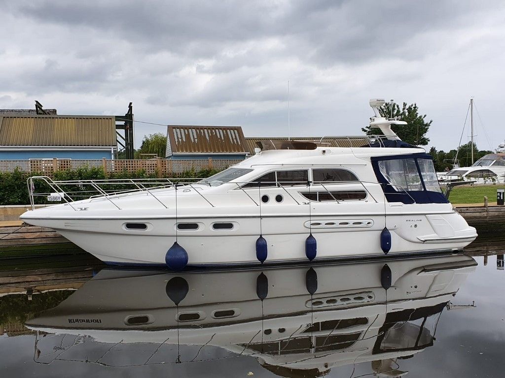 SEALINE 420 STATESMAN – 1996 – Powered by a twin Volvo TAMD63 370hp through shafts – 6 berth accommodation with two toilets and two showers. Very well specified to include; 8kw generator, bowthruster, Eberspacher warm air heating, air-conditioning, trim tabs, holding tank, electric windlass, shore power with 240v sockets and battery charger, a range of navigation equipment to include; radar, gps autopilot and more. A cavernous flybridge cruiser with a very good specification, well kept by her current owner.