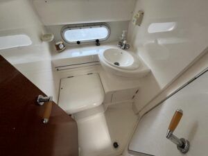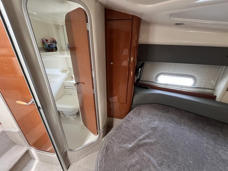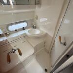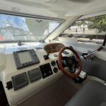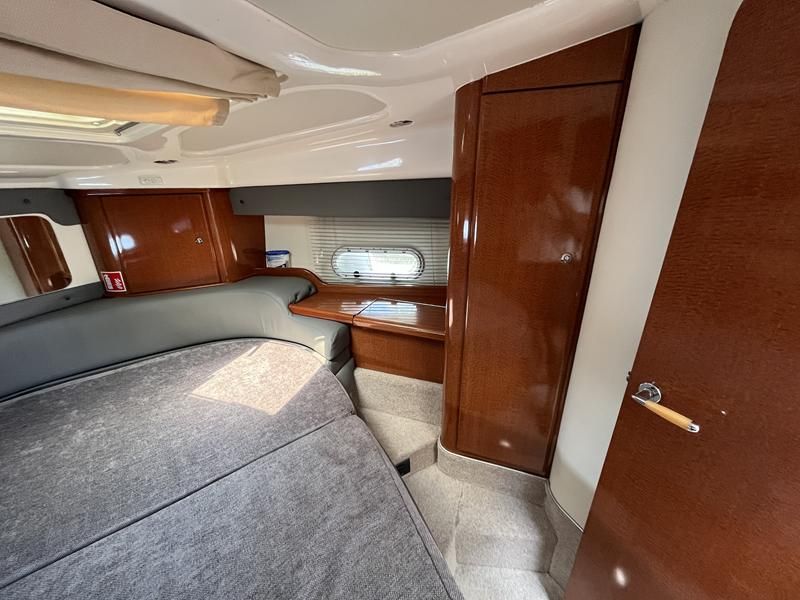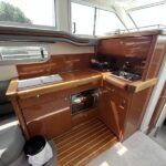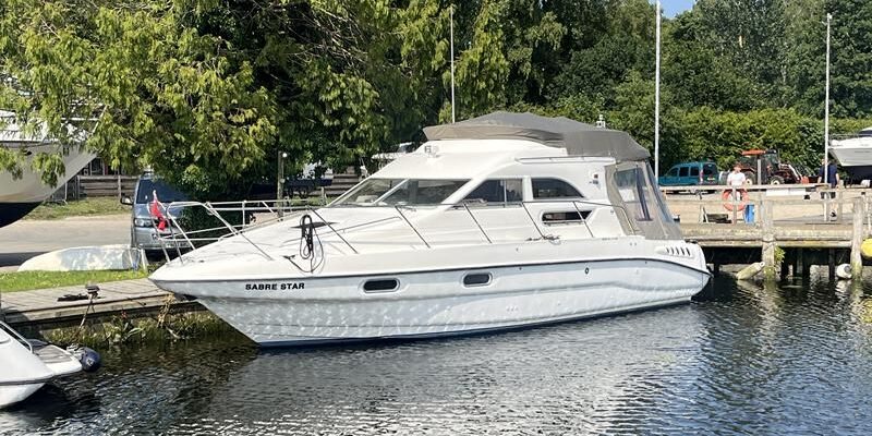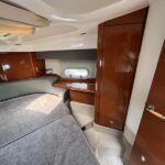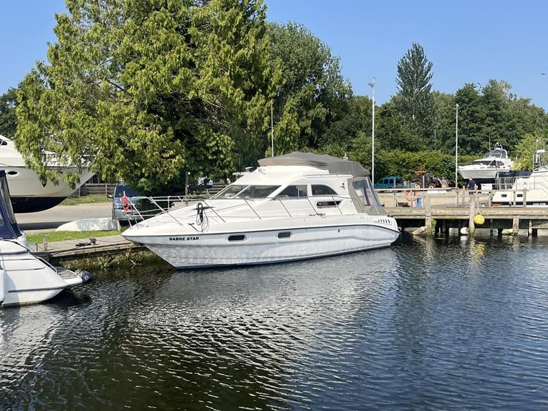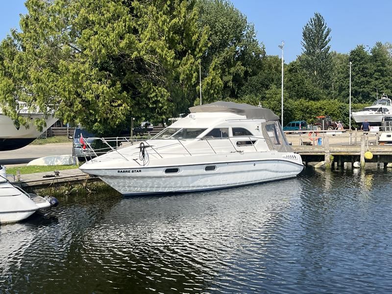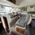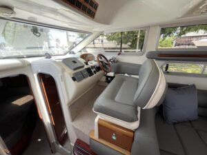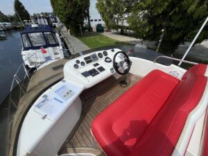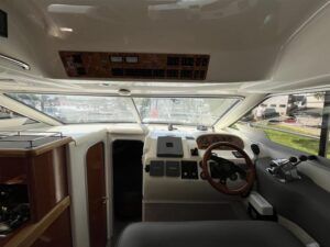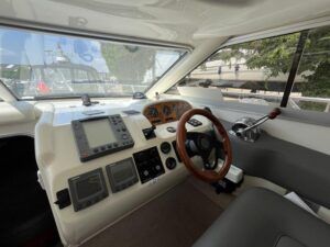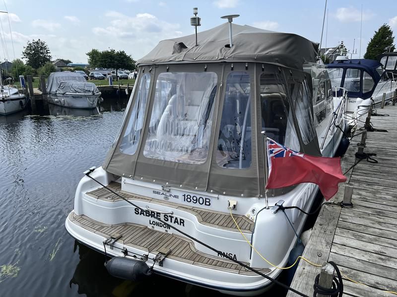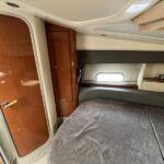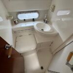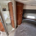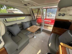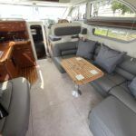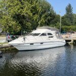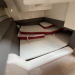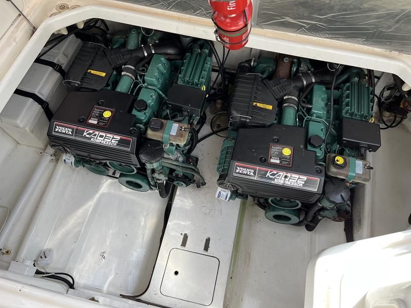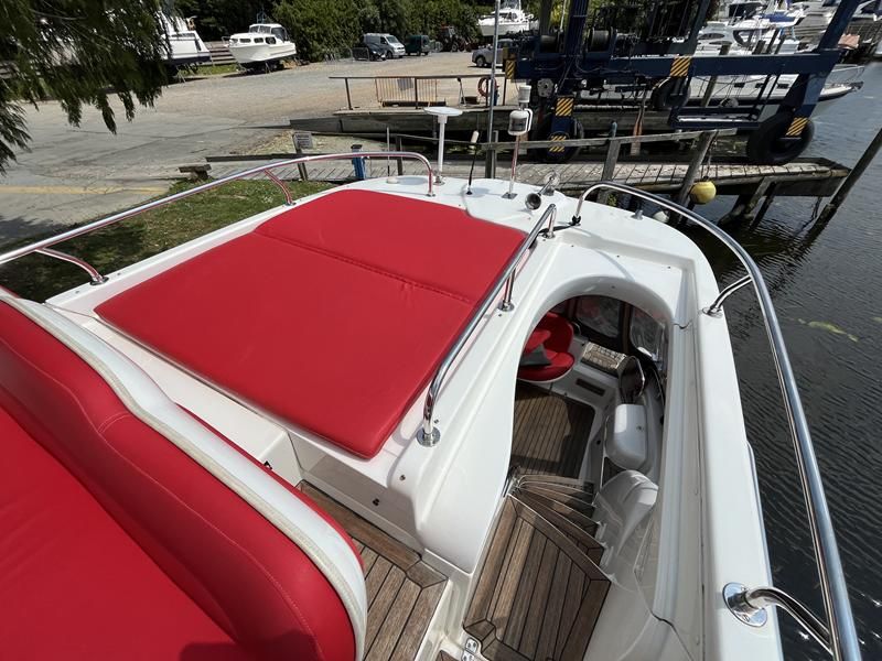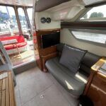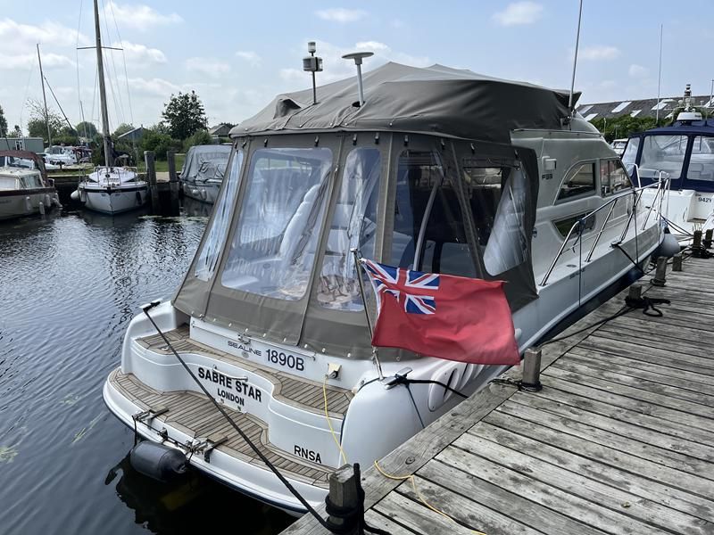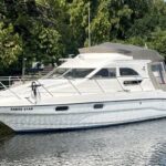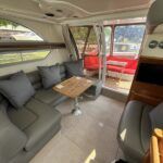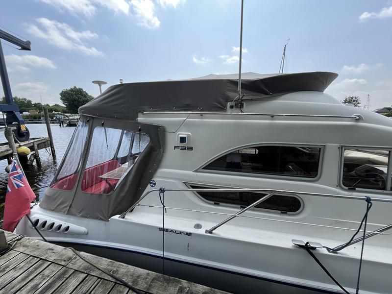 Sealine F33 – 2001 – Powered by 2 x KAD32 170hp diesel engines through stern drives. 6 berth accommodation with 1 x toilet and shower compartment. Specification including Bow thruster, Eberspacher warm air heating, electric windlass, trim tabs, shore power supply, battery charger, immersion/calorifier, holding tank and teak decks to flybridge, cockpit and bathing platform. BSC 2027. New canopy. Recent engine and outdrive service. A well-presented F33 in good order throughout.