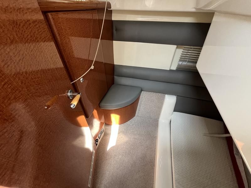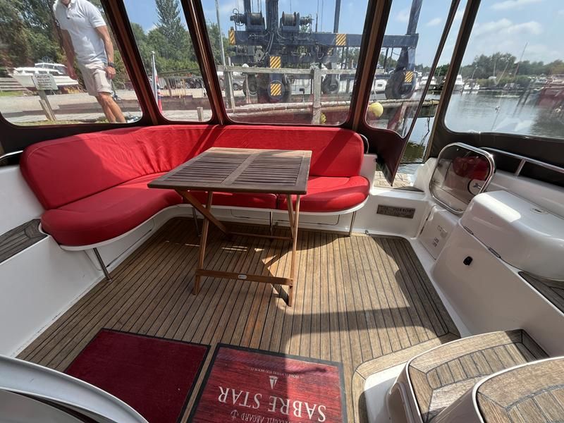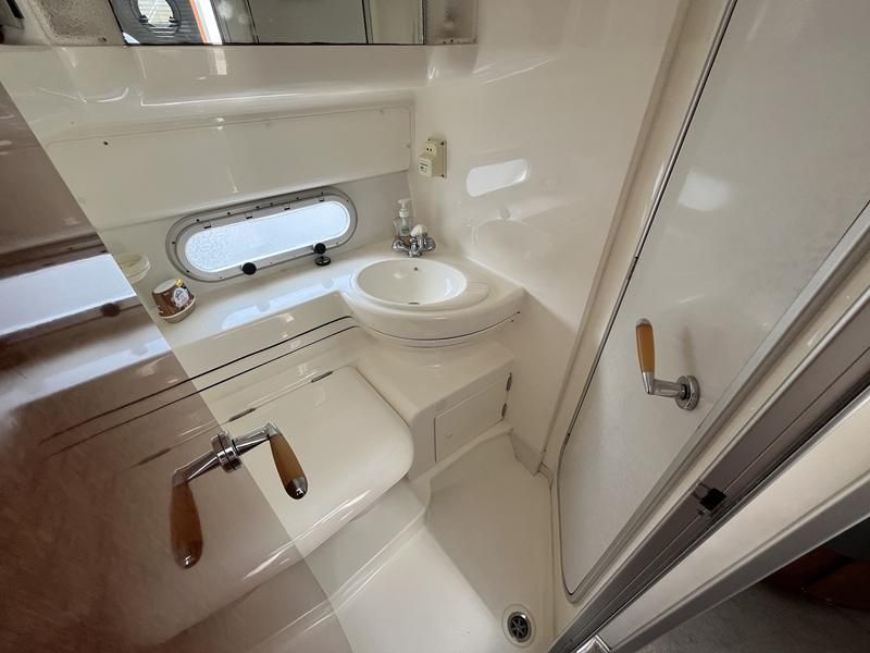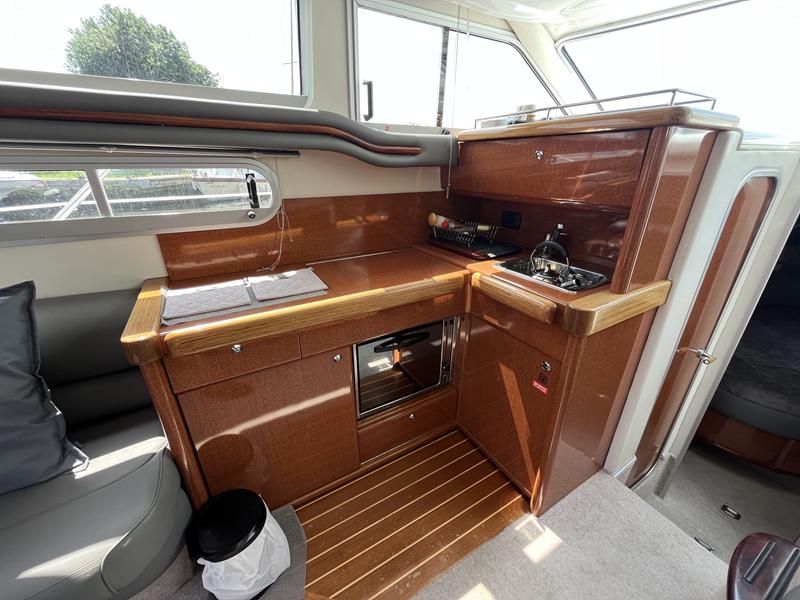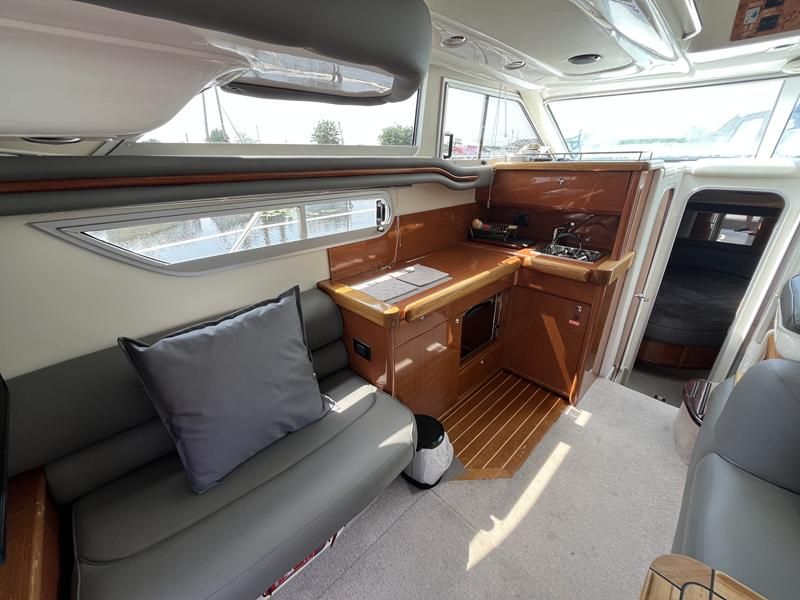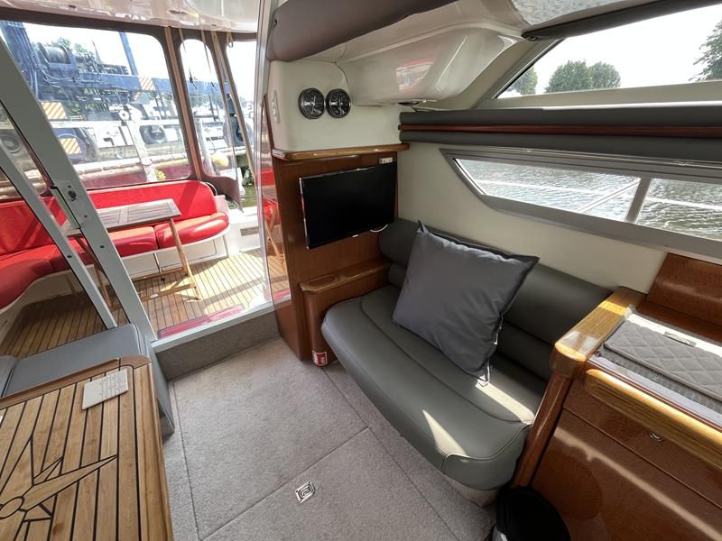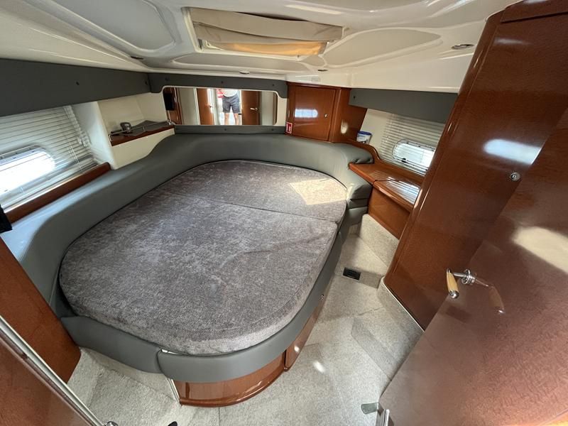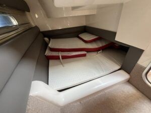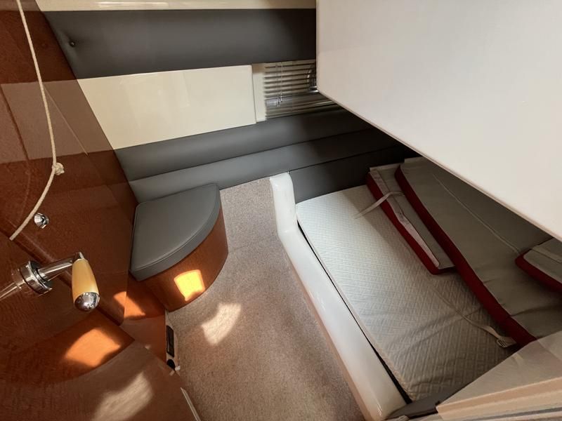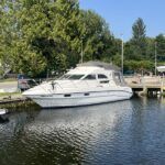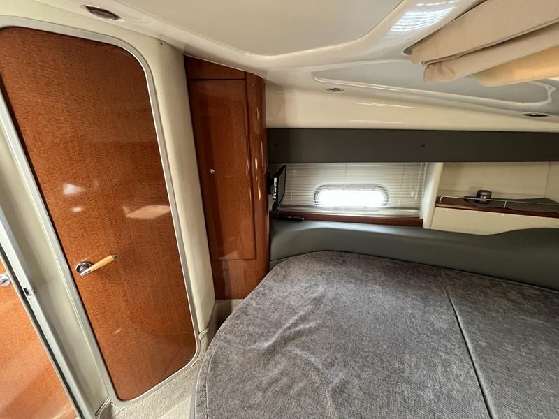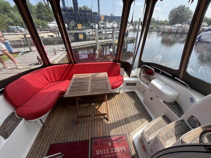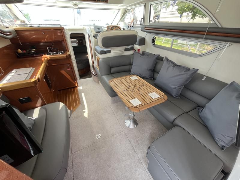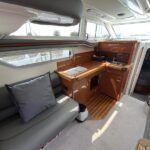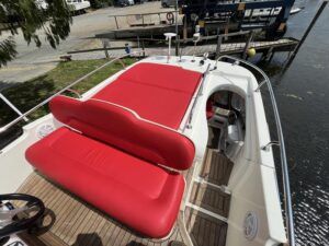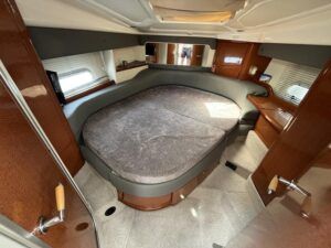 Sealine F33 – 2001 – Powered by 2 x KAD32 170hp diesel engines through stern drives. 6 berth accommodation with 1 x toilet and shower compartment. Specification including Bow thruster, Eberspacher warm air heating, electric windlass, trim tabs, shore power supply, battery charger, immersion/calorifier, holding tank and teak decks to flybridge, cockpit and bathing platform. BSC 2027. New canopy. Recent engine and outdrive service. A well-presented F33 in good order throughout.