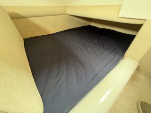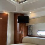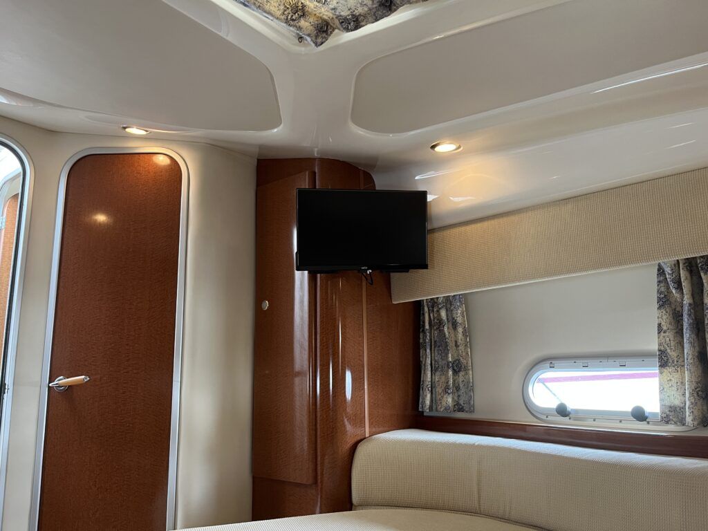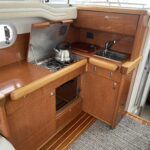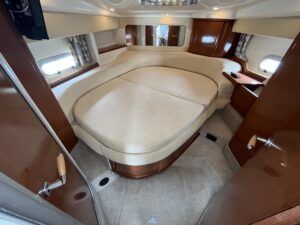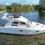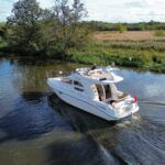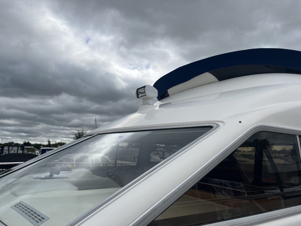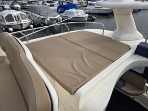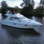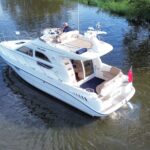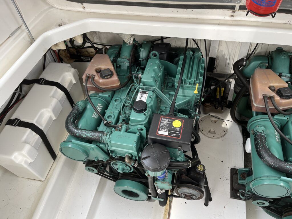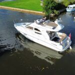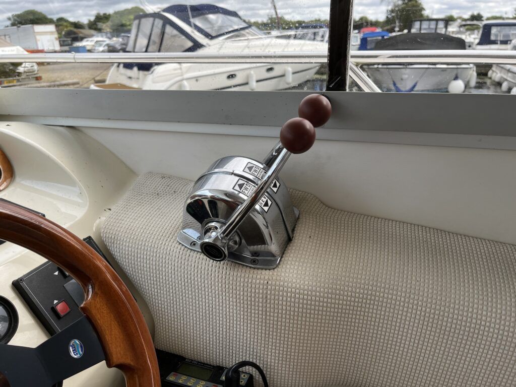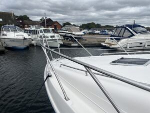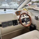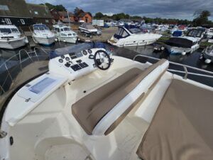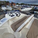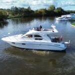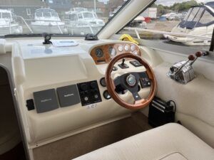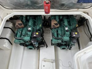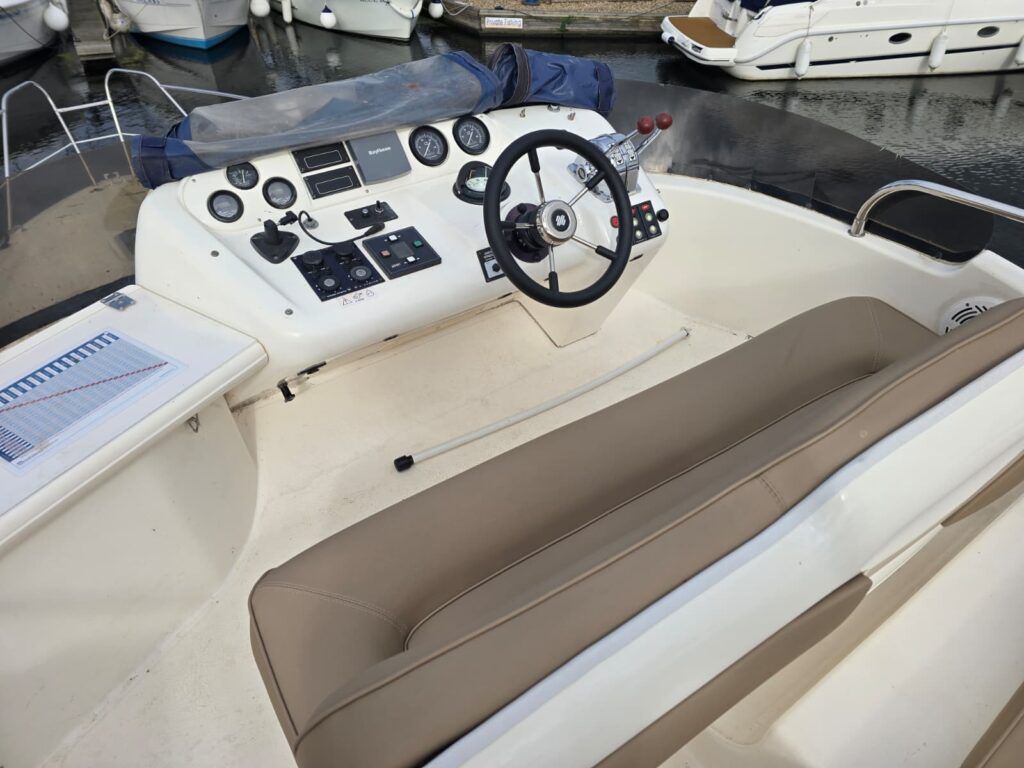 Sealine F33 – 2001 – 2x Volvo AD31P 150hp diesel engines through sterndrives. 6 berth accommodation over two cabins and saloon with a toilet and shower. Specification includes; bow thruster, warm air heating, trim tabs, battery charger, shore power, immersion, holding tank, VHF, Simrad plotter, speed & depth log, Teak laid bathing platform. Silvertex upholstery (2024). Engine and outdrive service 2024. BSC 2028. One of Sealine’s most popular flybridge models, perfect for both coastal and inland cruising.