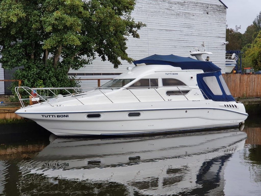 SEALINE F33 – 2001 – Powered by twin Volvo AD31P 150hp diesels through sterndrives – 4 berth accommodation with toilet and shower. Specfication to include; holding tank, electric windlass with deck controls, bowthruster, Eberspacher warm air heating, trim tabs, shore power with 240v sockets and immersion, VHF, GPS and more. Engine service 2019. Teak laid bathing platform. A very tidy example of these popular family flybridge cruisers!