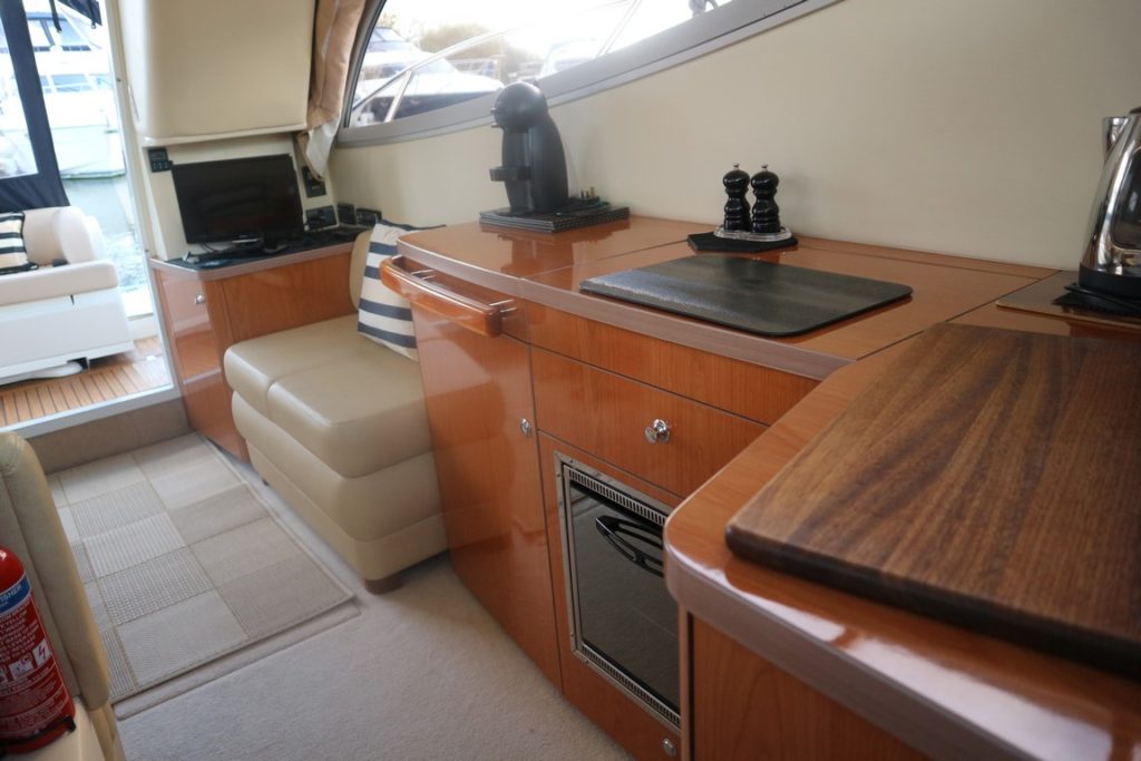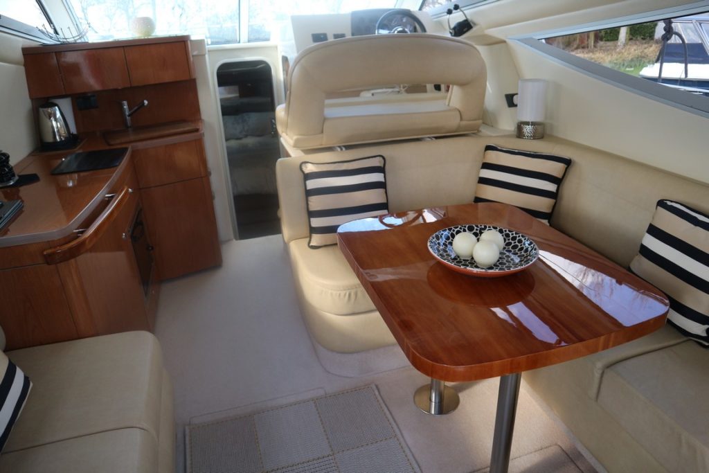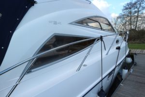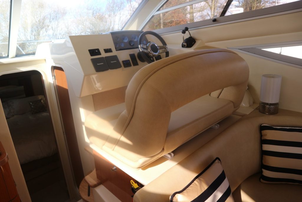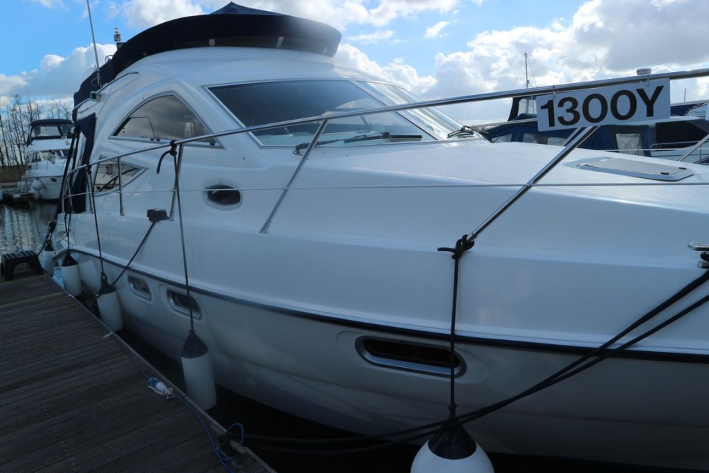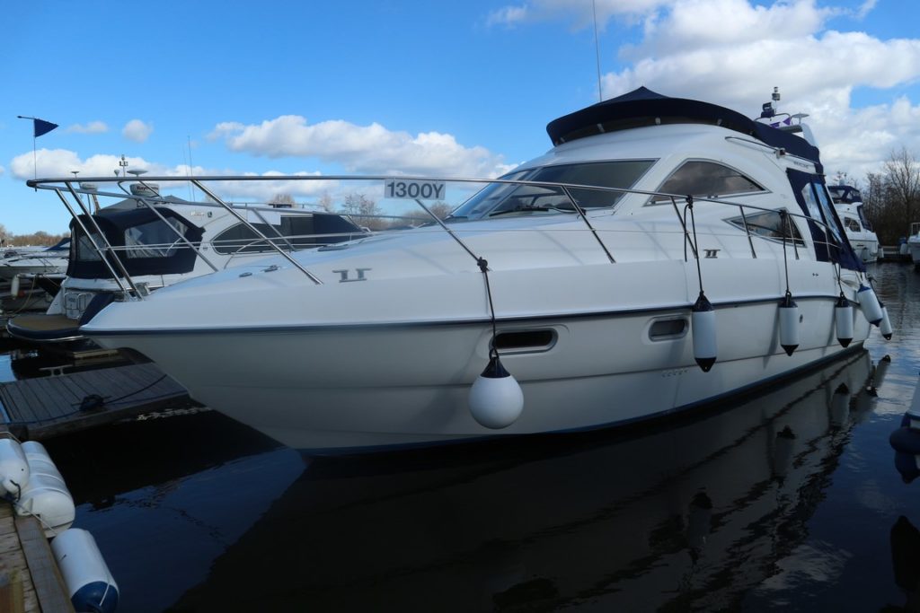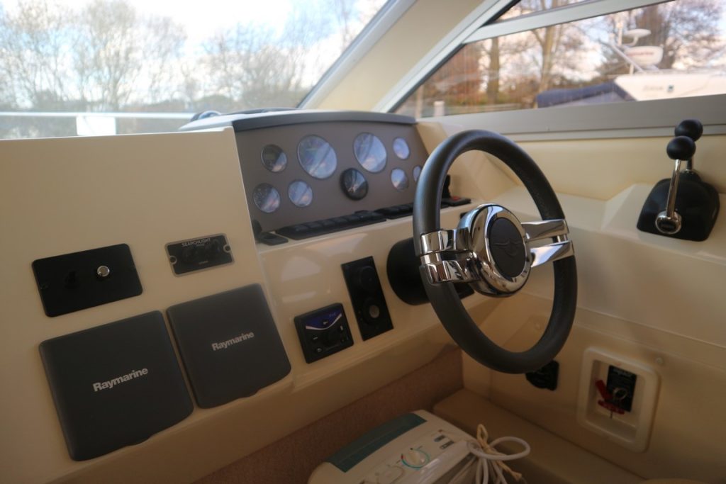 SEALINE F34 – 2008 – Powered by twin Volvo D4 225hp diesels. 6 berth accommodation with one toilet and one shower. Specification to include; bowthruster, warm air heating, holding tank, electric windlass, trim tabs and much more. Clever Sealine features including extending cockpit and galley. Folding radar arch for improved inland access, teak laid bathing platform and cockpit! BSC 06/21. Sterndrive service 2018. A simply stunning example, clearly well-kept and loved by her very diligent owners! Viewing highly recommended!
