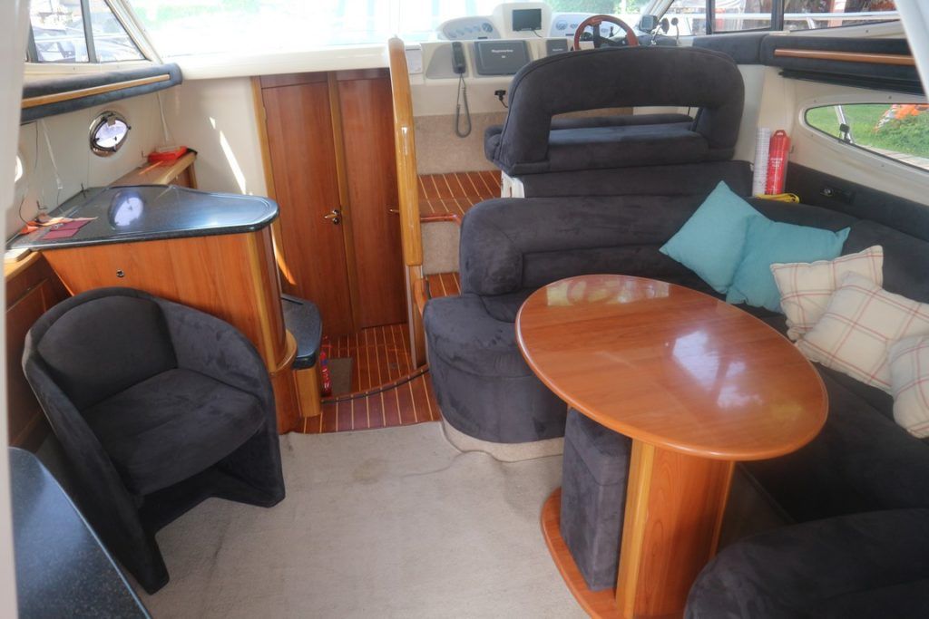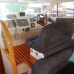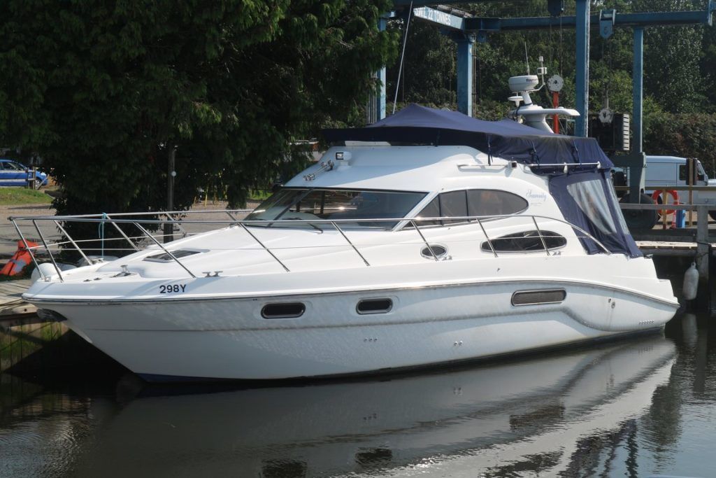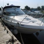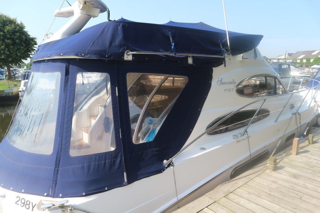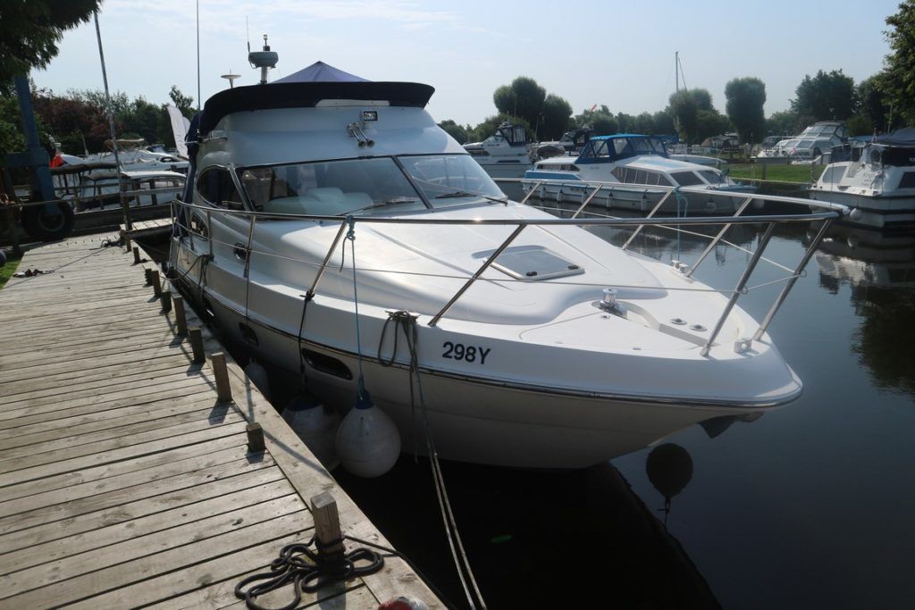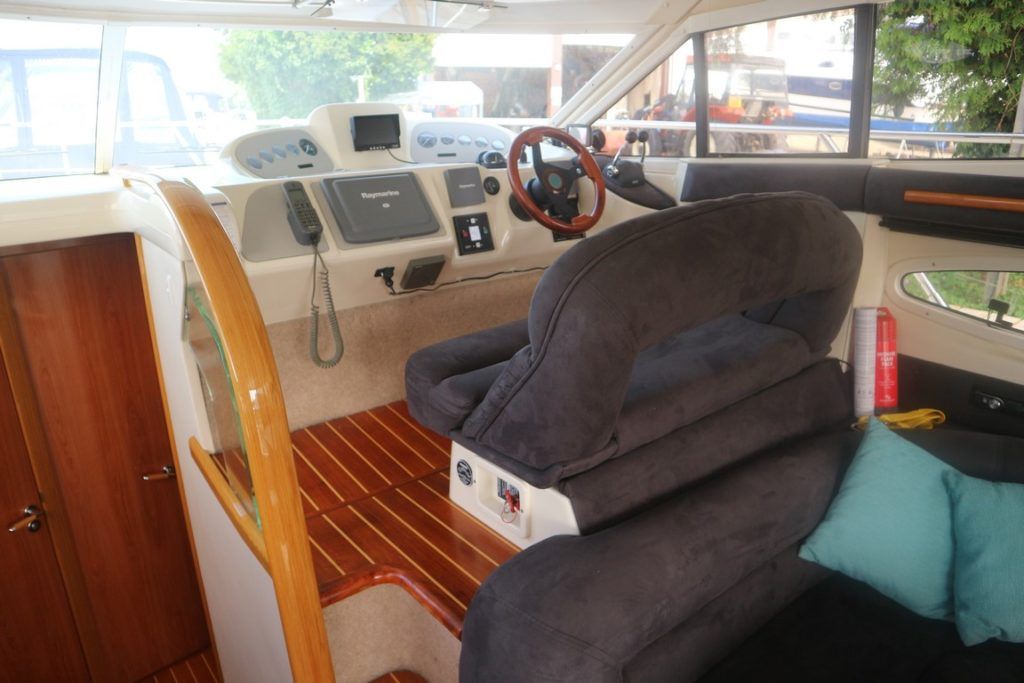 SEALINE F37 – 2002 (commisioned 2003) – Powered by twin Volvo KAMD300 285hp diesels with EDC controls on shafts. 6 berth accommodation with one toilet and one shower. Specification to include; Bowthruster, warm air heating, electric windlass (deck and helm controls), a range of Raymarine navigation equipment, trim tabs and shore power with battery charger. Teak laid flybridge cockpit and bathing platform. BSC 03/23 and full engine service June 2018. Used to cruise the Broads and East Coast since 2015. The F37 offers plenty of style and comfort, a very capable cruiser ideal for offshore boating with the family!