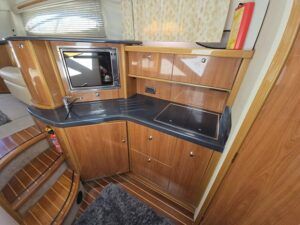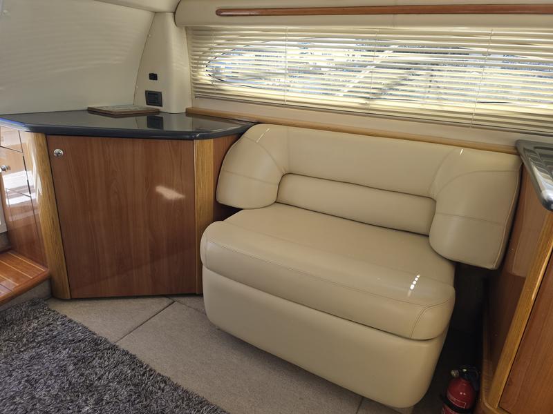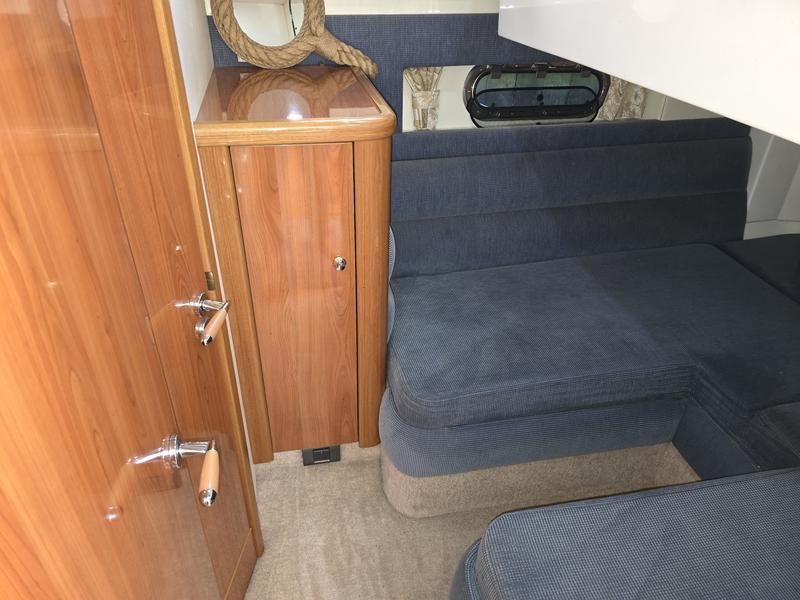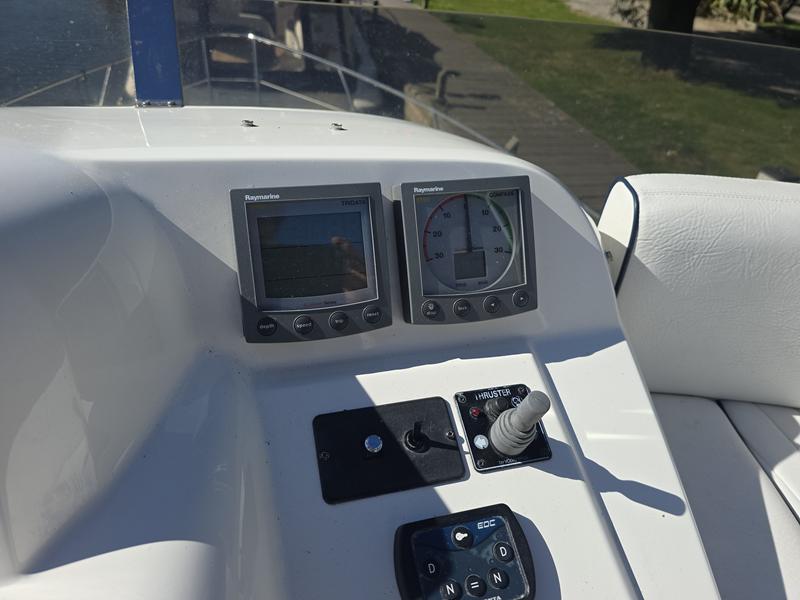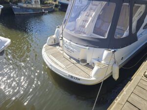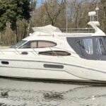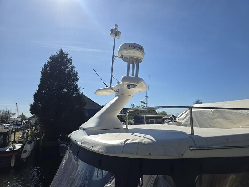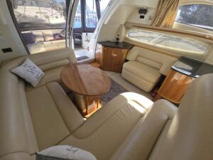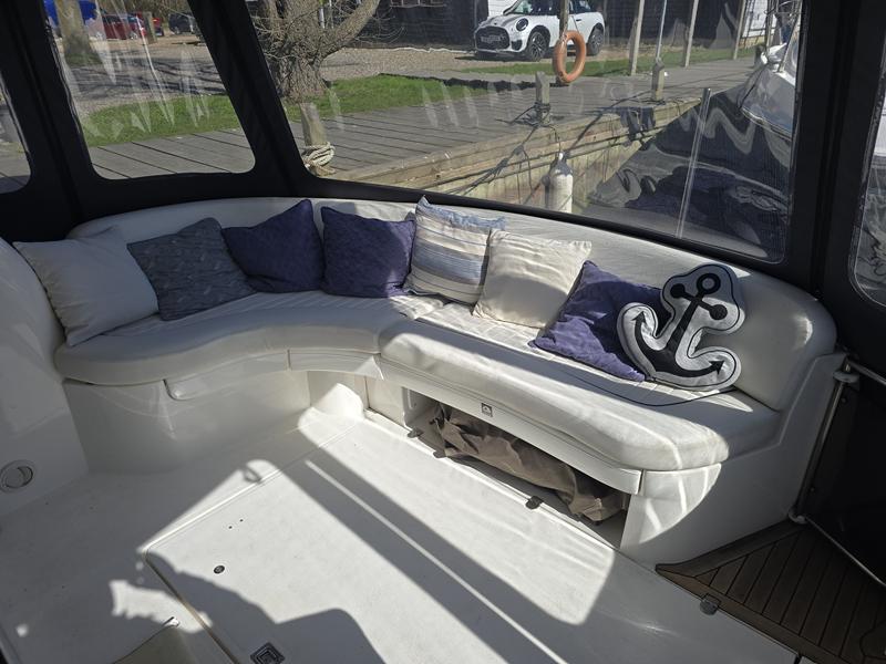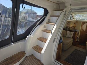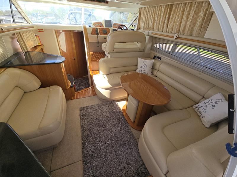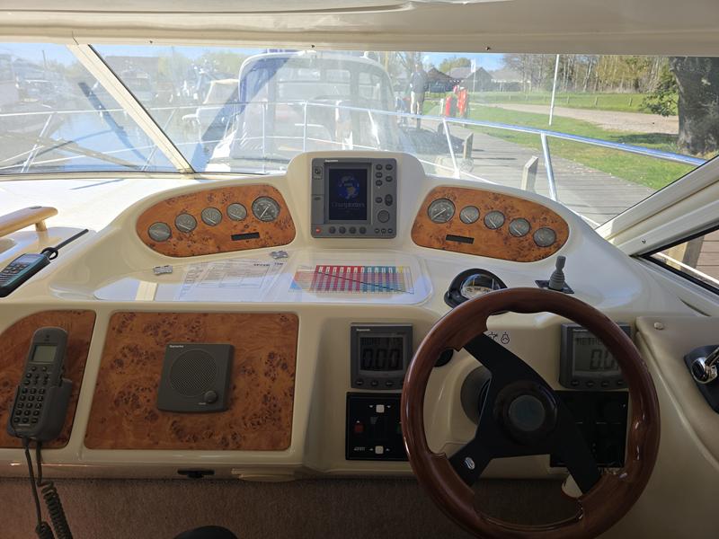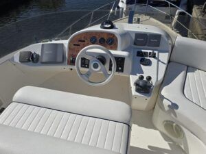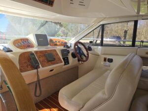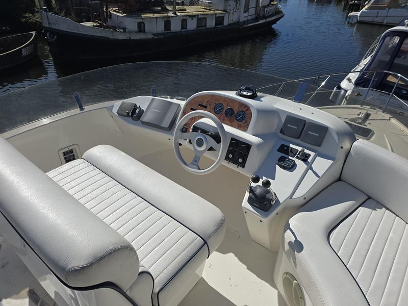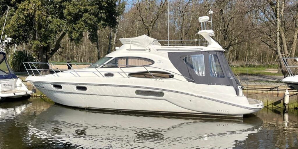 Sealine F37 – 2003 – 2x Volvo KAMD300/P EDC shaft driven diesel engines. 6 berth accommodation including a spacious forward master cabin with a double berth and en-suite. Specification to include: Warm air heating, Bow thruster, shore power, battery charger, trim tabs, teak deck, Raymarine nav package including chart plotter, radar VHF and more. A popular mid-sized flybridge cruiser, offering a comfortable layout for family cruising, fantastic social space, and the benefit of twin diesels on shafts.