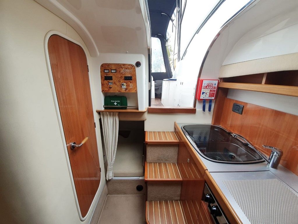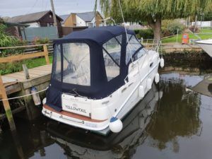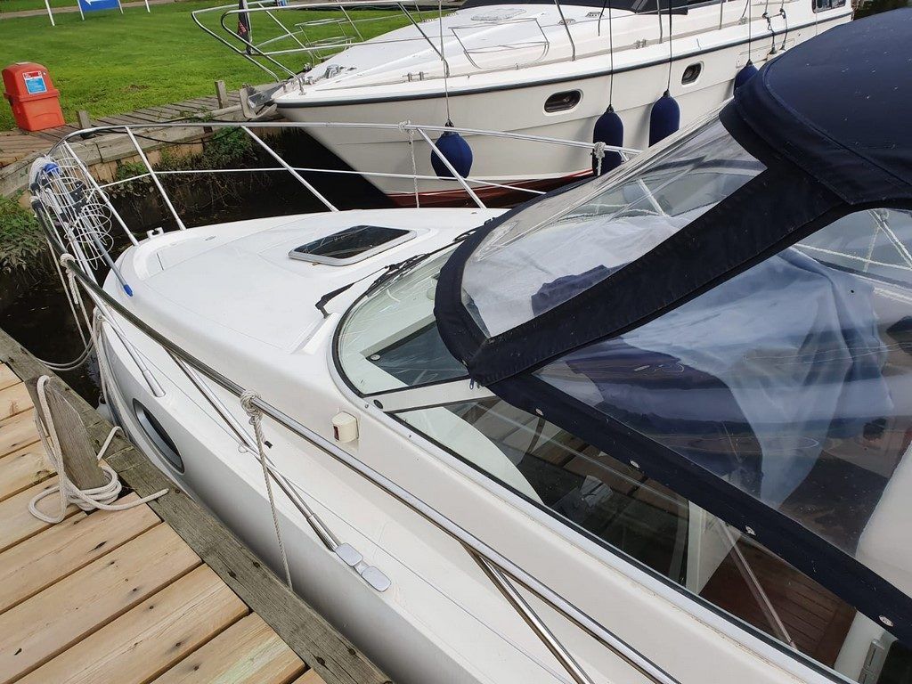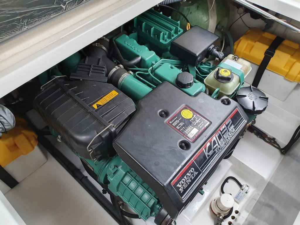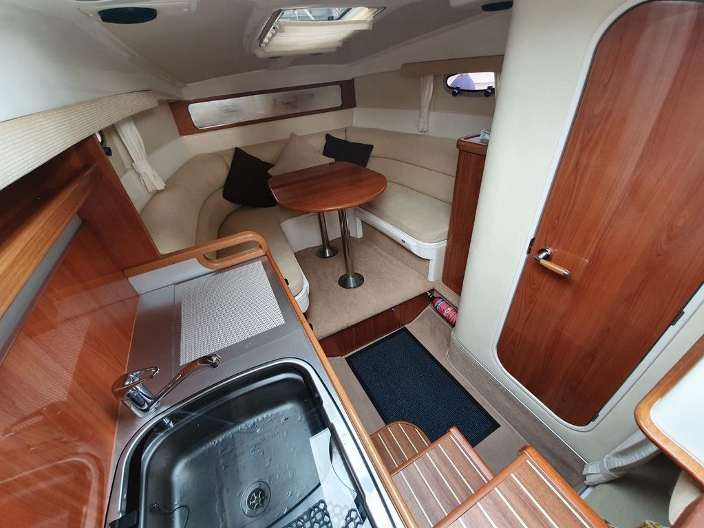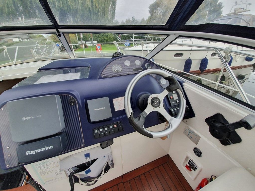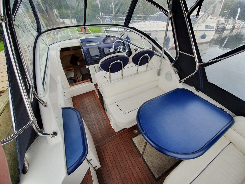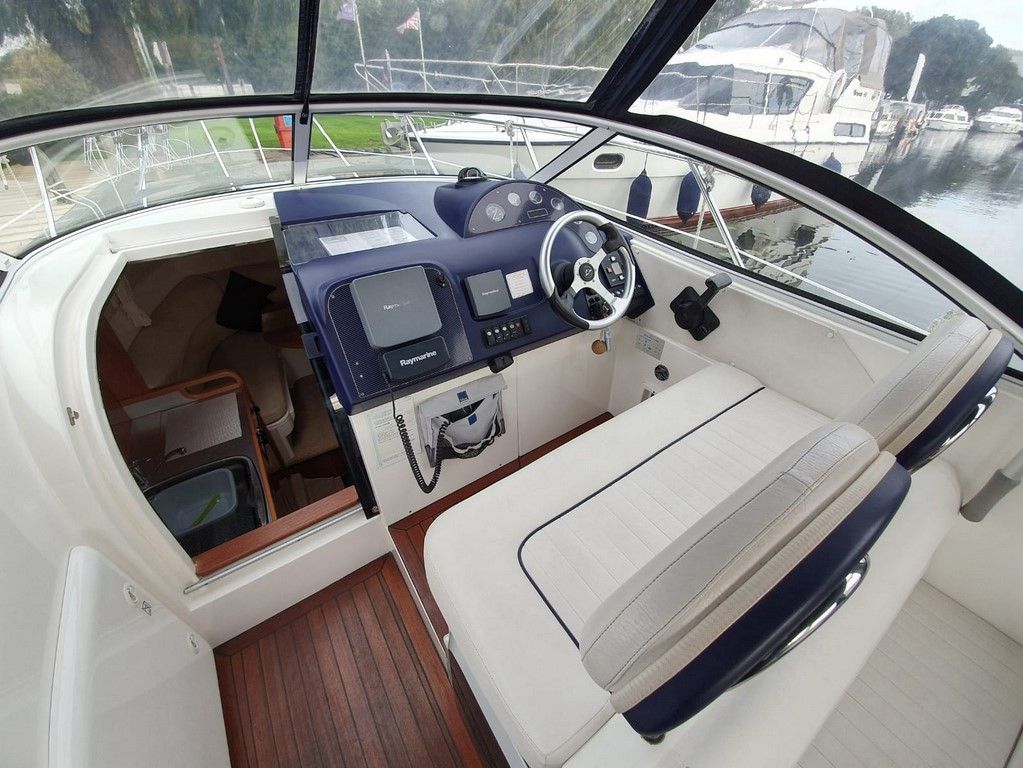 SEALINE S23 – 2004 – Powered by a single Volvo KAD32 170hp diesel. 4 berth accommodation with toilet and shower. Specification to include; Webasto warm air heating, trim tabs, electric windlass, a range of navigation equipment including Raymarine VHF and plotter and shore power supply with battery charger. Teak laid cockpit and bathing platform. Folding radar arch for increased inland access. Engine and drive service 2019. Antifouled and polished 2019. A lovely example, clearly very well kept by her current owner and presented in very good order!