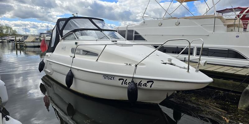 Sealine 240 – 1992 – Powered by a Volvo KAD32P 170hp diesel engine (2001). 4 berth accommodation with a toilet and shower compartment. Specification to include, electric windlass, warm air heating, trim tabs and shore power supply with battery charger and immersion, Garmin GPS, Fish finder, VHF and low air draft for greater inland access. New interior upholstery and carpets. A stylish, compact river cruiser featuring a sociable cockpit perfect for entertaining, and equipped with a more modern KAD 32 diesel.