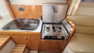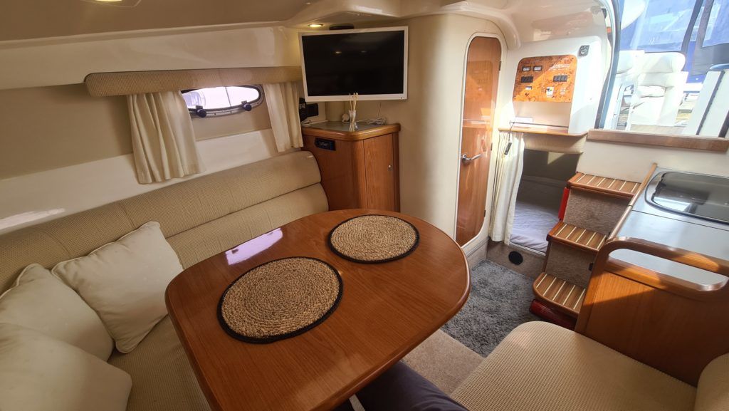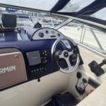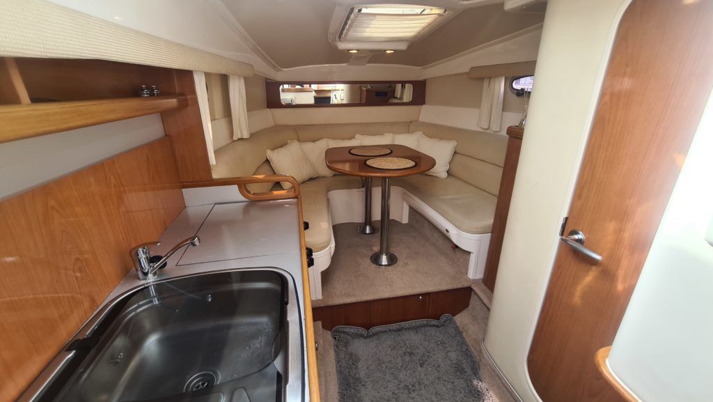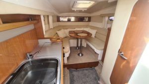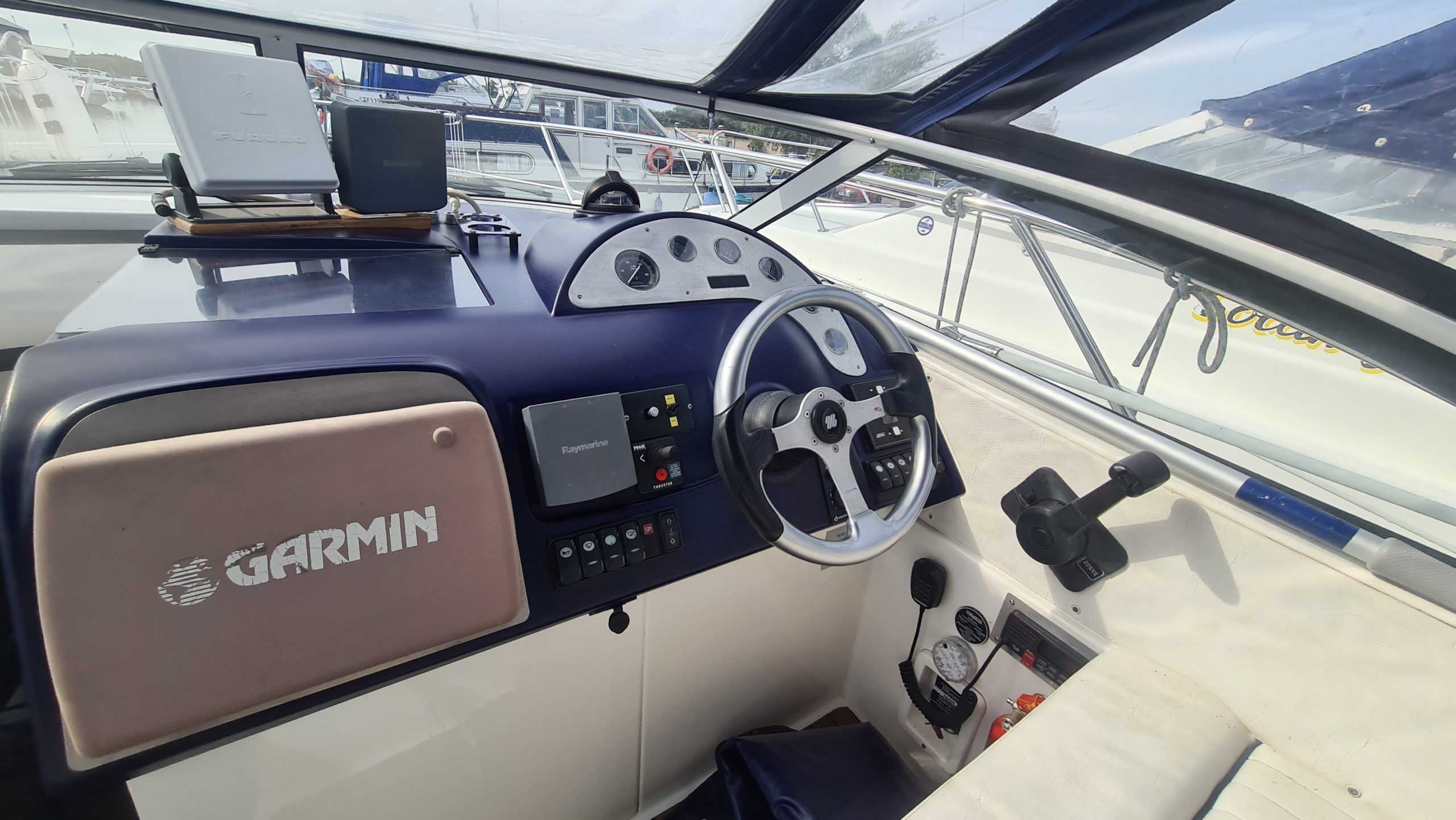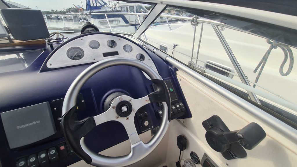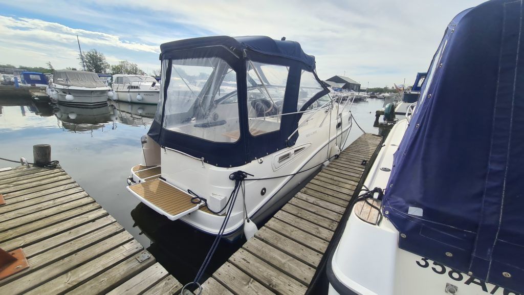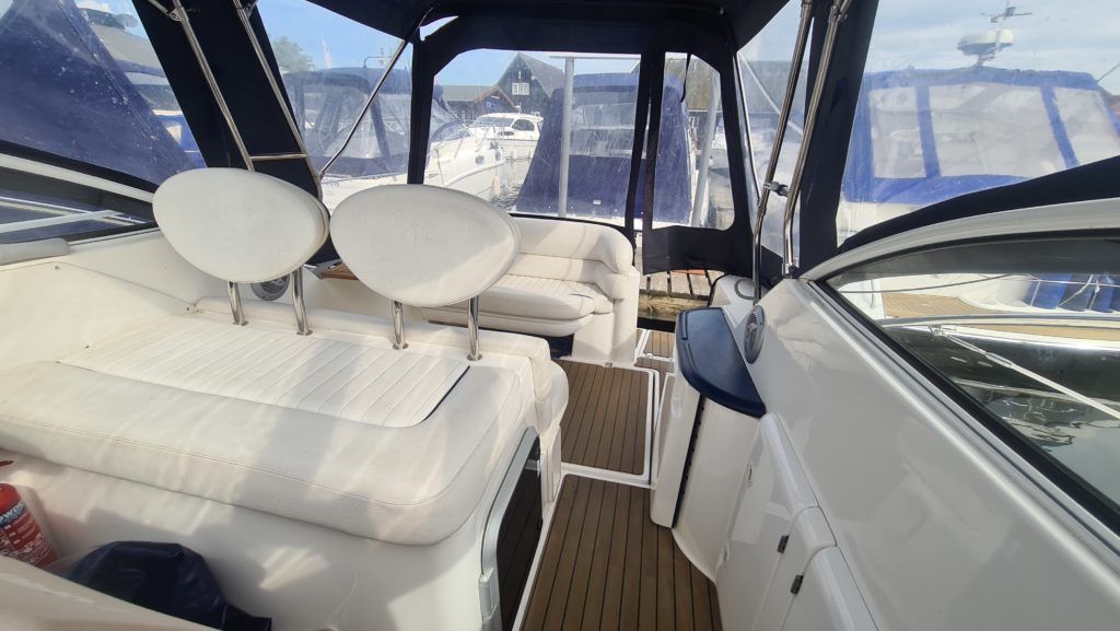 Sealine S25 – 2004 – Powered by a single Volvo KAD32 170hp diesel engine. 4 berth accommodation with one toilet and one shower. Galley with 2 burner hob, grill, sink & fridge. Specification including bow thruster, warm air heating, a host of navigation equipment including radar, shore power, battery charger, immersion heater, synthetic teak decking sea toilet . A lightly used sports cruiser presented in good overall condition. Folding arch to allow for a low air draft and great access on the inland waterways.