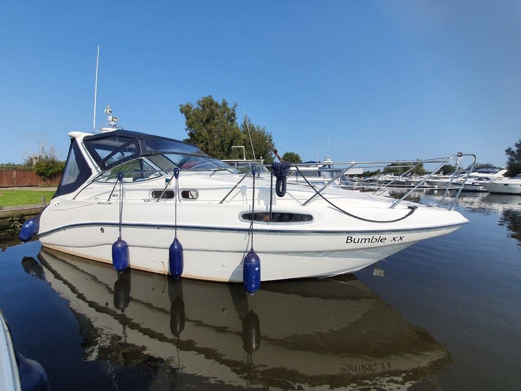 SEALINE S28 – 2001 – Powered by twin Volvo KAD32 diesels through sterndrives – 4 berth accommodation with toilet and shower – Specification to include; Sidepower bowthruster, holding tank, Eberspacher warm air heating, shore power with 240v supply and immersion, trim tabs, electric windlass, Raymarine RL70, Icom VHF and more. Engine and sterndrive service Dec 2019. New batteries 2020. Antifouled 2019. A well specified example of these ever popular Sealine cruisers, presented in very good order!